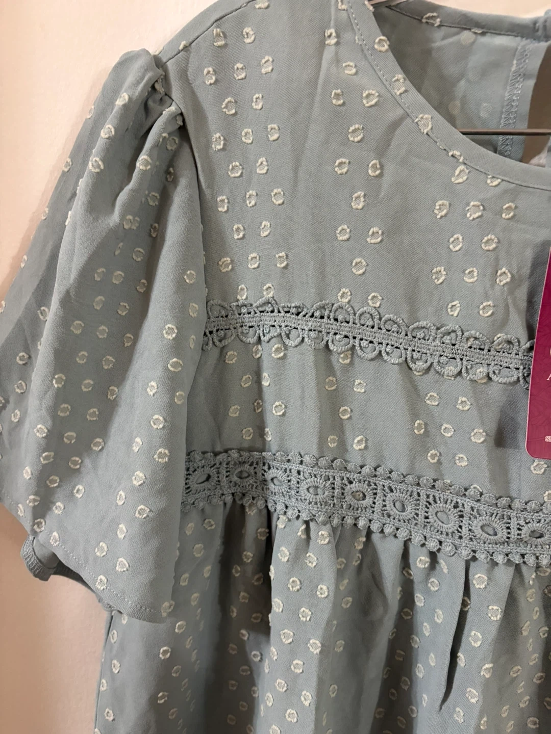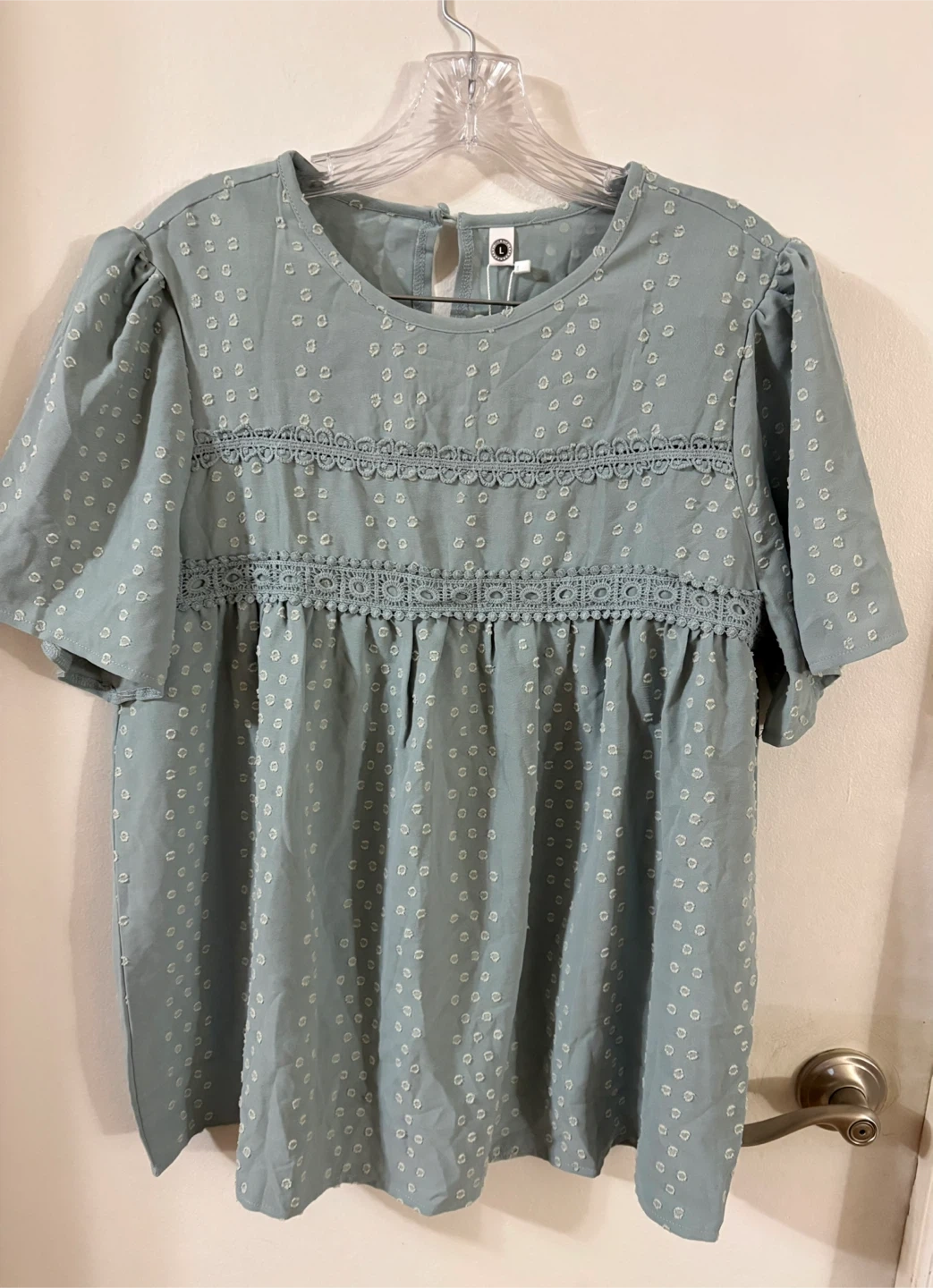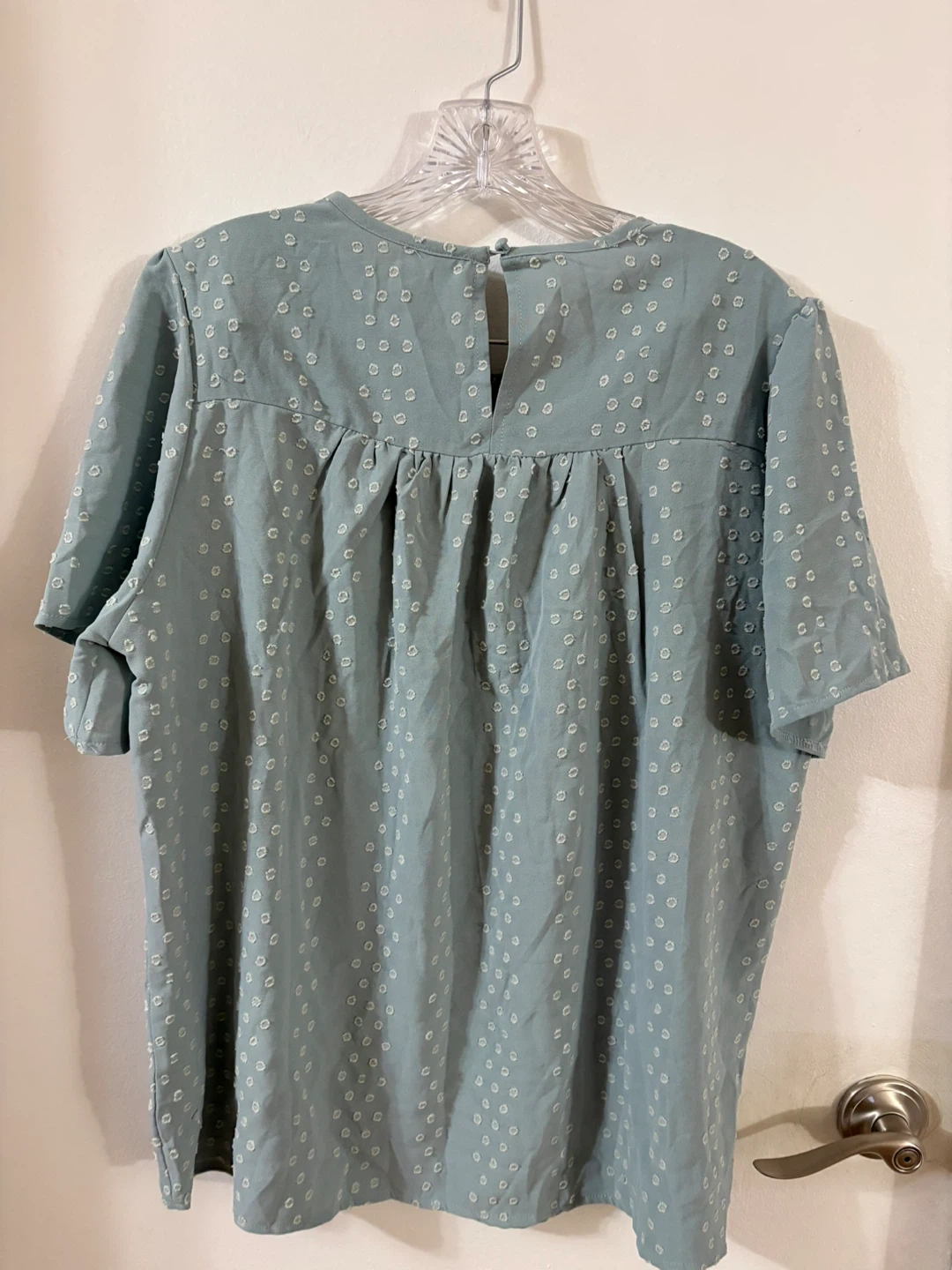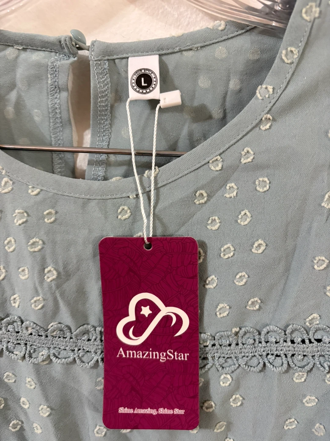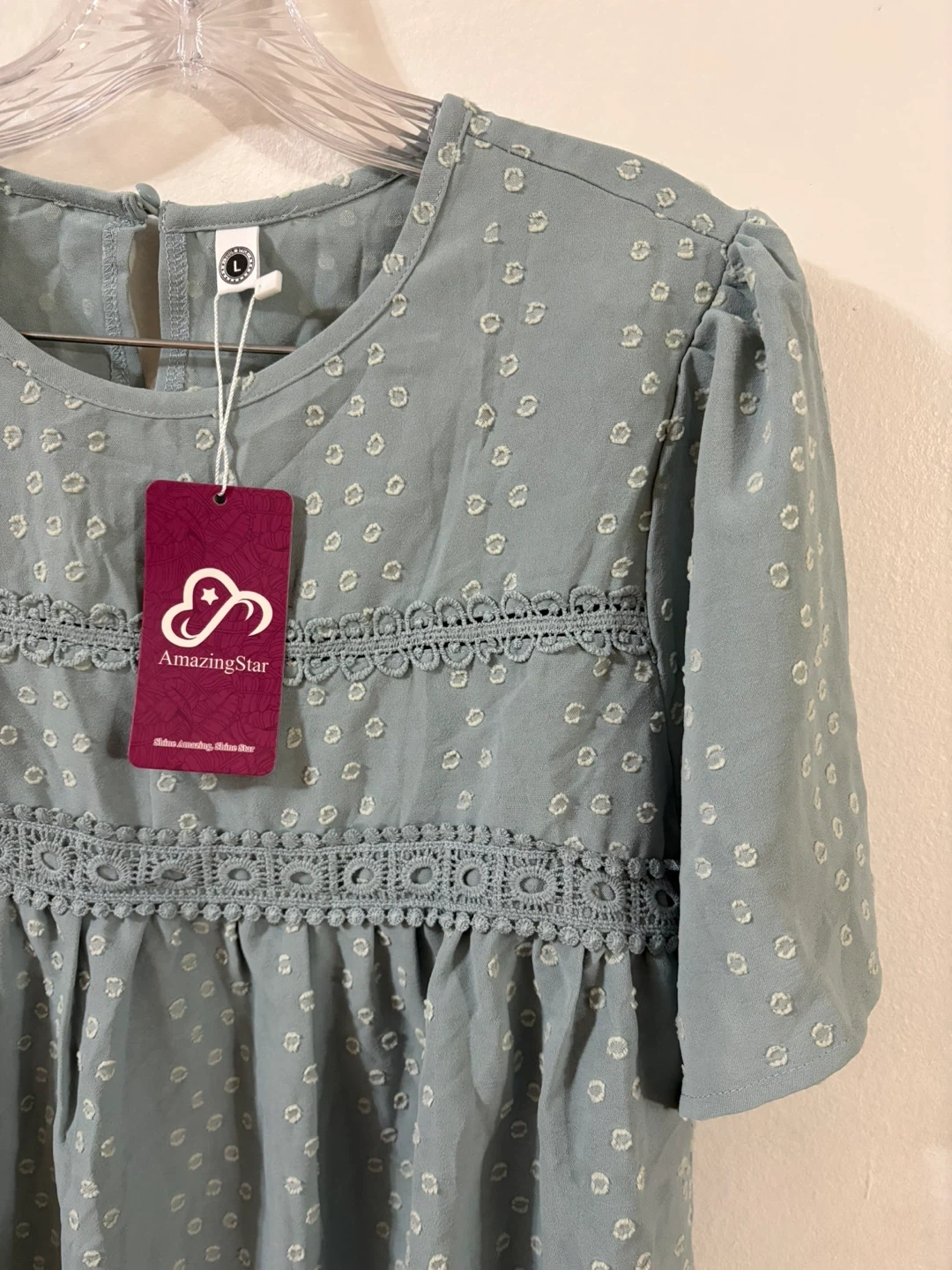 Selling a cute AmazingStar blouse in a size large! It's a lovely light blue color with a unique dotted pattern. Perfect for a casual day out or dressing up for a special occasion! The blouse has short sleeves and a comfortable fit