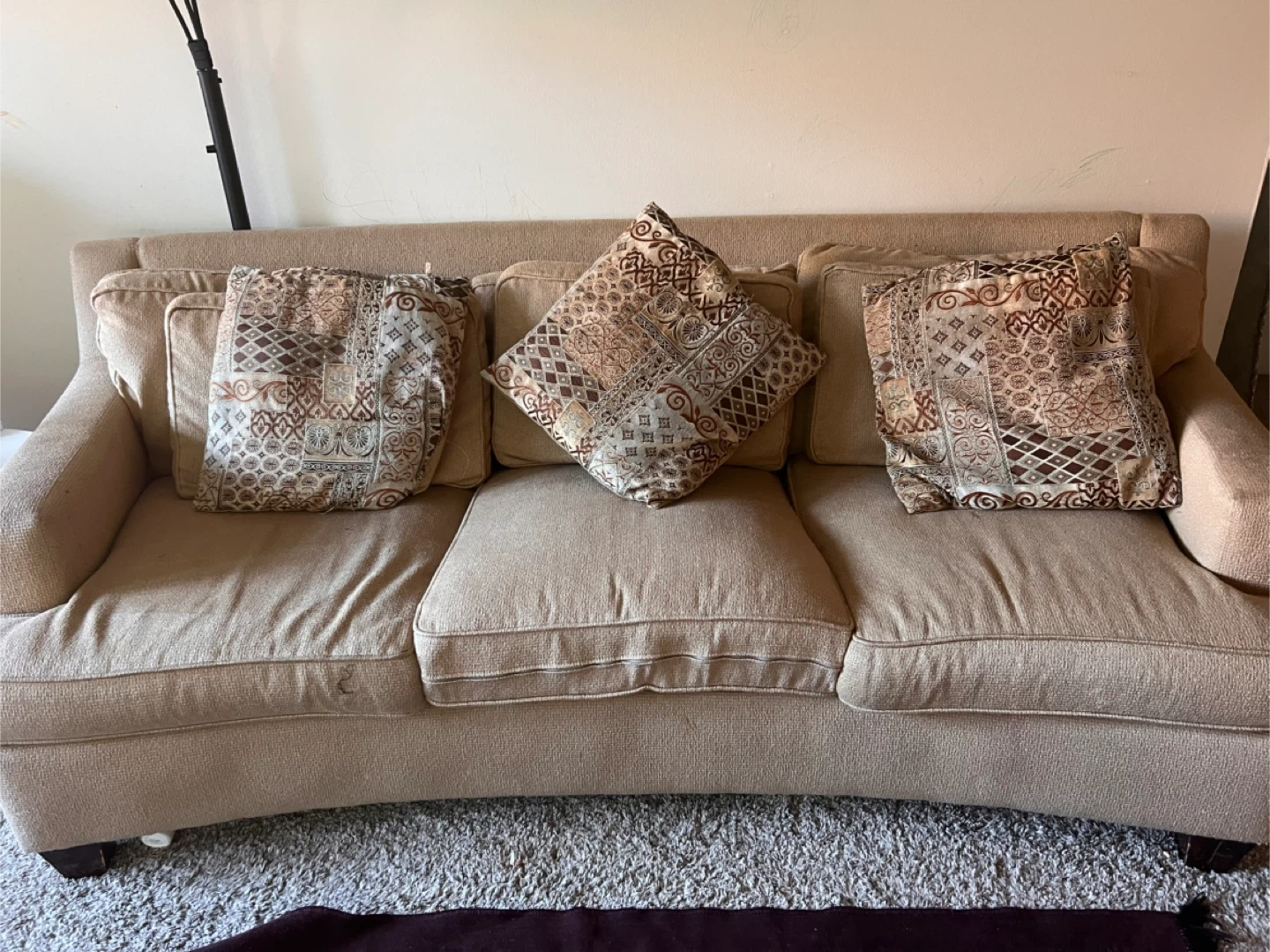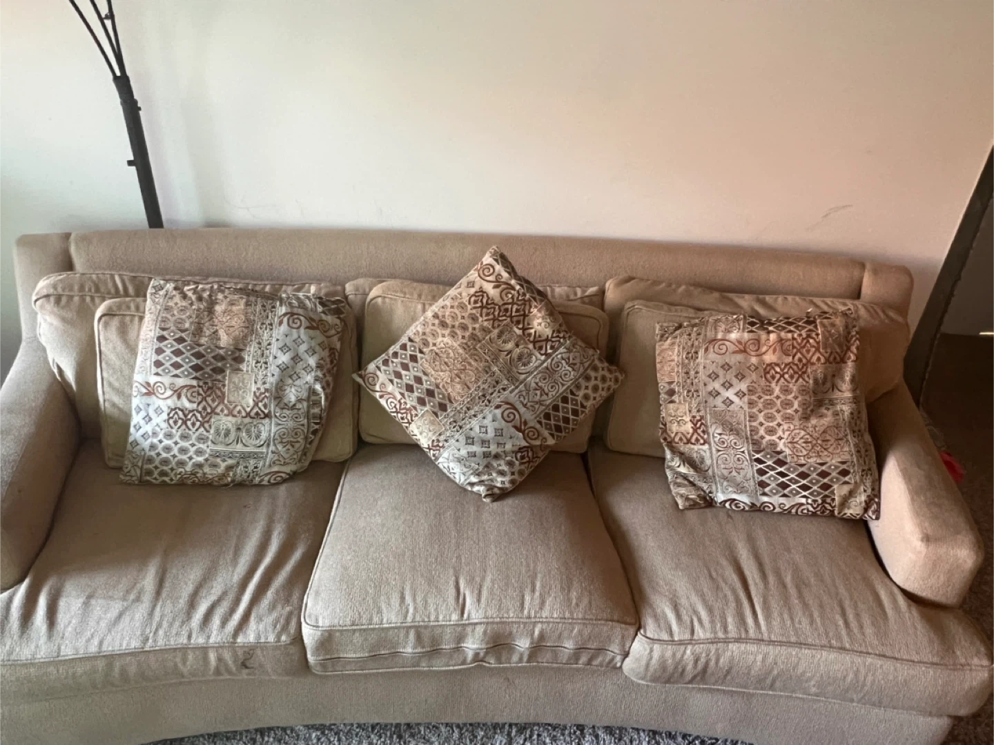 Selling a comfy tan sofa that's perfect for any living room! It comes with three decorative pillows to complete the look. This sofa is in good condition and ready for a new home.