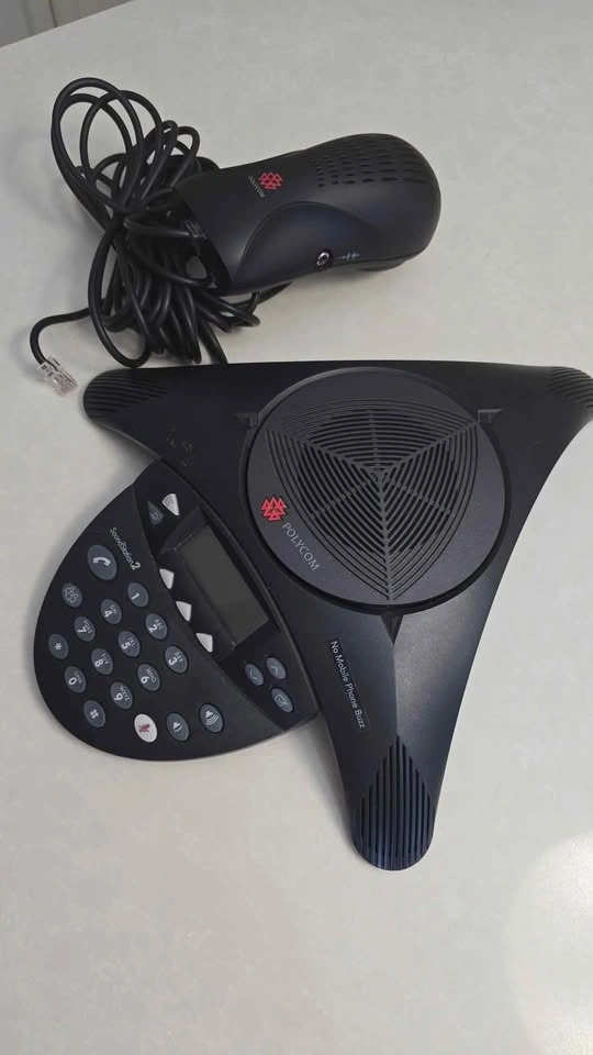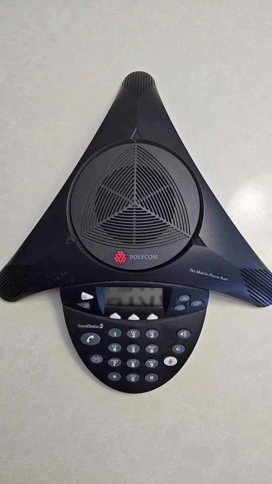 This device features full duplex acoustic clarity, three cardioid microphones with a 10-foot range, adjustable volume with noise reduction, caller ID, a backlit LCD, customizable ringtones, and a 12-key keypad with mute and volume controls. No mobile phone buz.