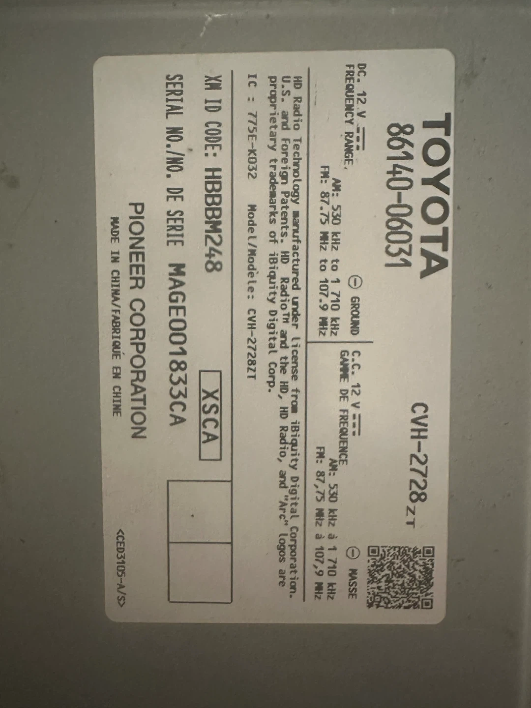 Selling a Toyota Pioneer car radio, model CVH-2728ZT. It's in good condition and ready to be installed in your vehicle. This unit supports both AM and FM frequencies.