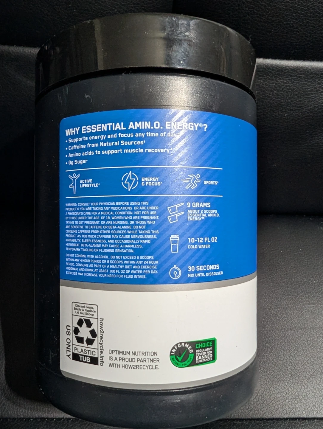 Selling a tub of Optimum Nutrition Essential Amino Energy in Blue Raspberry flavor! It supports energy and focus any time of day, and contains caffeine from natural sources. It also has amino acids to support muscle recovery.