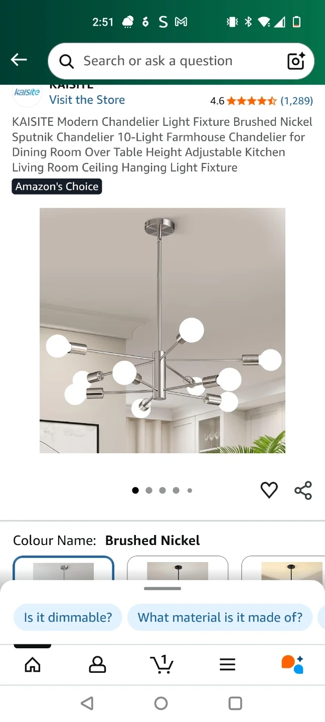 Selling a modern chandelier light fixture by KAISITE. This Sputnik-style chandelier features 10 lights and a brushed nickel finish. It's perfect for a dining room, kitchen, or living room. Adjustable height for versatile placement!