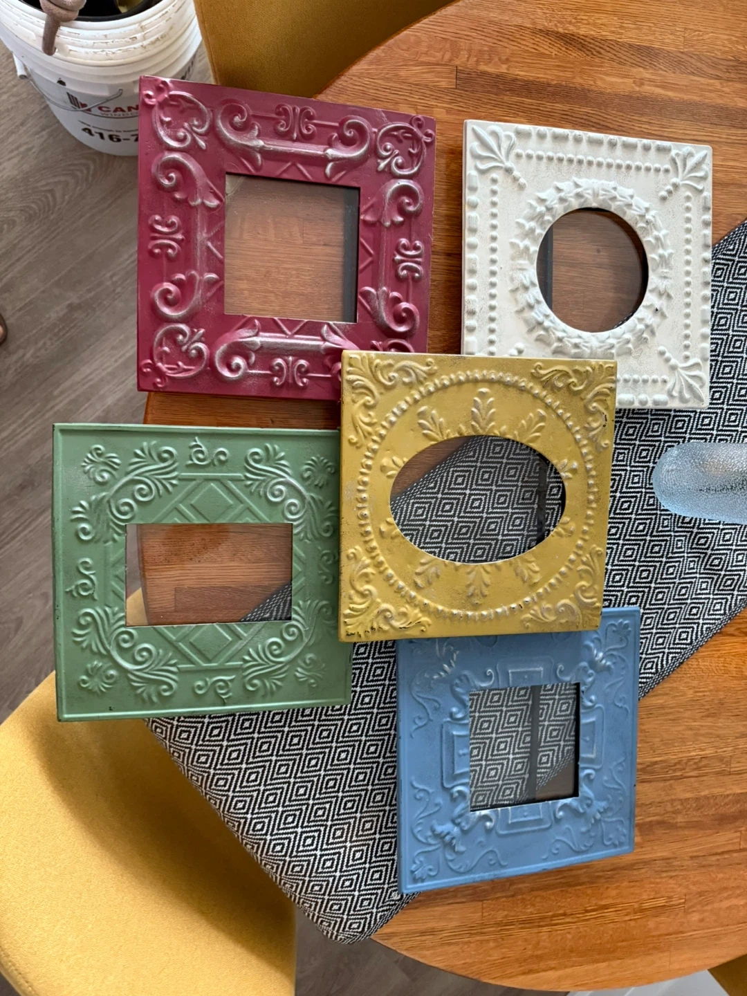 Selling a set of five decorative wall frames in different colours and designs. They are perfect for adding a unique touch to any room. Each frame has a distinct pattern and finish, making them a charming addition to your home decor