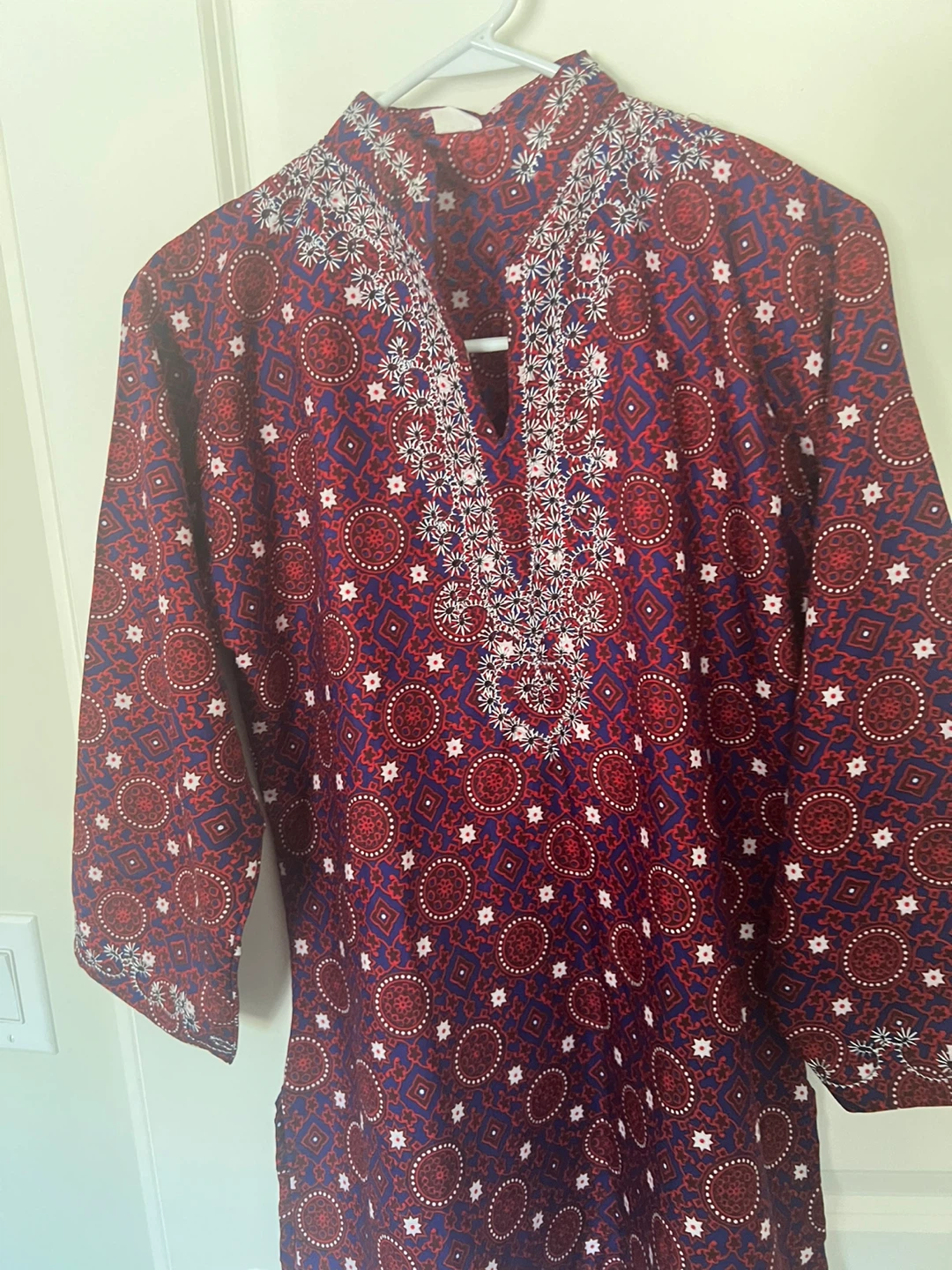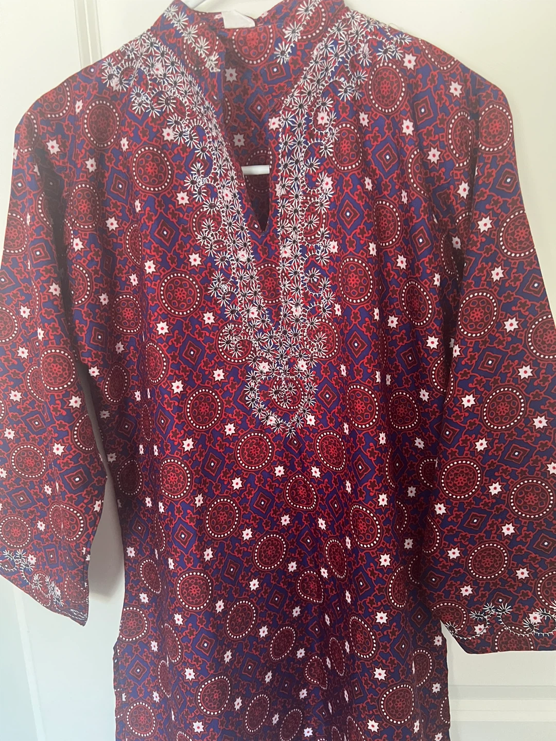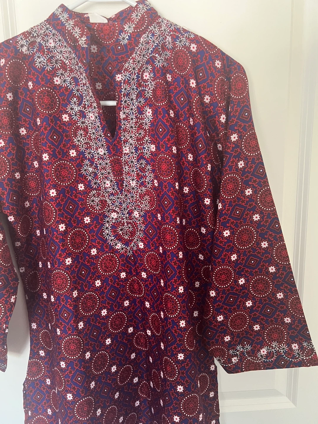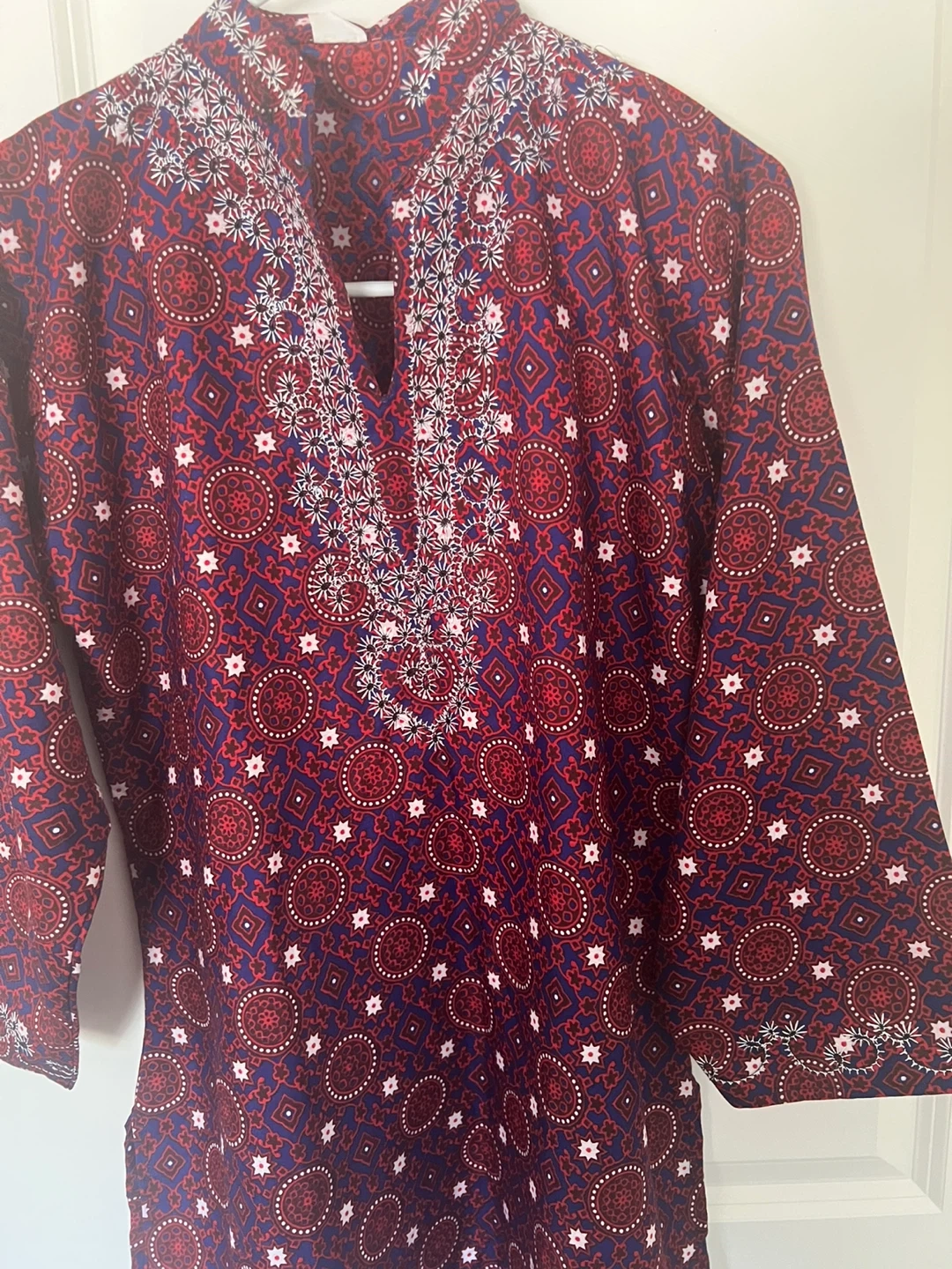 Here's a lovely tunic top with a unique pattern! It features a stylish design and comfortable fit. Perfect for adding a touch of flair to your wardrobe.