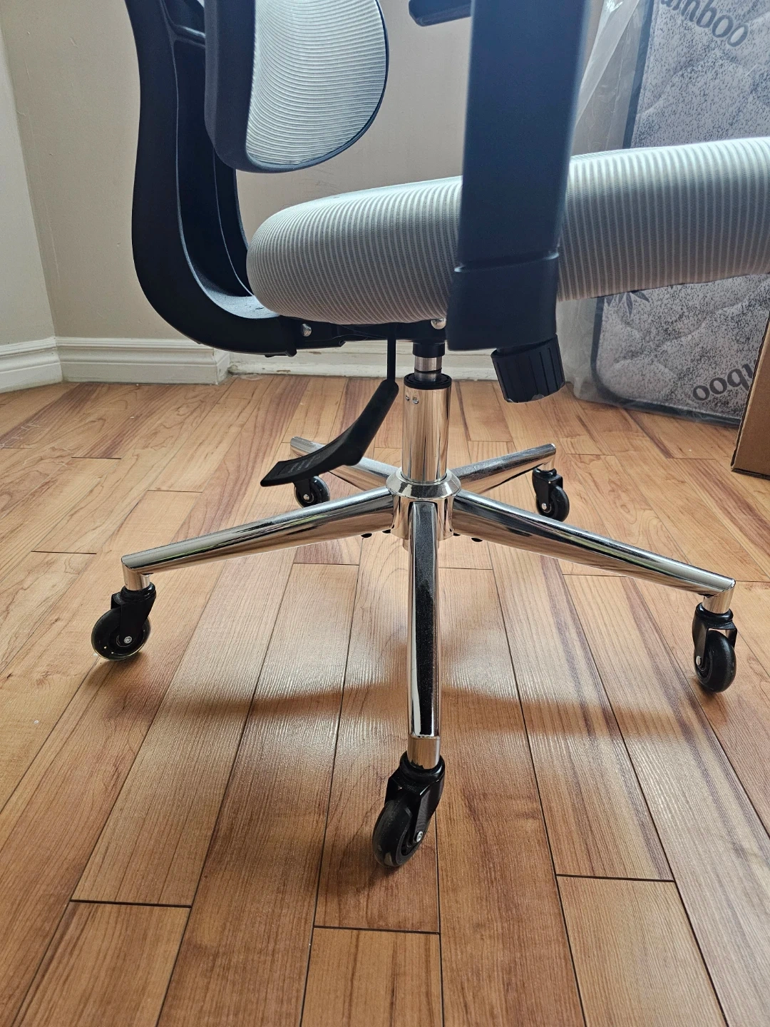 Selling a comfortable ergonomic office chair in great condition! It features a grey mesh back and seat, with black armrests and a headrest. The chair has a chrome base with wheels, making it easy to move around your workspace. Perfect for long hours of work or study!