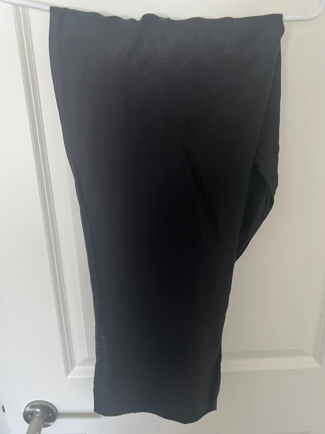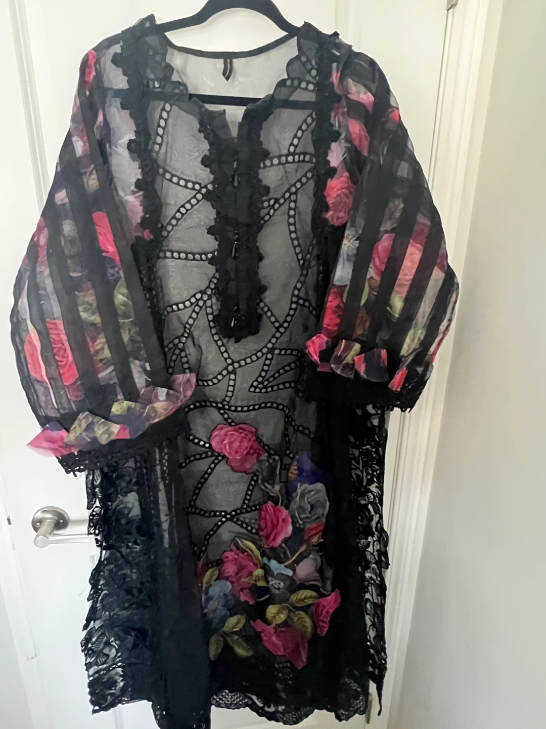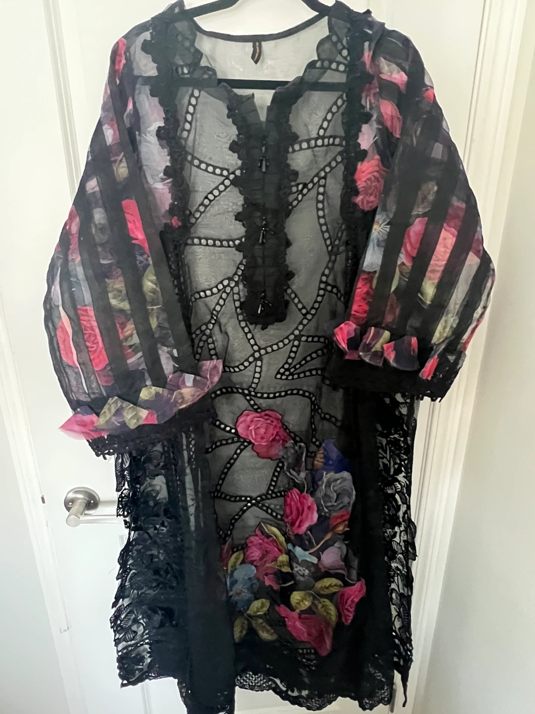 Selling a beautiful black dress and pants set. The dress has a unique floral design with sheer fabric and lace details. The pants are a matching black colour. Both pieces are in new condition and perfect for a special occasion or a night out!