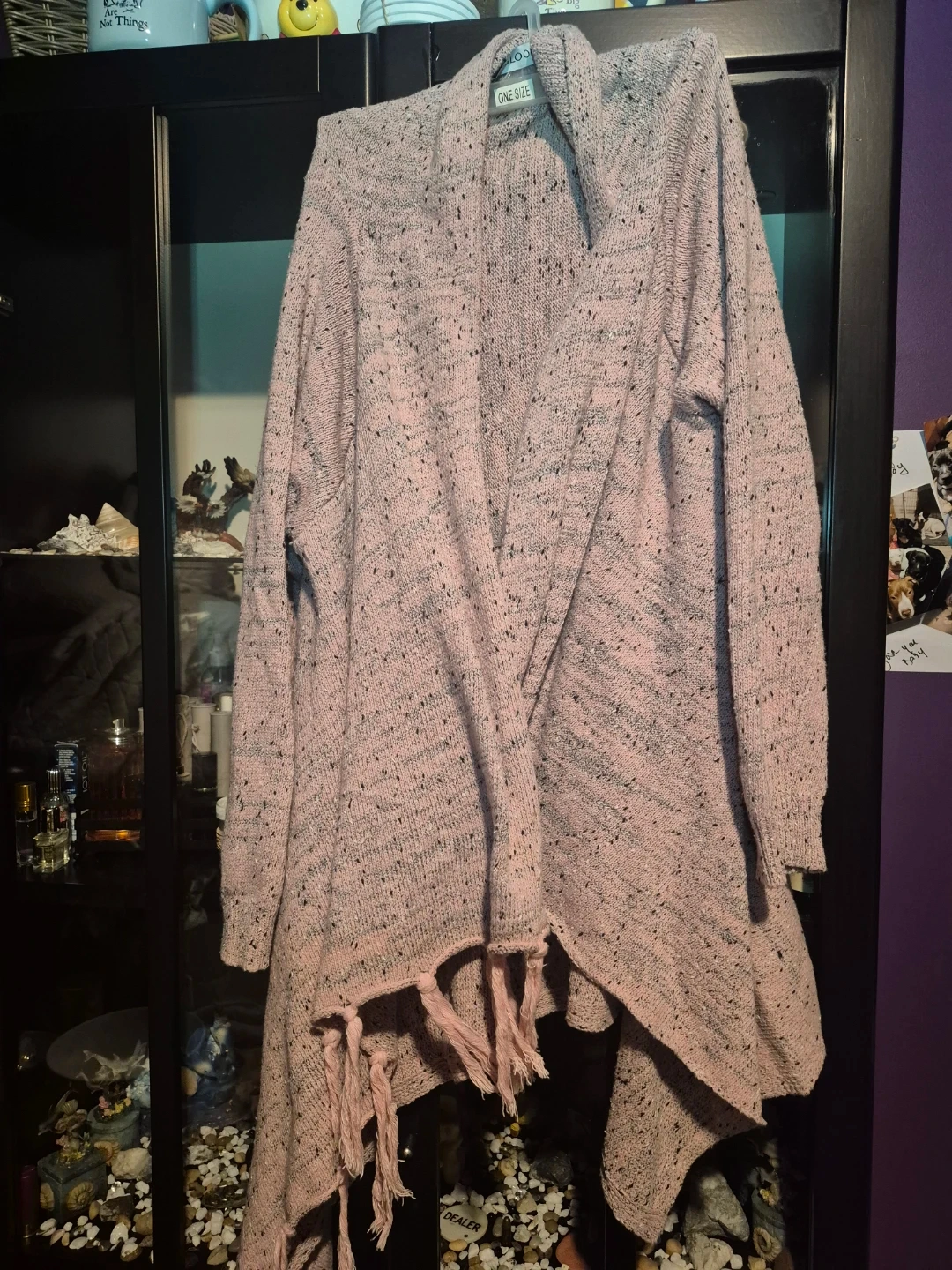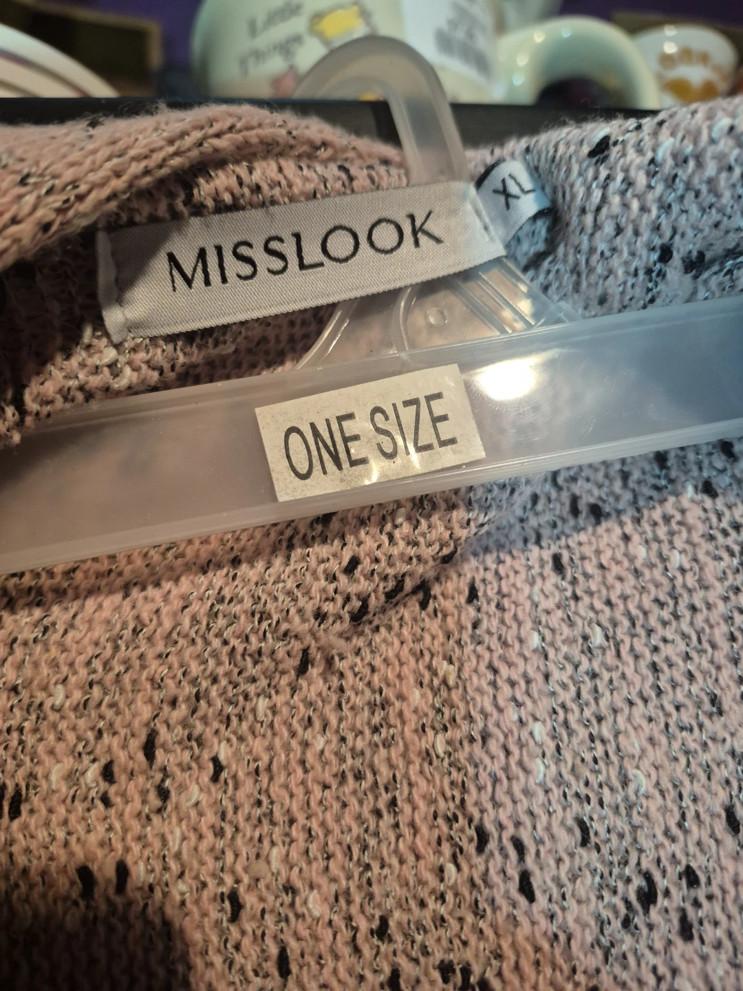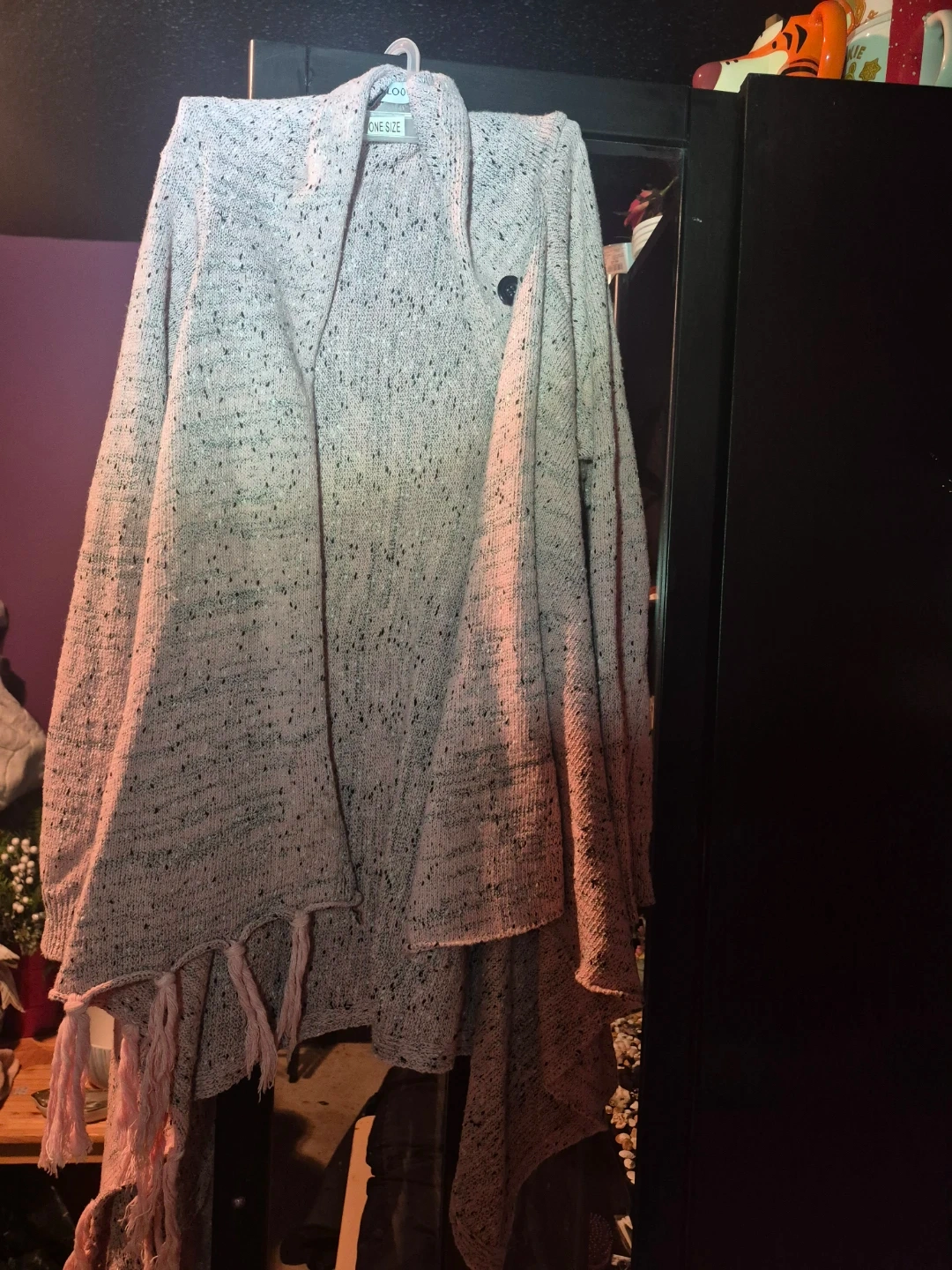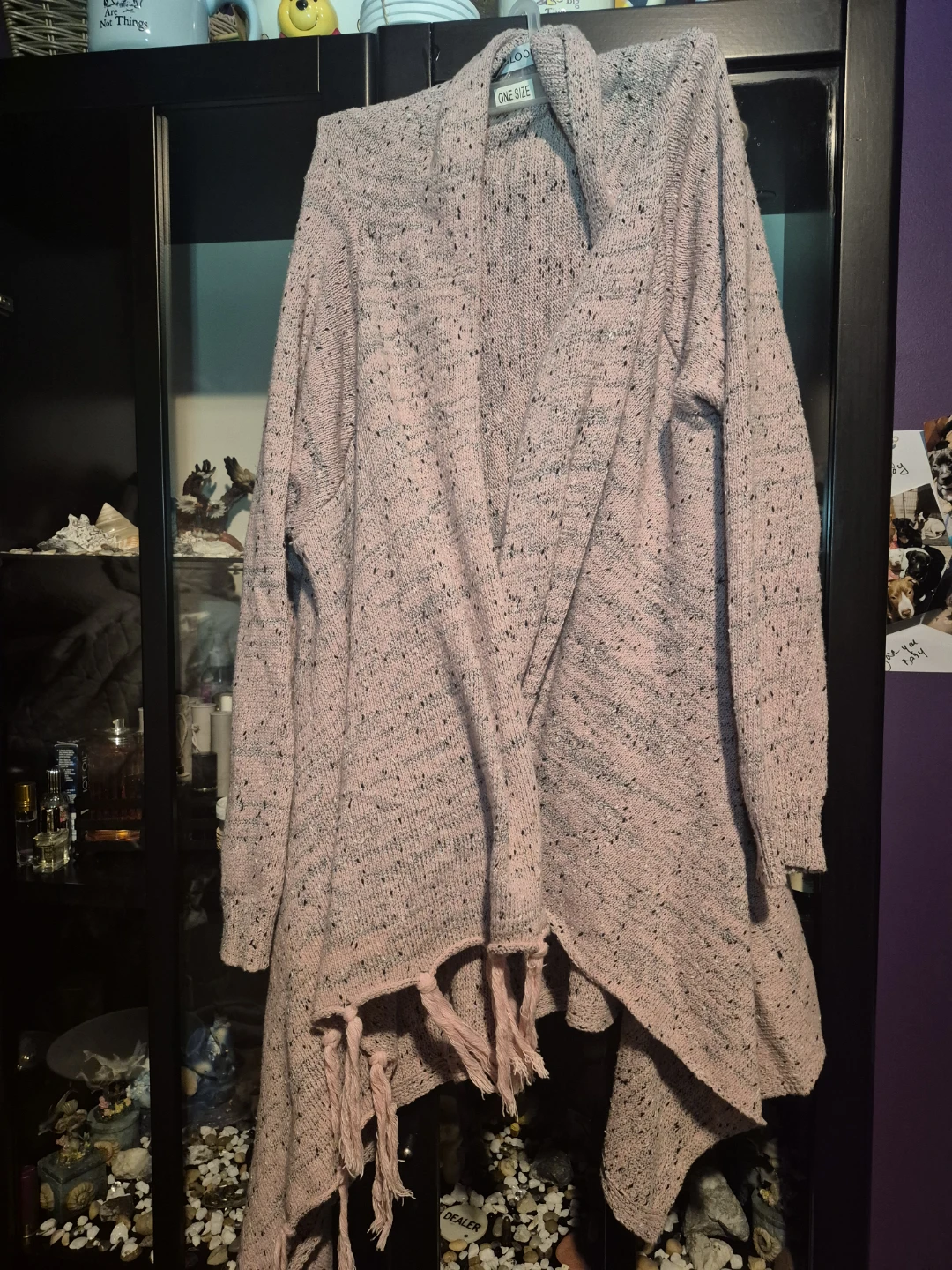 Selling a Misslook open-front cardigan in a lovely pink and grey knit. It's marked as one size and features stylish fringe detailing. Perfect for layering!