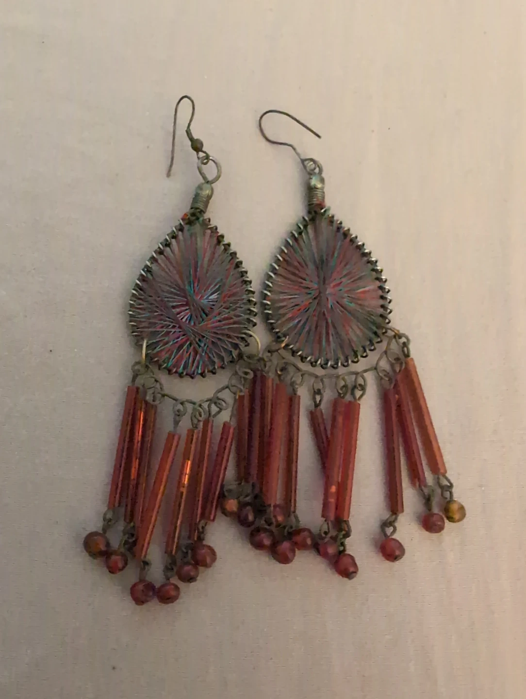 Here are some dangle earrings with a teardrop shape, featuring colourful thread detailing and beaded accents. They have a unique, bohemian-inspired look!