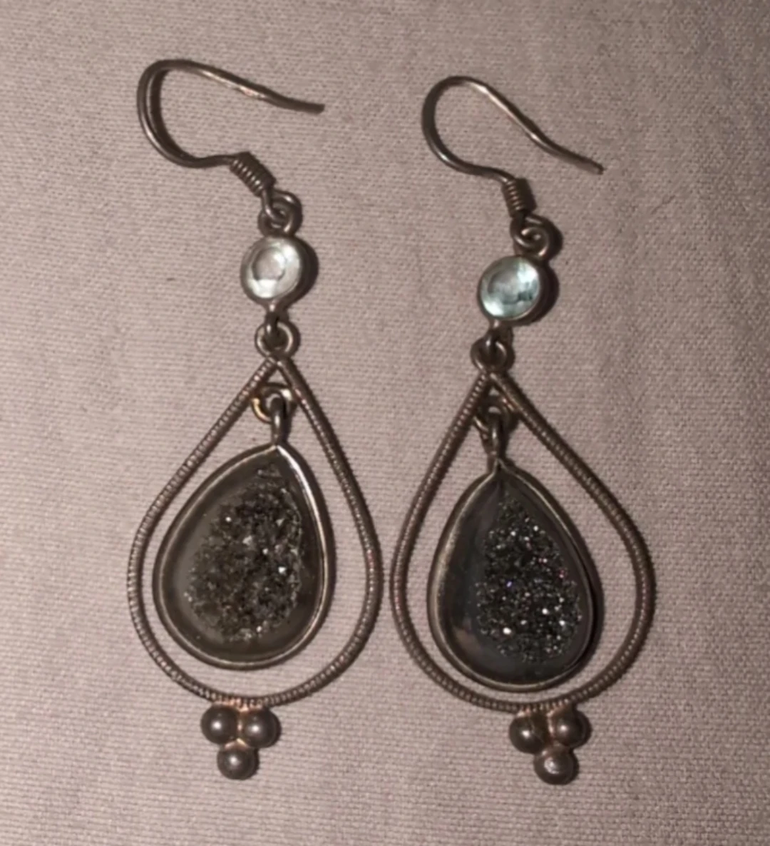 These are a pair of teardrop dangle earrings. They feature a druzy stone inside a teardrop shaped frame, with a small round stone above and three small beads at the bottom. They are in good condition!