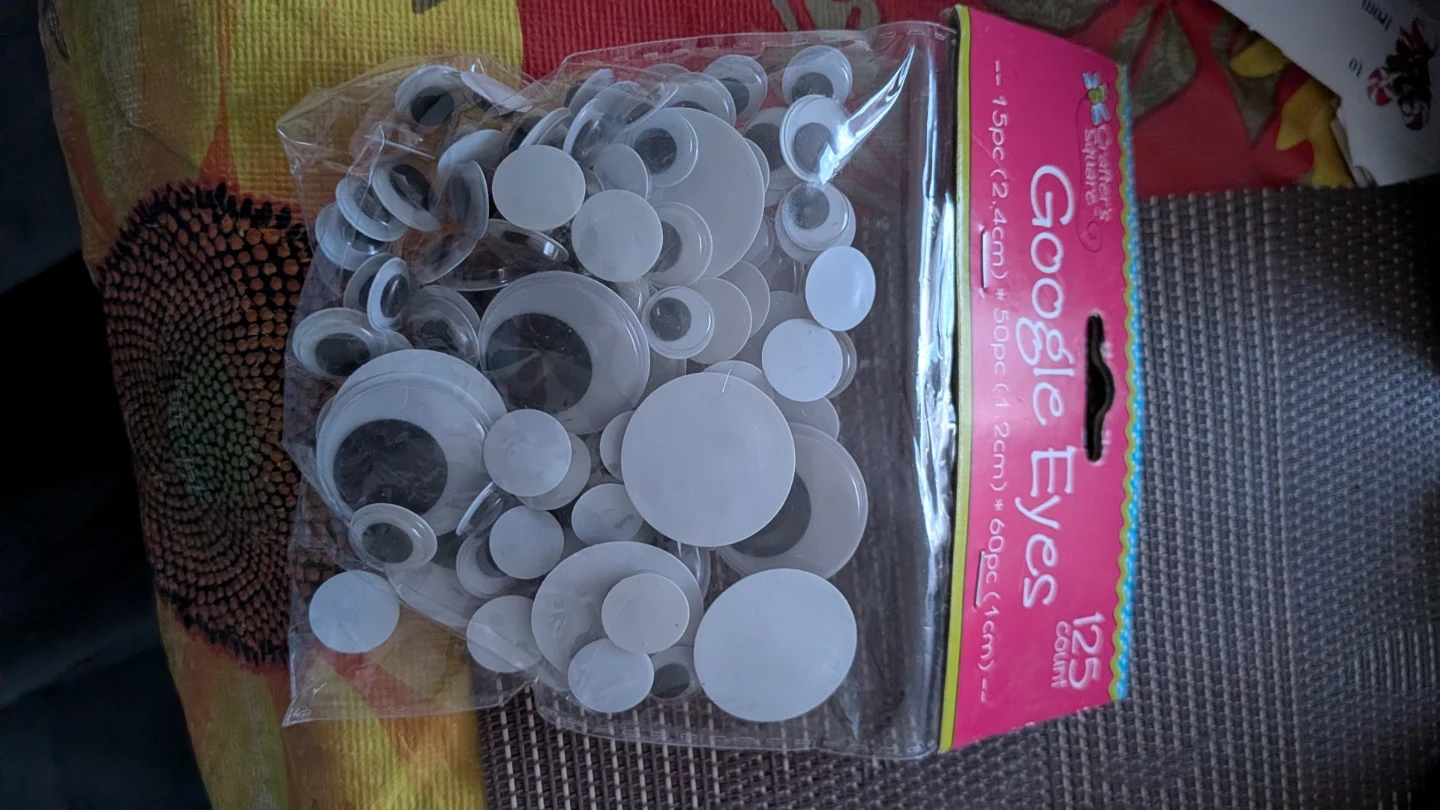 Giving away a pack of Crafter's Square Google Eyes! The pack contains 125 eyes in various sizes, including 15pc (2.4cm), 50pc (1.2cm), and 60pc (1cm). Perfect for craft projects and adding a fun touch to your creations.