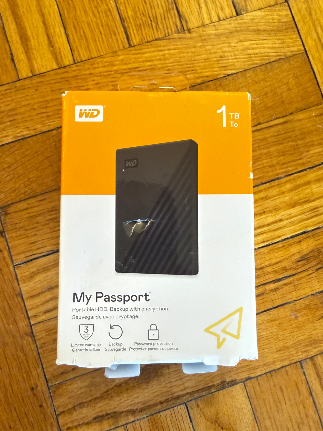 Selling a WD My Passport portable HDD with 1TB of storage! It comes with backup and password protection features. The box shows some signs of wear, but the drive itself is in great condition and ready to use!