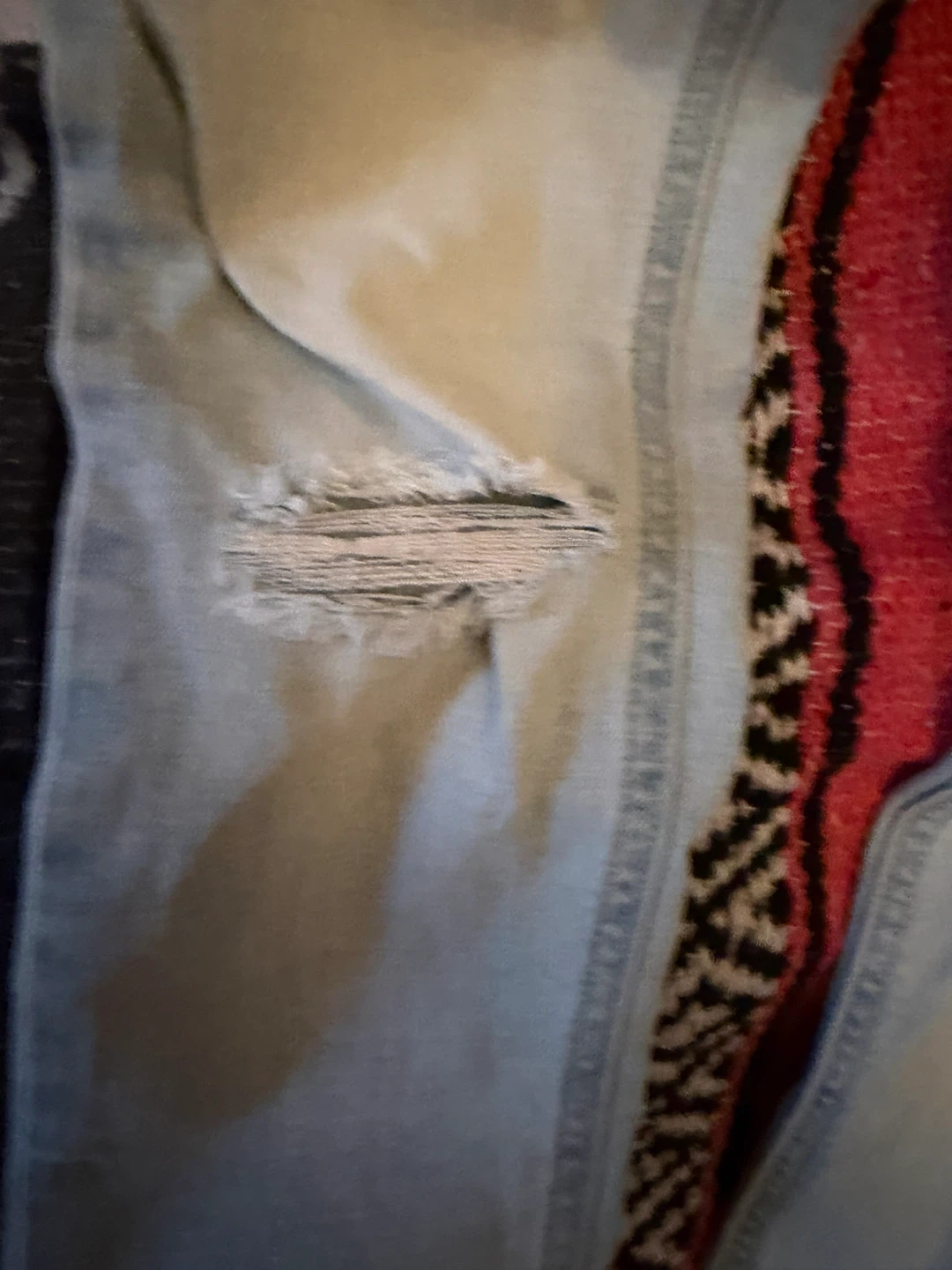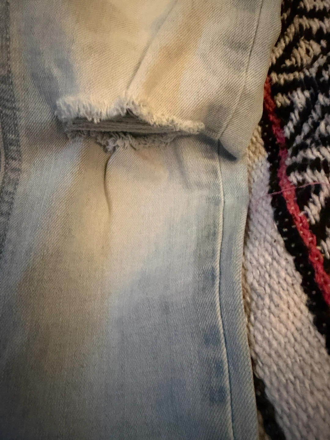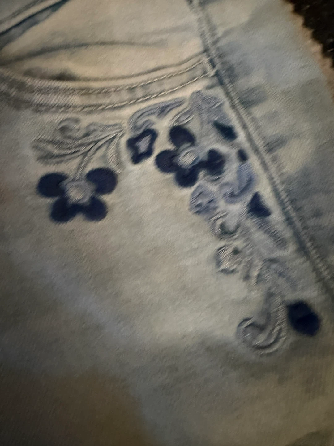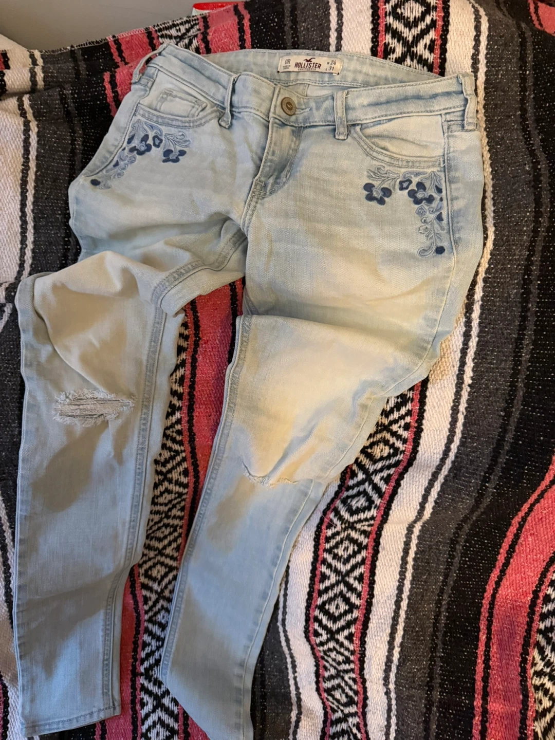 Hollister jeans in size 3R. These jeans have a light wash with floral embroidery details. There is some wear and tear, including a ripped knee.