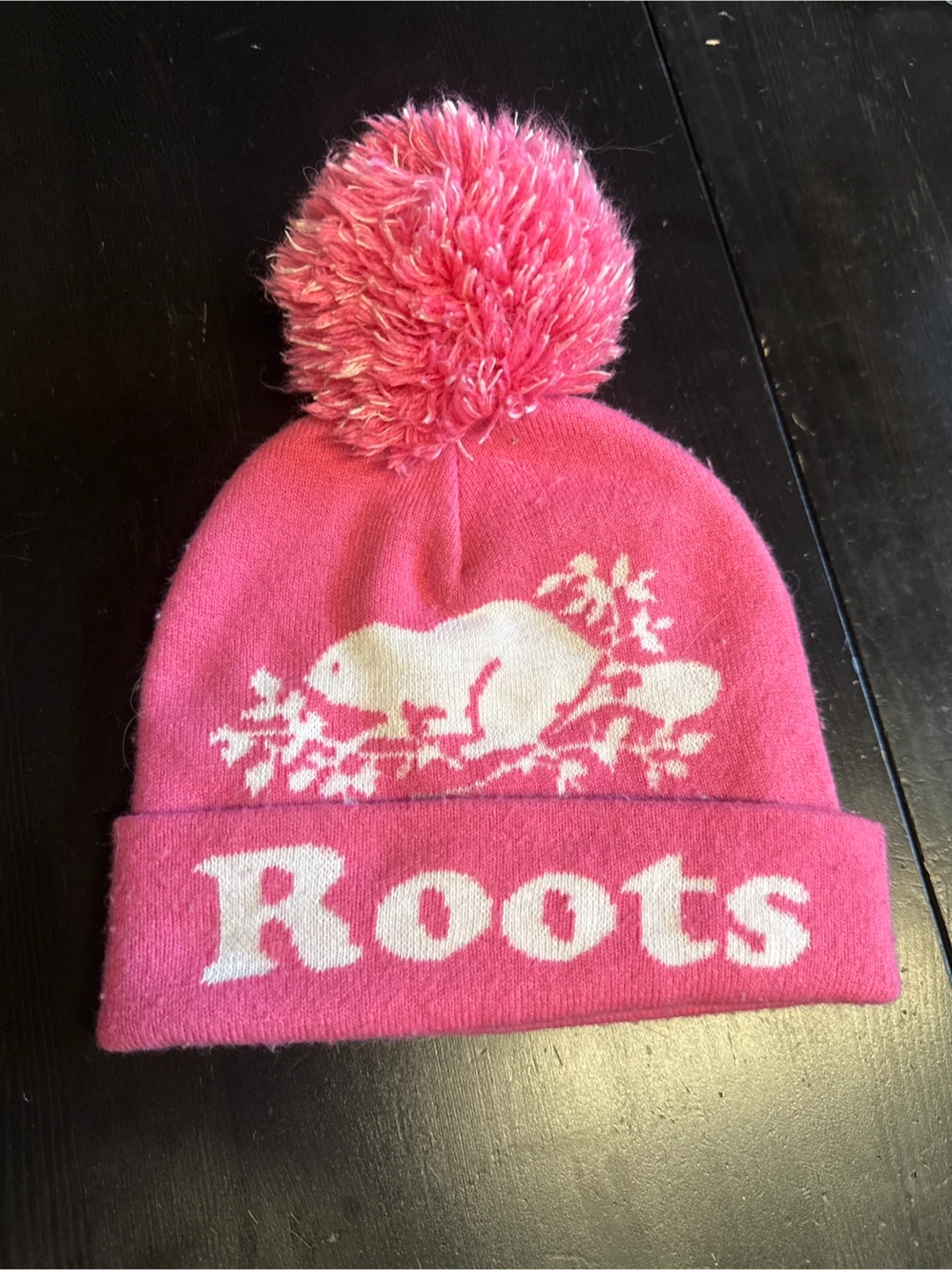 cute pink Roots Kids toque! It's in great condition and perfect for keeping your little one warm. The toque features the classic Roots beaver logo and a fun pompom on top. It's a cozy and stylish accessory for chilly days