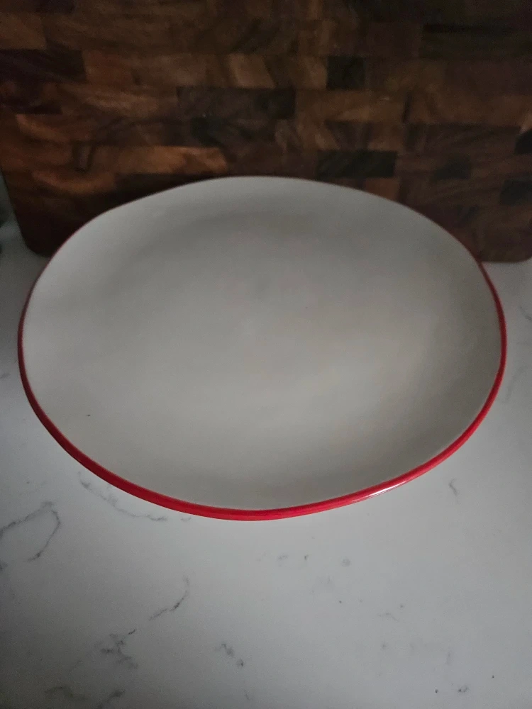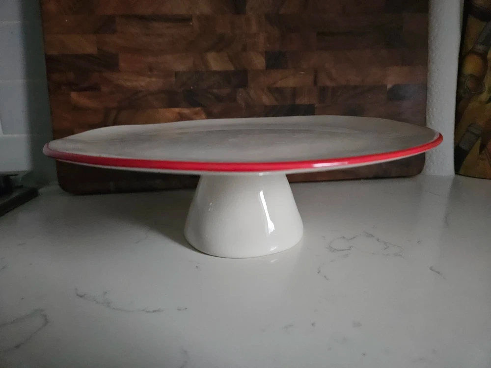 Selling a lovely cake stand! It's in great shape and ready to display your delicious treats. The red trim adds a nice pop of colour to any table setting.