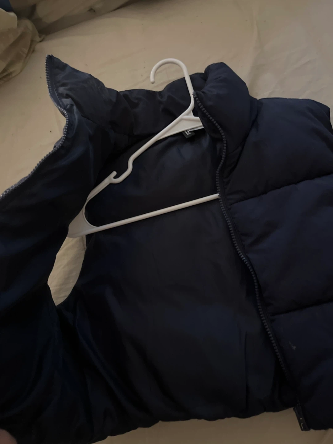 Here's a cozy navy puffer vest! It's in great condition and perfect for layering during the cooler months. It's a versatile piece that can be dressed up or down, making it a great addition to any wardrobe. Fits S and XS