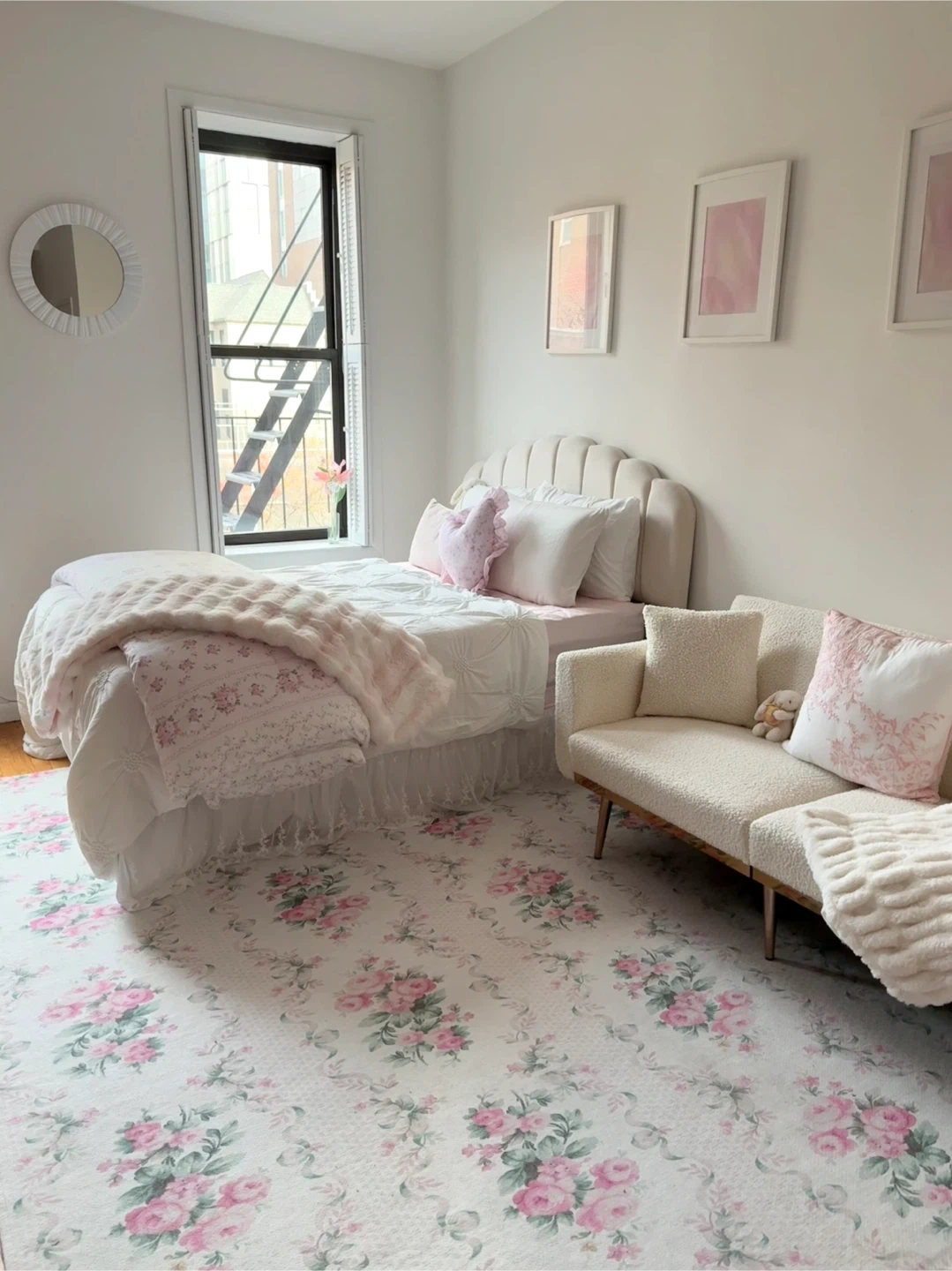 Selling a lovely floral rug in pink and white! It's in great condition and would look beautiful in any room. Perfect for adding a touch of charm to your space