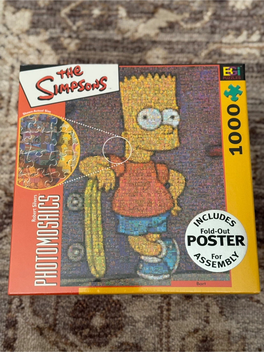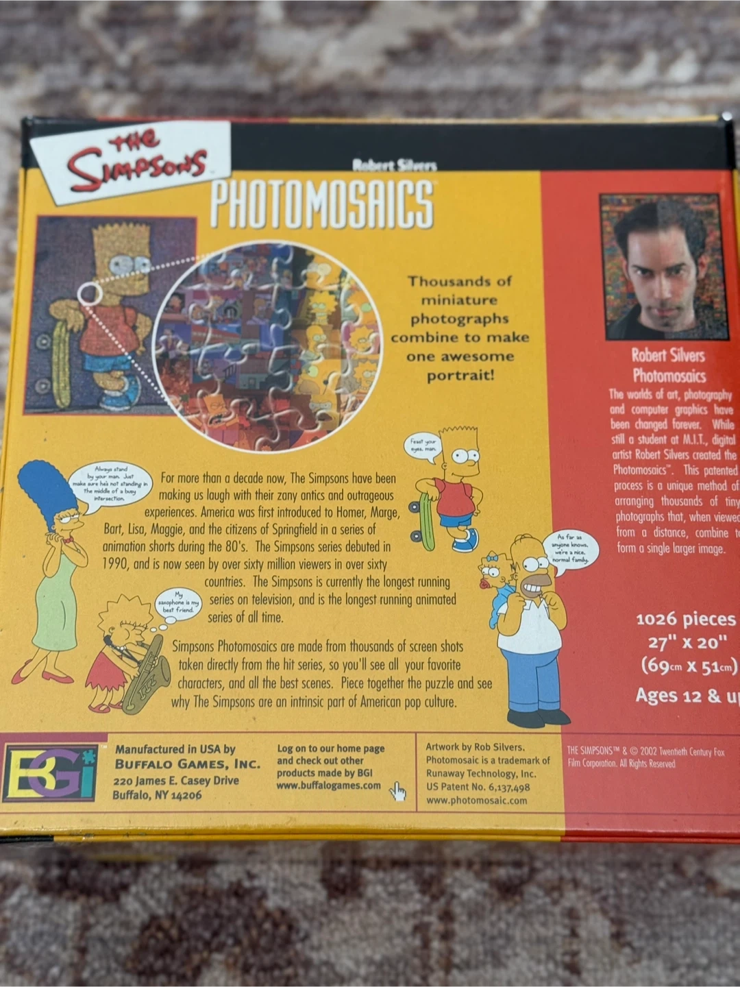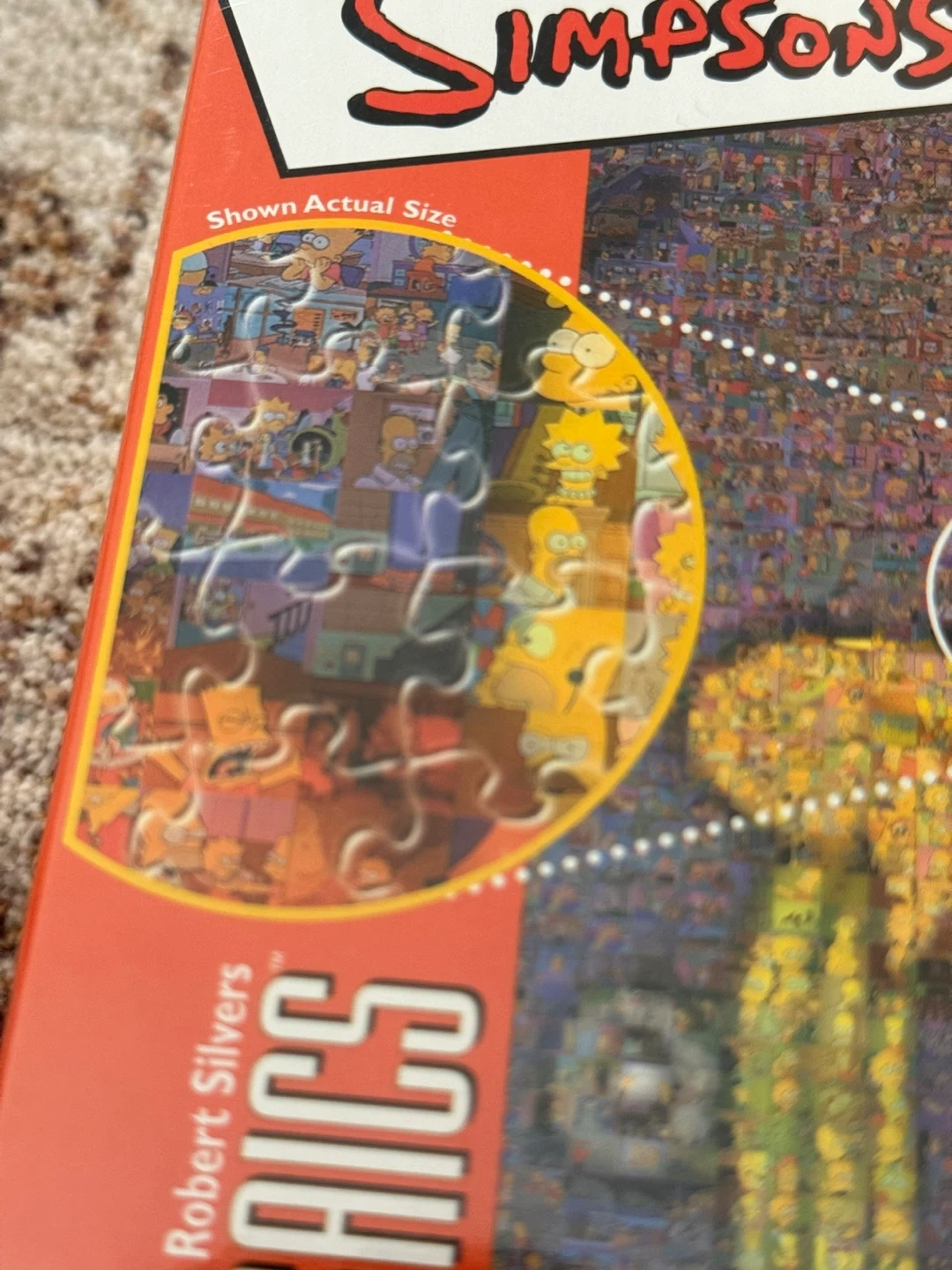 Selling a The Simpsons Photomosaics puzzle! It has 1026 pieces and creates a portrait from thousands of miniature photographs. The assembled puzzle is 27" x 20" (69cm x 51cm). It also includes a fold-out poster for assembly