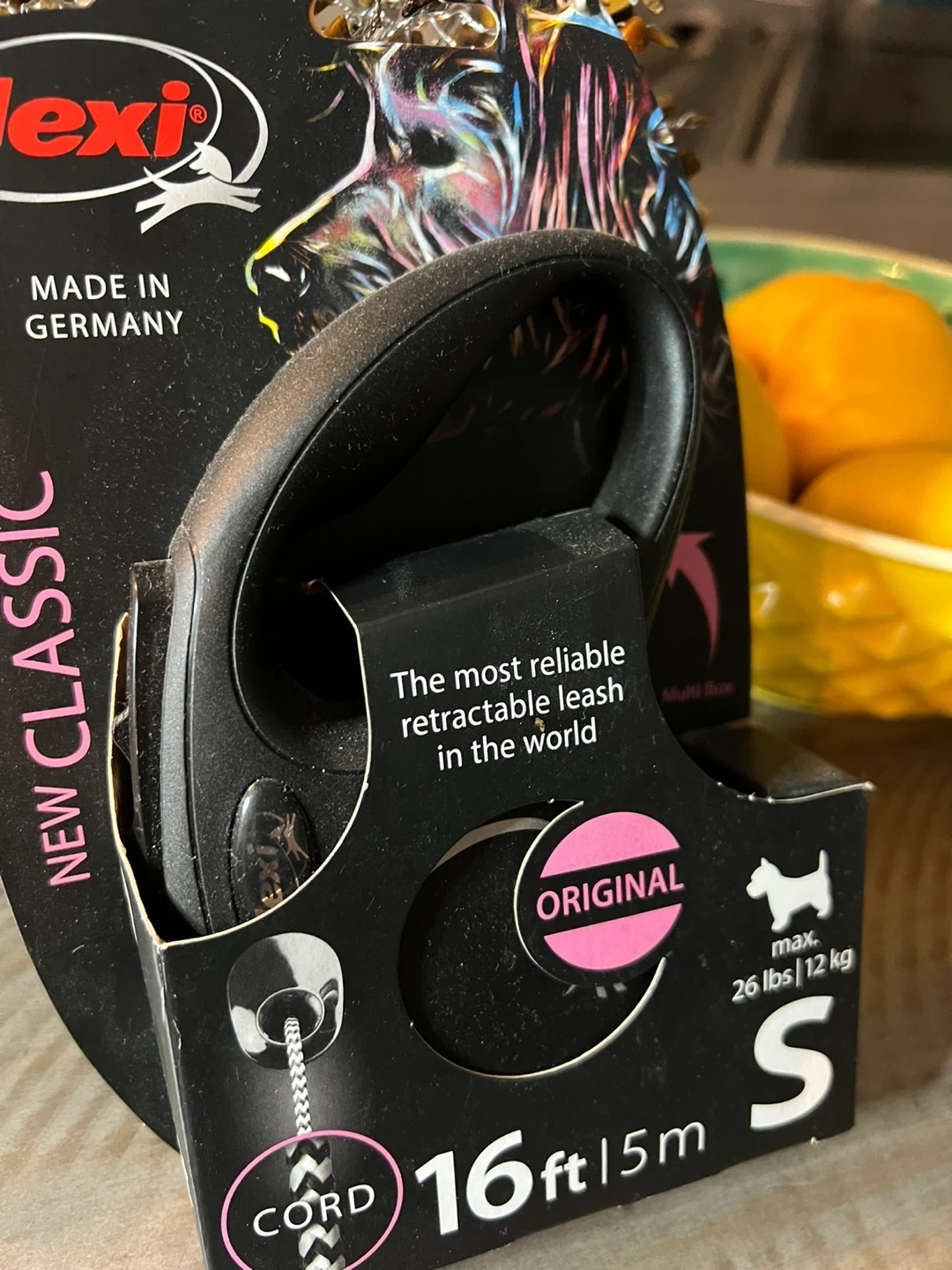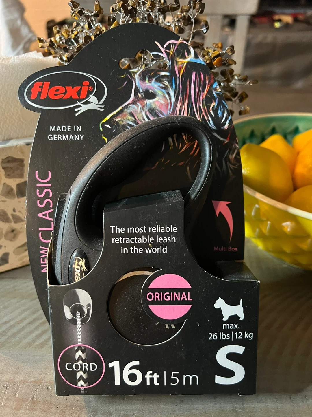 I'm selling a brand new Flexi Classic retractable dog leash! This is the small size, suitable for dogs up to 26 lbs (12 kg). The leash extends to 16 ft (5 m). It features a comfortable braking system and a high-strength cord. It also has a protector belt with reflective components for added safety. The box is included!