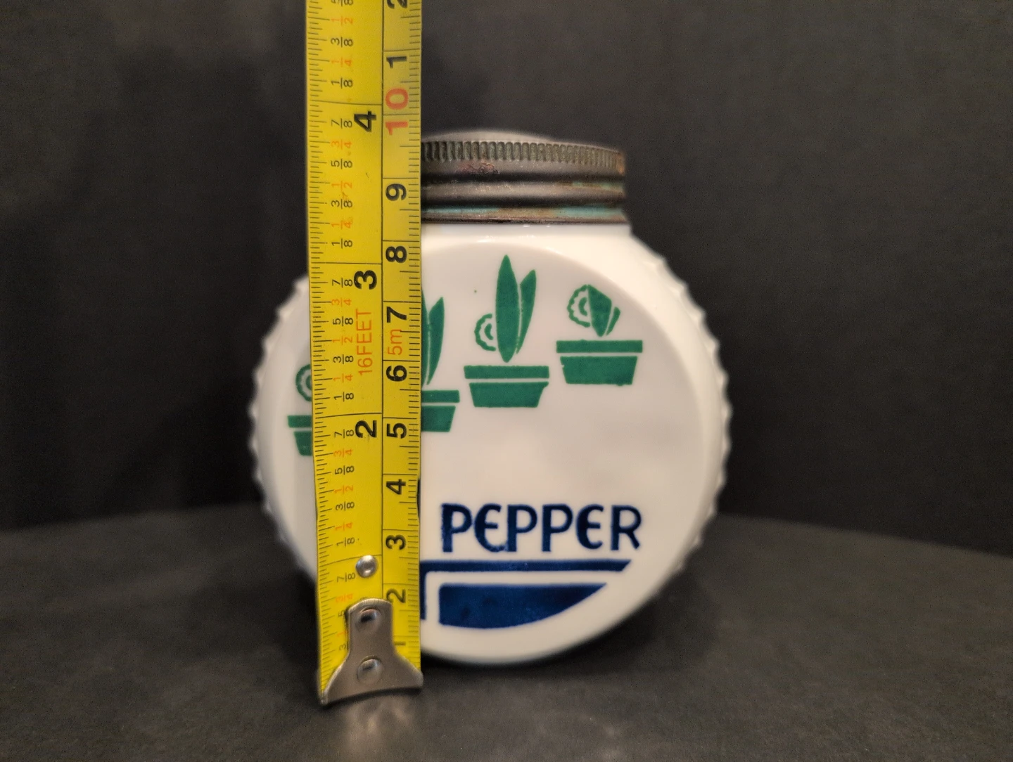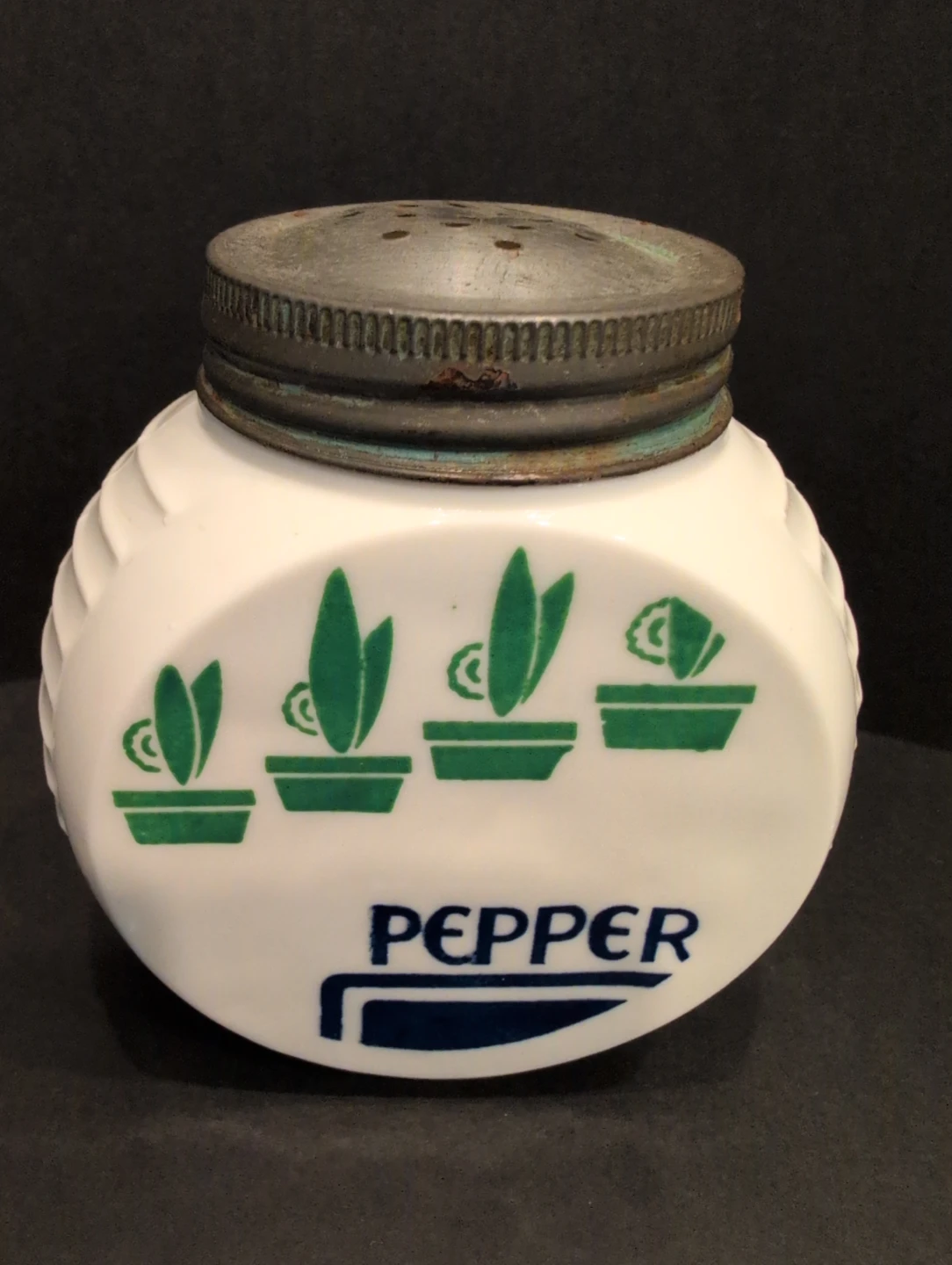 Selling a vintage Fire King Vitrock pepper shaker. It's in great condition and ready to add some retro charm to your kitchen or dining table! The shaker is white with green and blue accents, and it stands about 3.5 inches tall. It is UV reactive uranium glass.