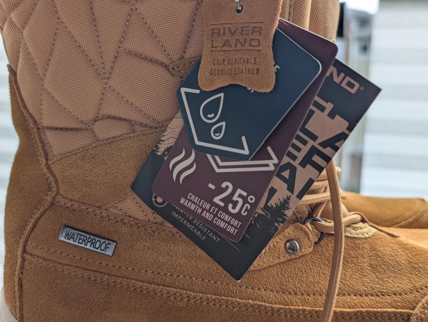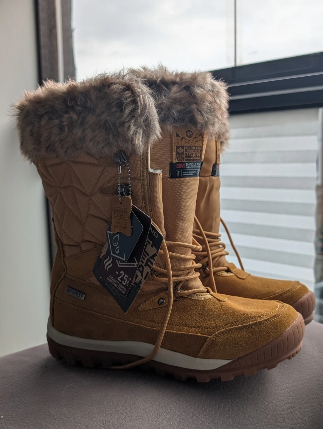 Keep your feet warm and stylish this winter with these Riverland Mountain Pathfinders winter boots! They're a women's size 9, made with man-made materials, and have a cozy faux fur trim. These boots are also waterproof and insulated to keep you comfortable in cold weather