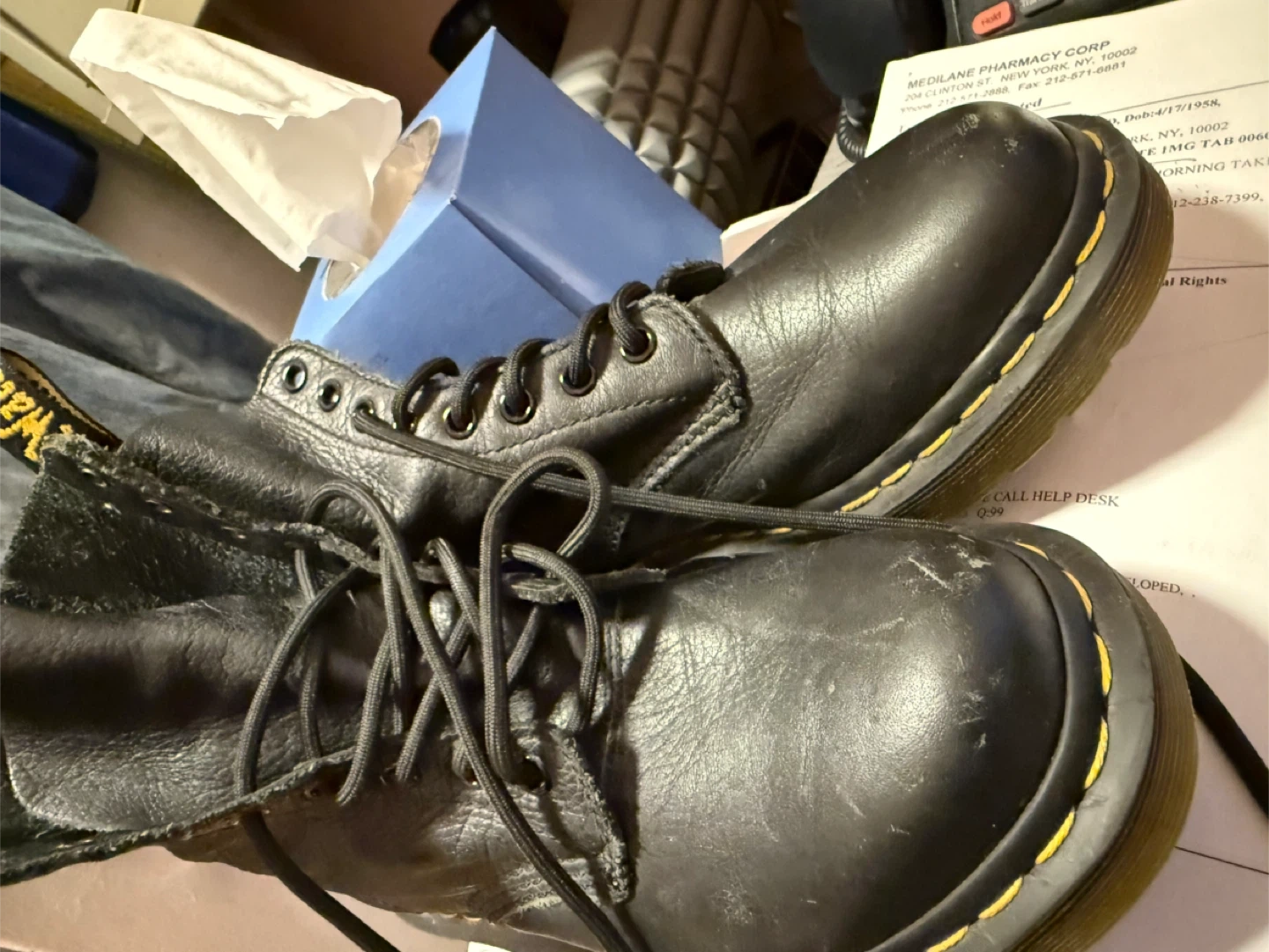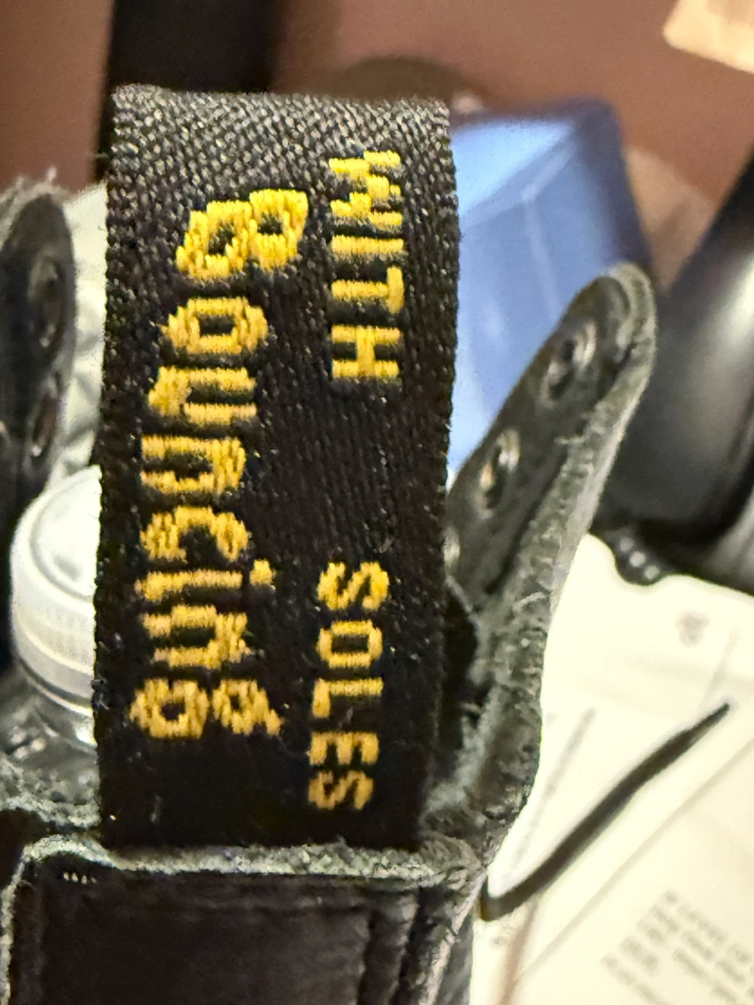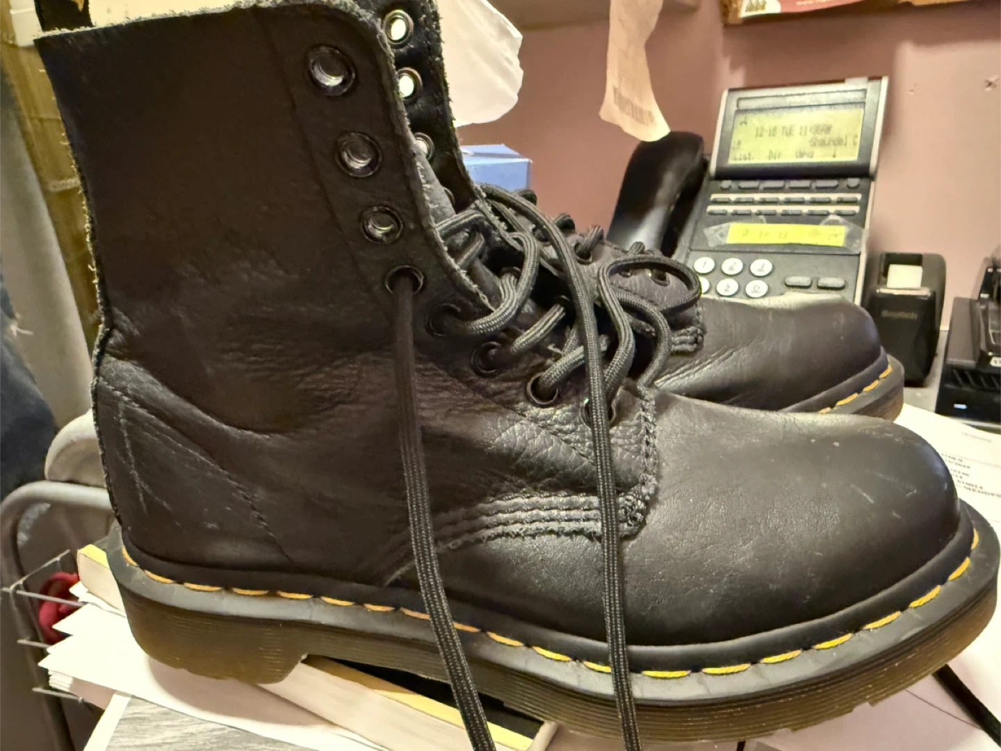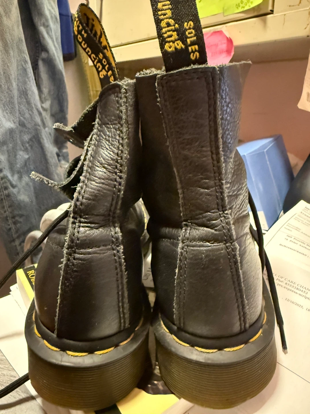Selling a pair of Dr. Martens black leather boots. These have the classic Dr. Martens look and are built to last. The soles are oil, fat, acid, petrol, and alkali resistant for extra durability. They show some signs of wear, but are still in good condition and ready for a new owner!