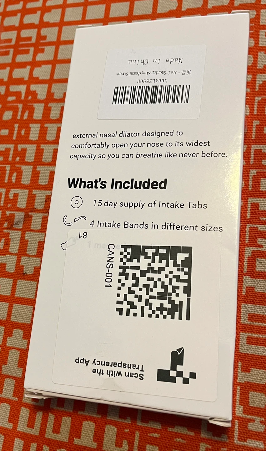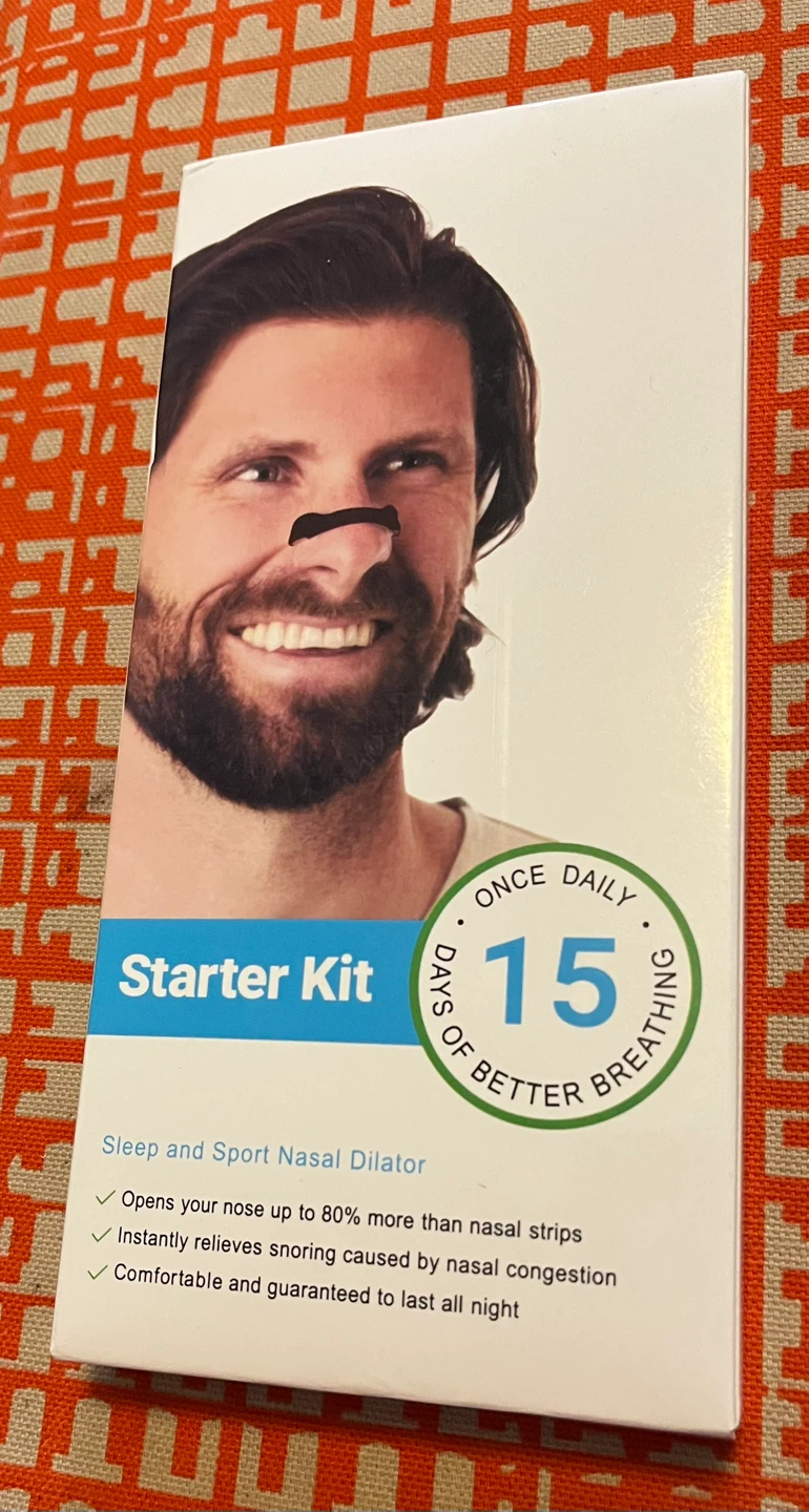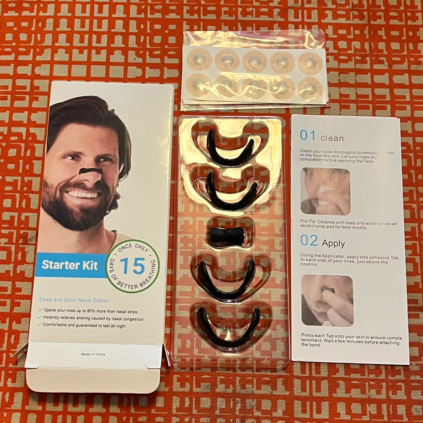 I'm selling a Sleep and Sport Nasal Dilator Starter Kit. It opens your nose up to 80% more than nasal strips and instantly relieves snoring caused by nasal congestion. It is comfortable and guaranteed to last all night! Included in the box are a 15 day supply of Intake Tabs and 4 Intake Bands in different sizes.
