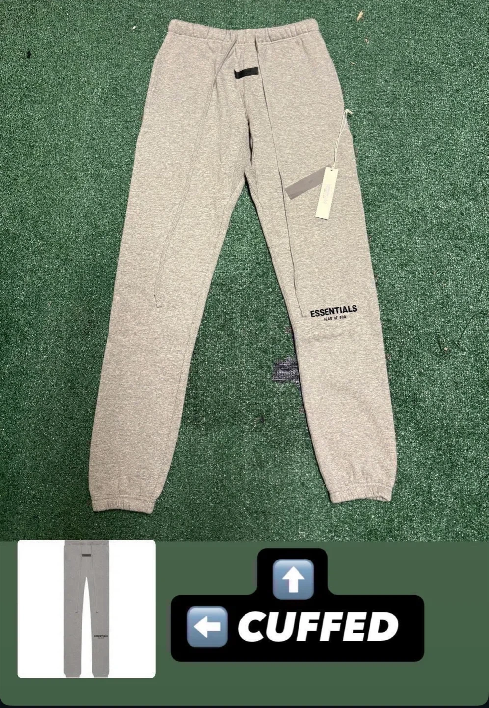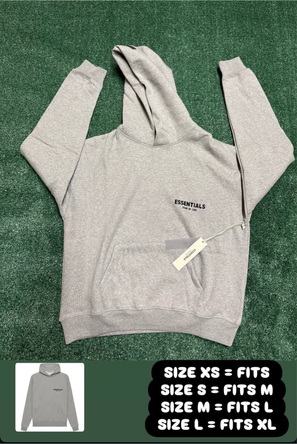Selling a matching set of Essentials Fear of God hoodie and sweatpants in gray! The hoodie has the Essentials logo on the front. The sweatpants are cuffed at the ankles.