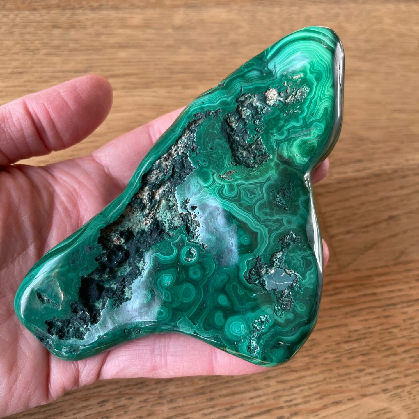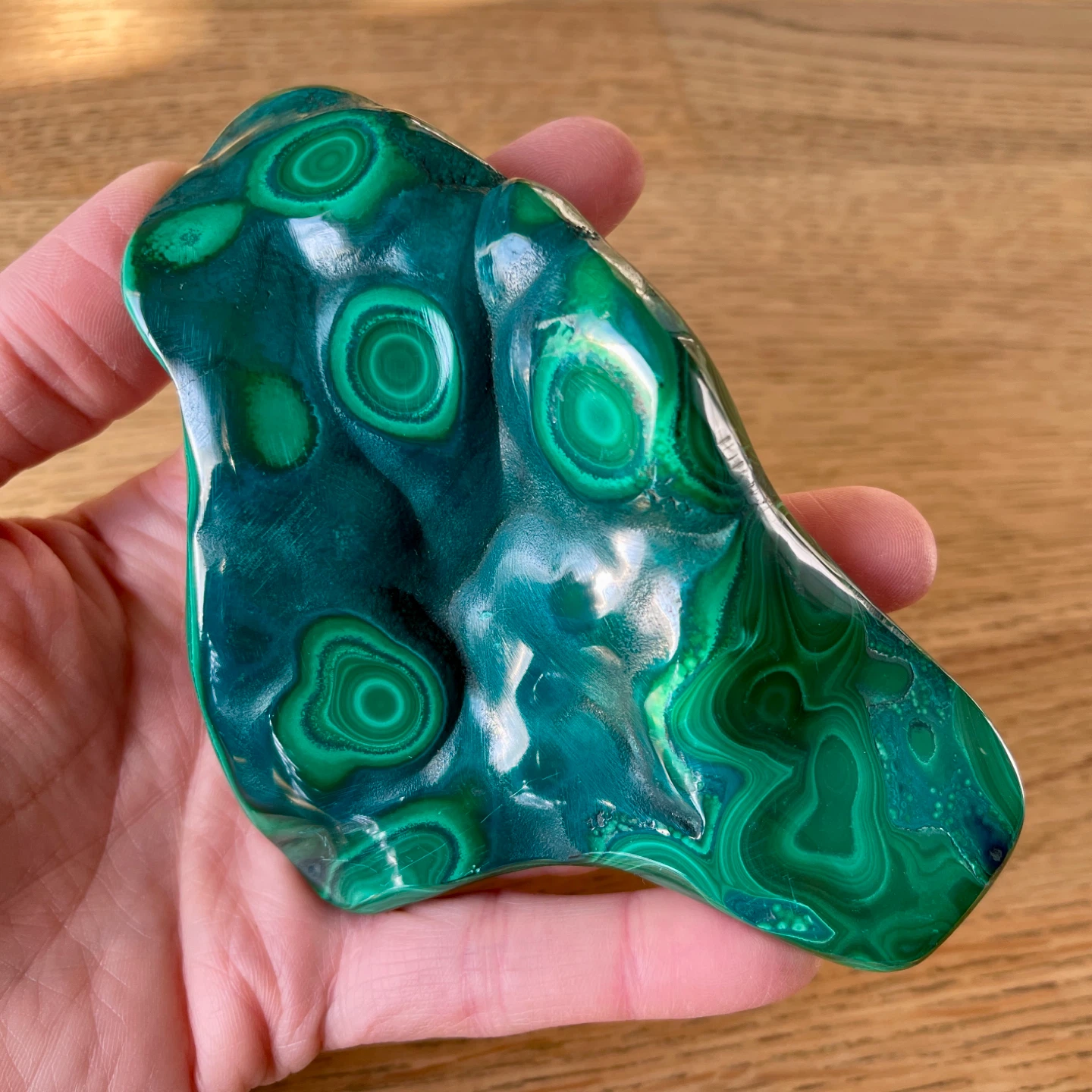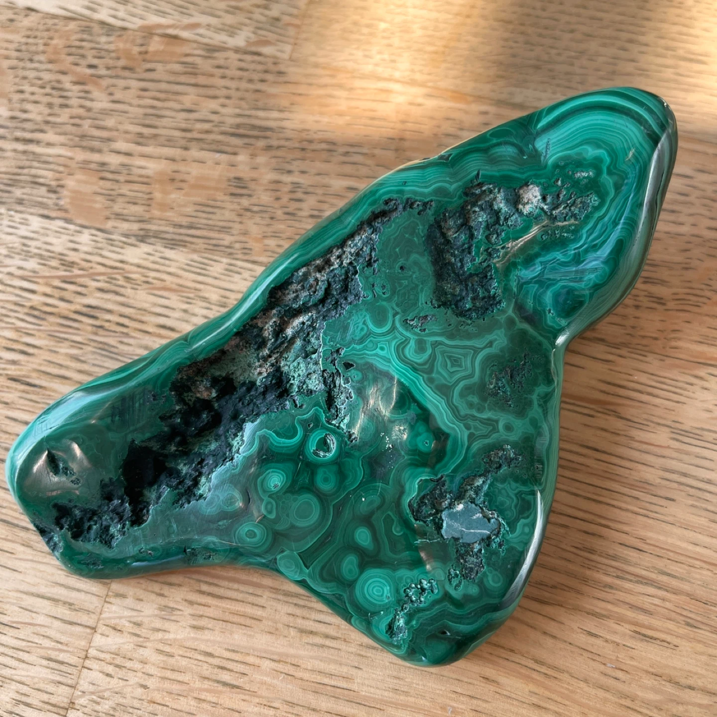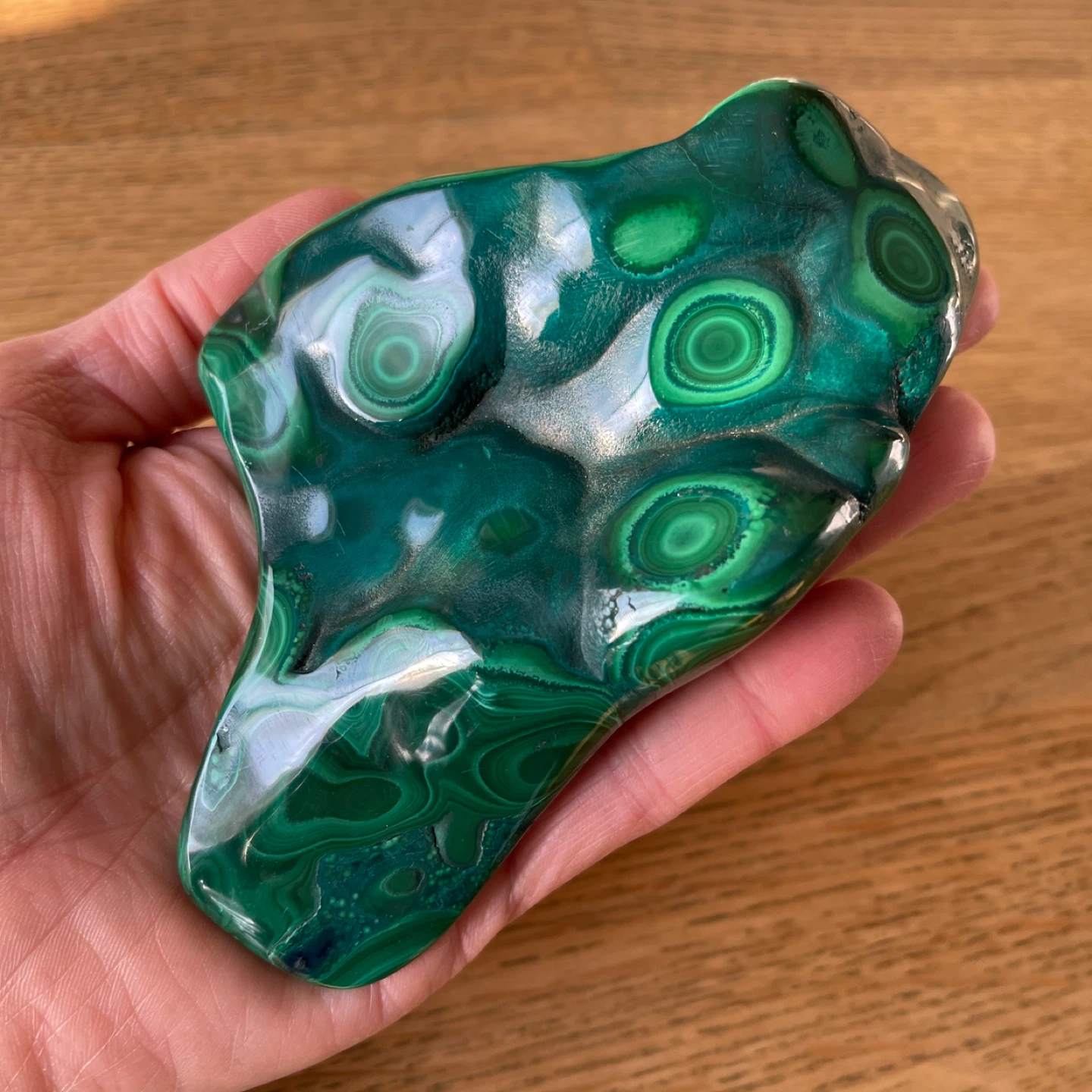 This stunning creation of nature features vibrant deep-green hues and mesmerizing 'bullseye' orbital patterns. Malachite is truly a powerful stone of transformation, promoting change and emotional growth. Additionally, it supports connection in relationships and is associated with the heart chakra.