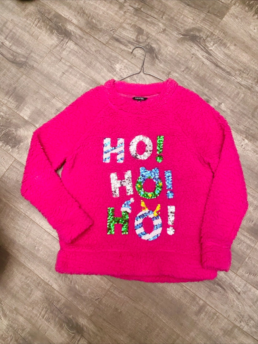 Ladies size S. pink sweater from George! It features a fun 'HO! HO! HO!' design made with colourful sequins. Perfect for adding a touch of sparkle to your winter wardrobe