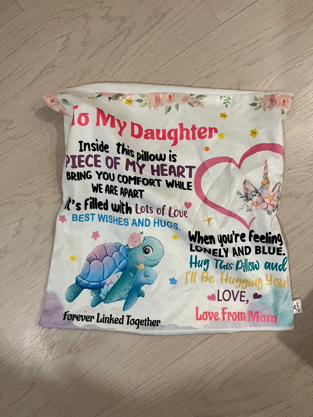 A sweet pillow with a heartwarming message for a daughter. It says, 'To My Daughter, Inside this pillow is a piece of my heart. Bring you comfort while we are apart. It's filled with lots of love, best wishes, and hugs.' There's also a cute turtle and unicorn design!