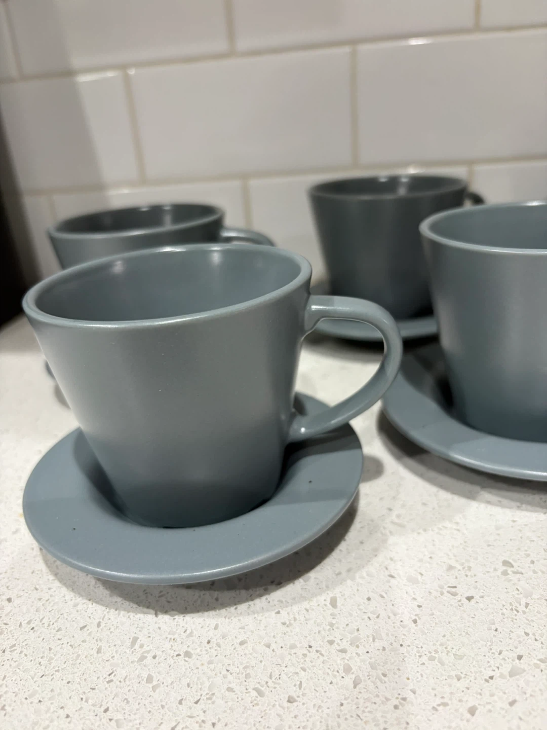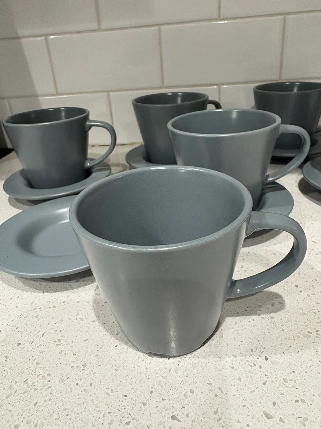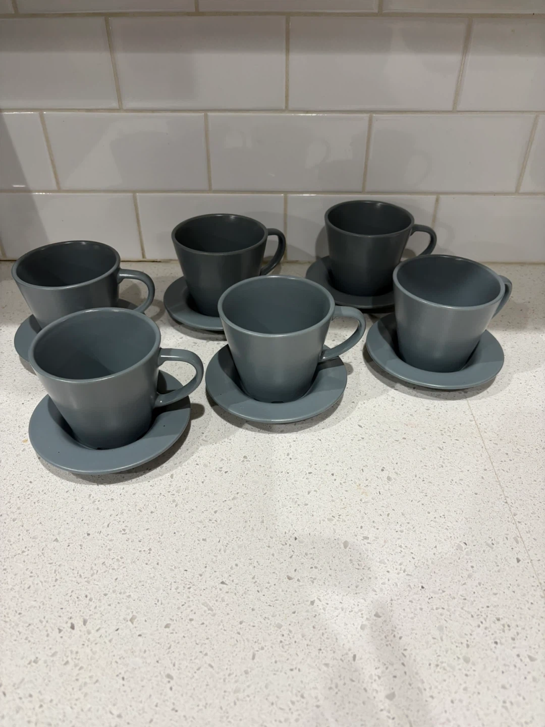 Selling a set of grey cups and saucers. They're in great condition and would be a lovely addition to any kitchen or dining set