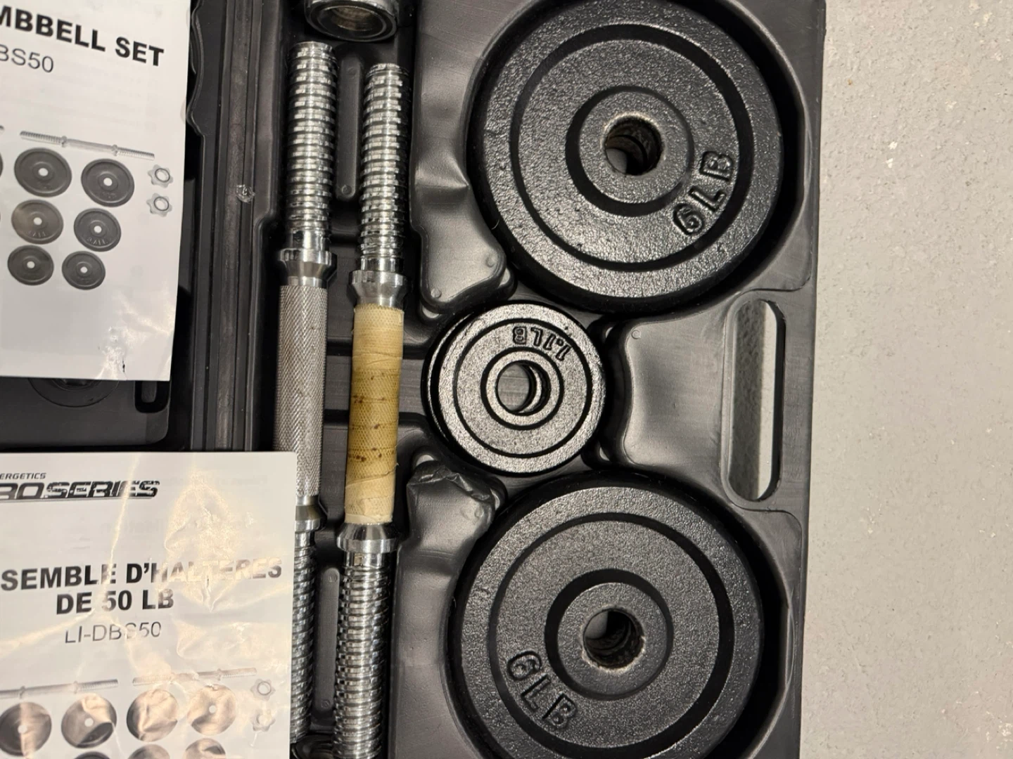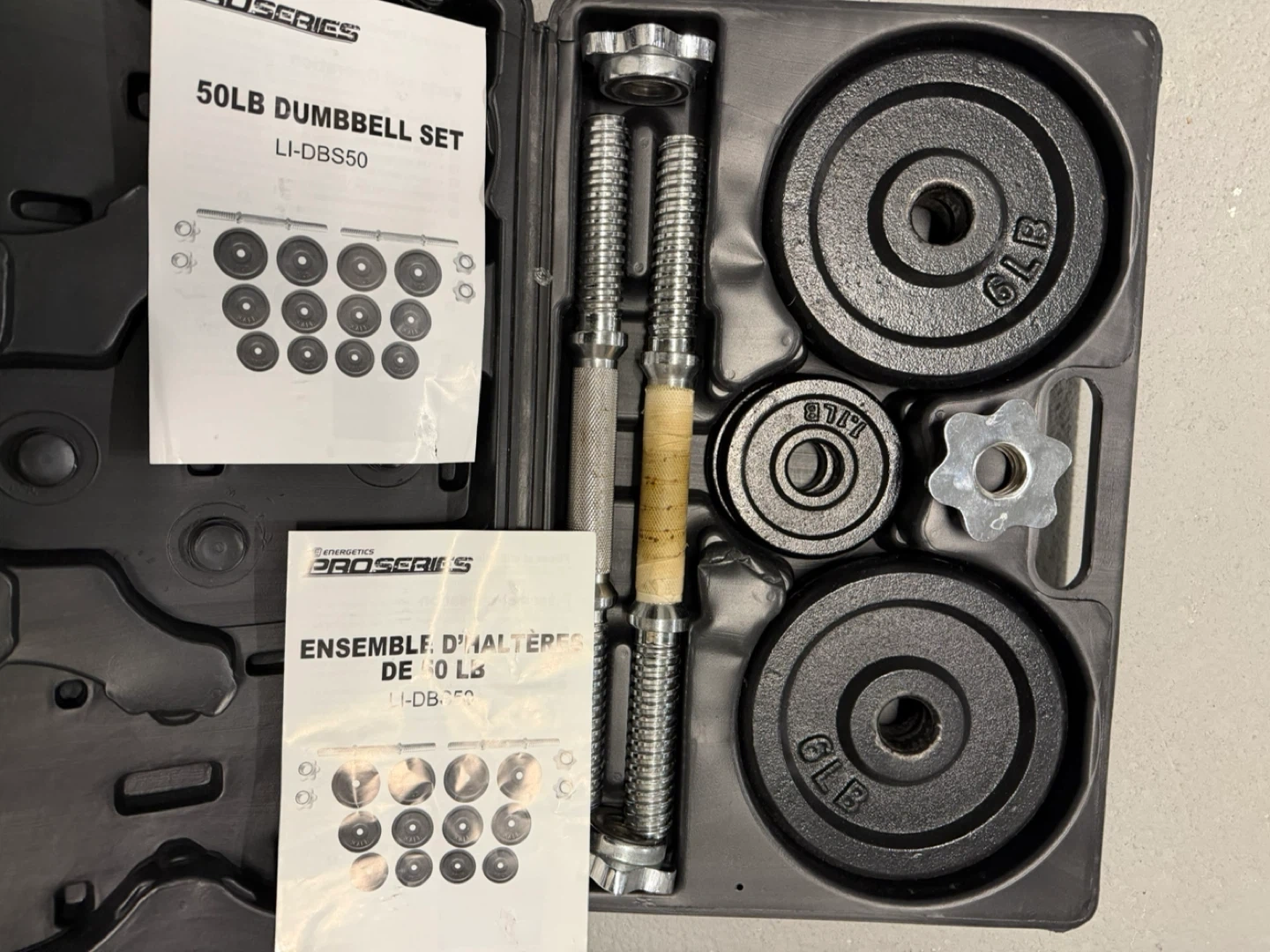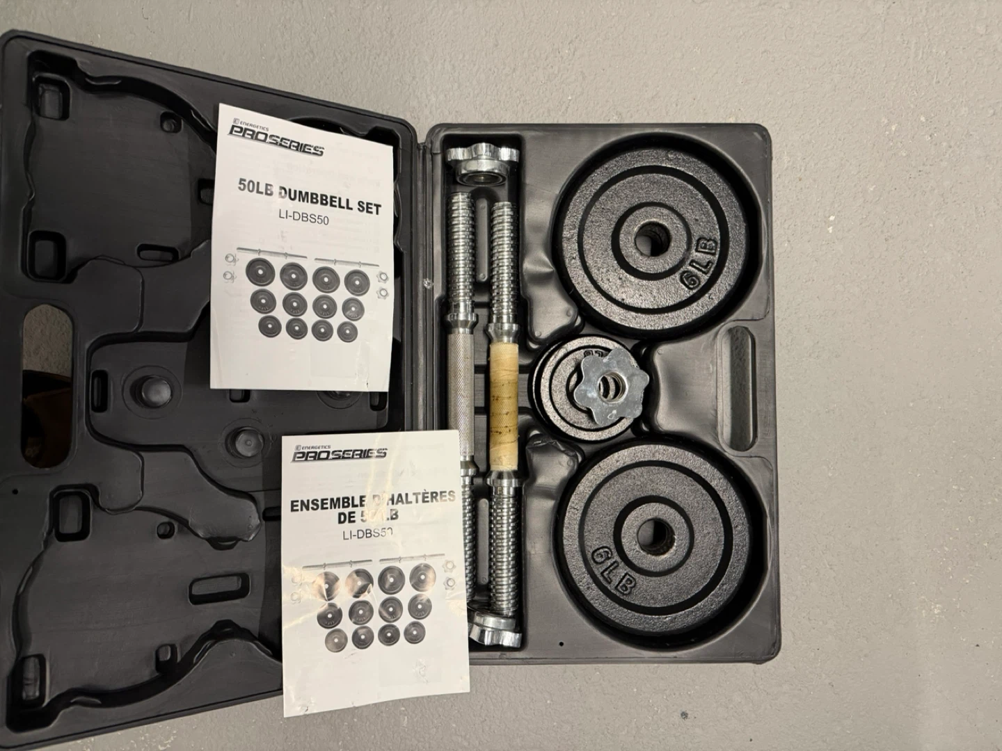 Selling an Energetics Pro Series 50lb dumbbell set! It comes with all the original pieces and the carrying case. Perfect for getting those gains at home!