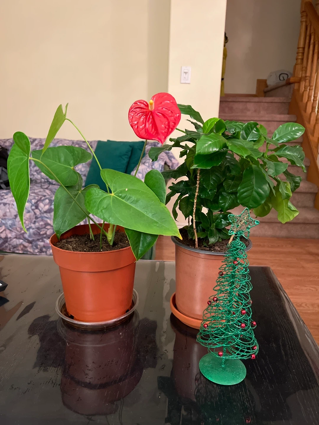 I'm selling a potted Anthurium plant with a beautiful red flower. It comes in a terracotta pot. I’m also selling a coffee plant. Both are a lovely addition to any home! The decor Christmas🎄tree is free with purchase if you get both plants. $20 for both plants.