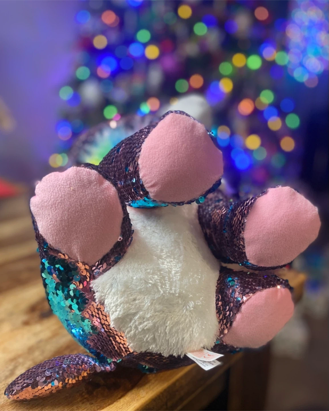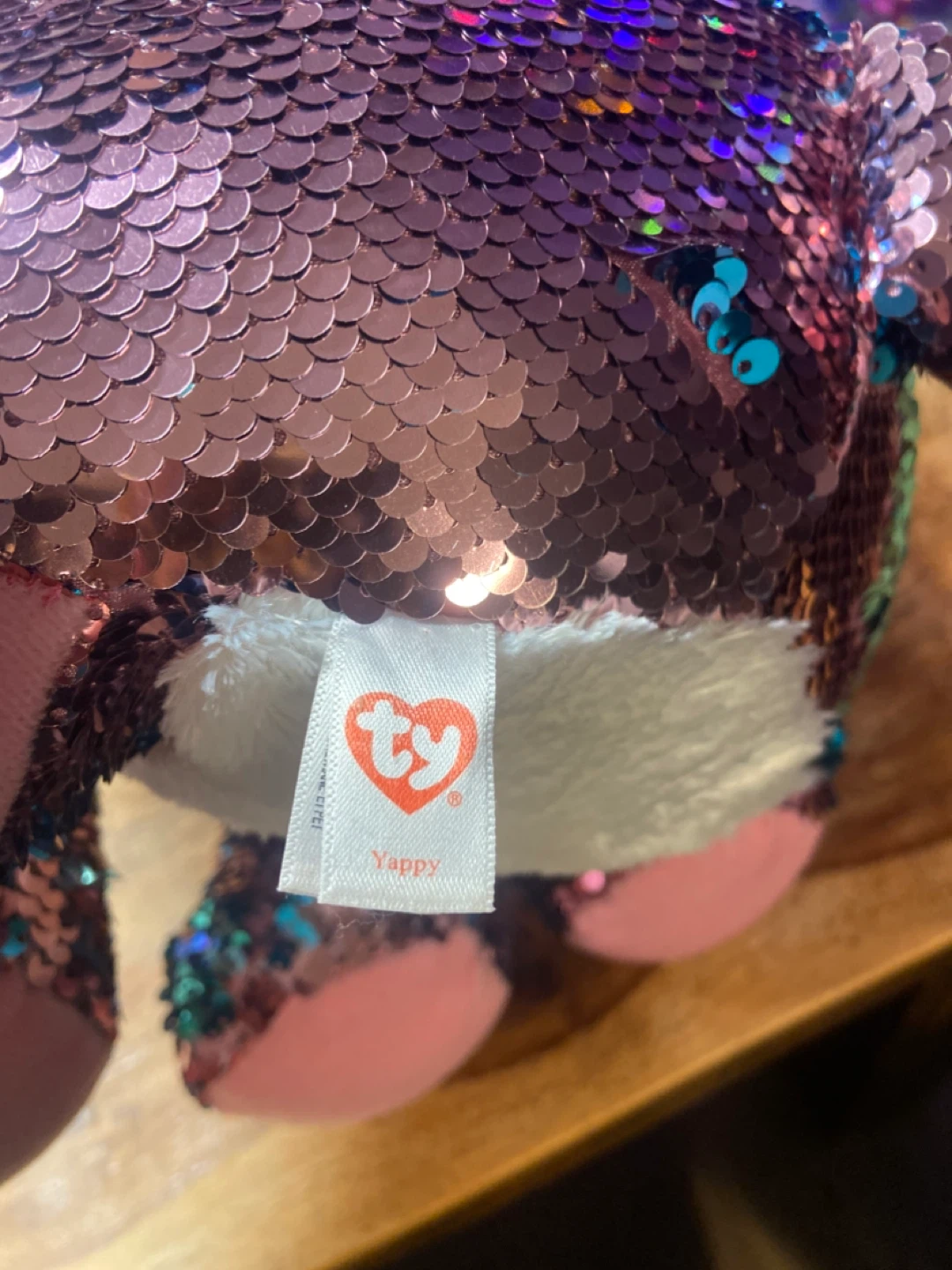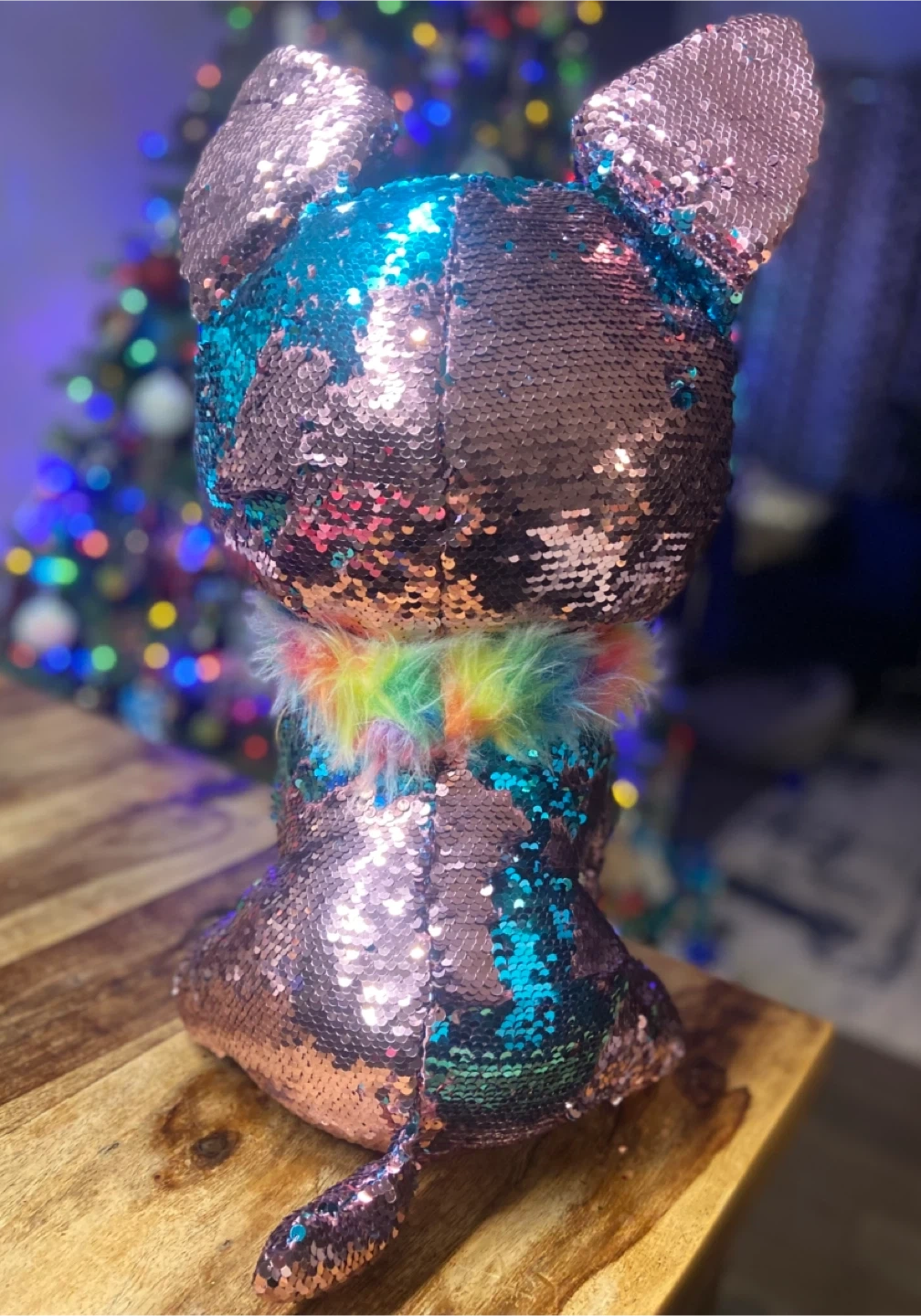 Here's a cute and sparkly Ty Beanie Boo flip sequin chihuahua plush! It has a rainbow coloured fluffy collar and big glittery eyes. 18 inches tall. It's in excellent condition and ready for a new home! Tag attached but has been bent. From a smk-free home. Pick up north end St Catharines near Linwell/Vine