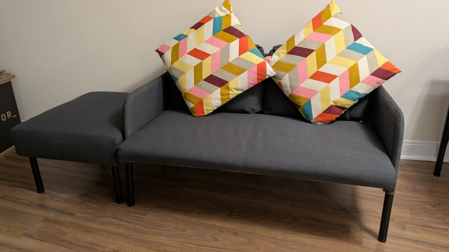 Selling a comfy grey sofa with a matching ottoman. It’s in great shape and would be perfect for a living room or den. The cushions add a nice pop of colour!