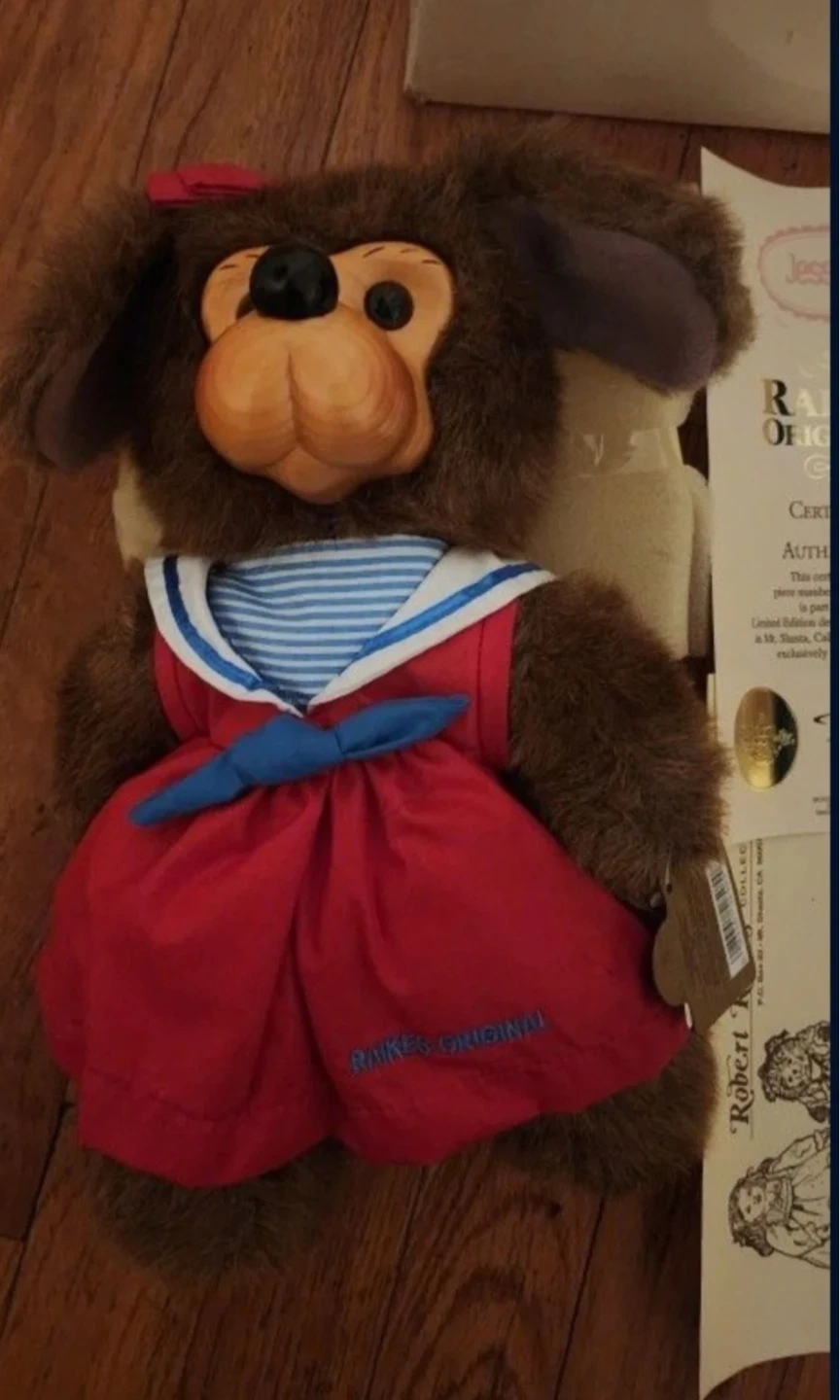 Selling a Jessica Raikes Originals doll! It comes with its original box and certificate of authenticity. The doll is wearing a red dress and has a cute sailor-style top underneath. It's a charming collectible!
