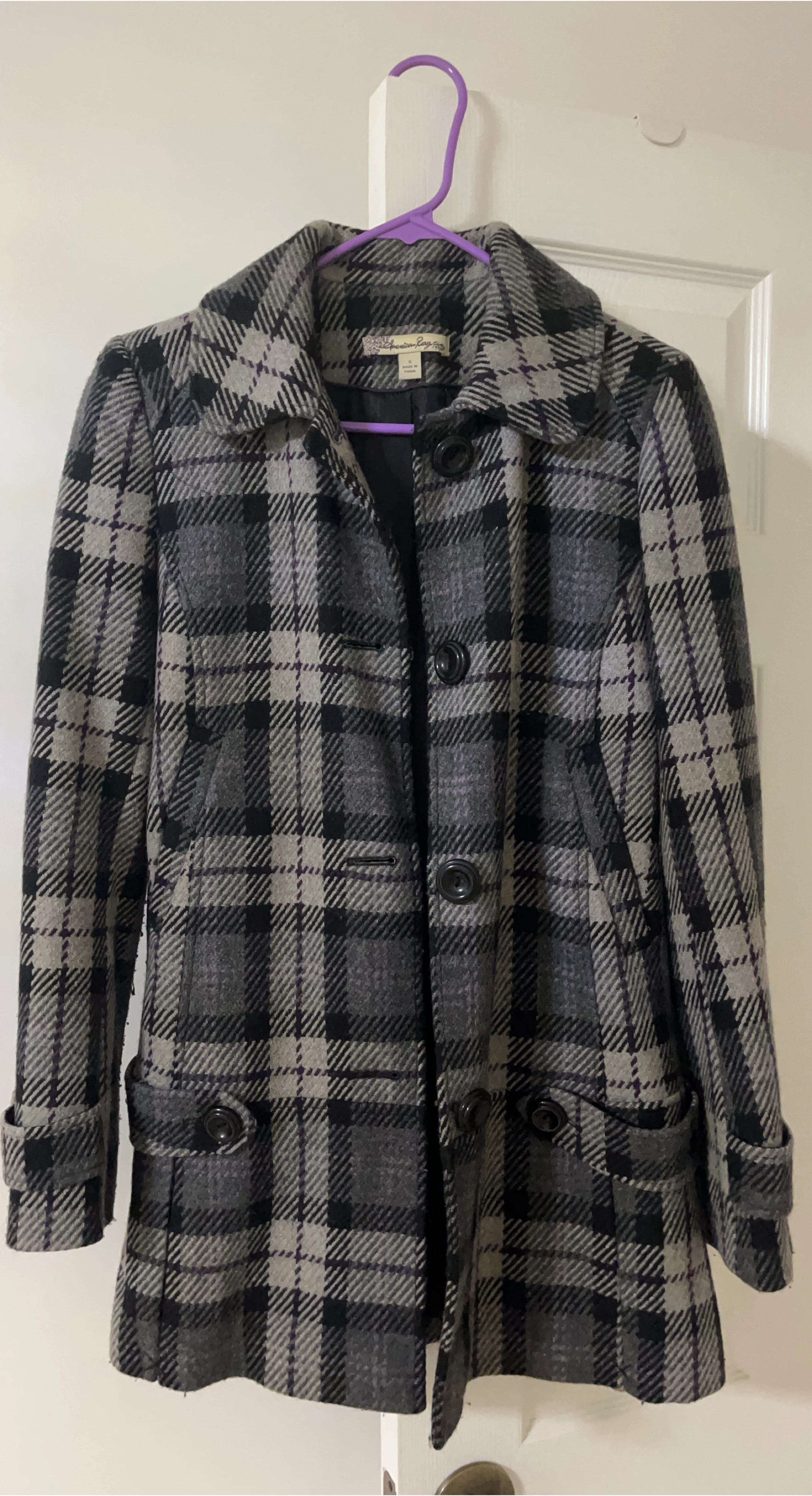 American Rag coat in a stylish plaid pattern. It's a size small and in great condition! Perfect for adding a touch of classic style to your wardrobe