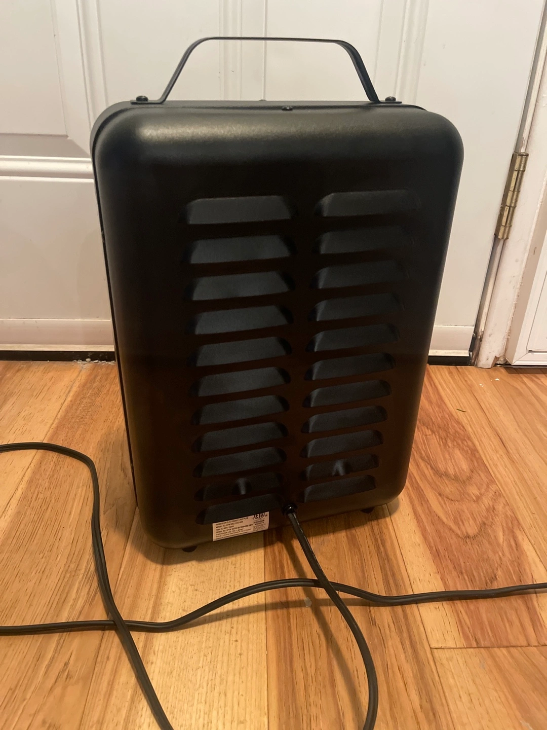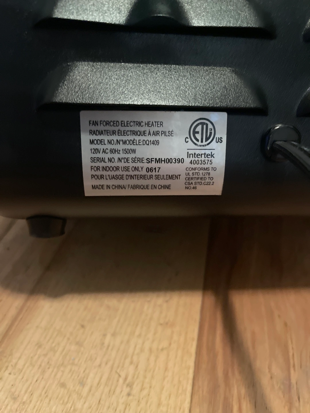Selling a fan-forced electric heater in black. It's in good working order and ready to keep you warm! Model number is DG1409. It runs on 120V AC 60Hz and 1500W. Perfect for indoor use!