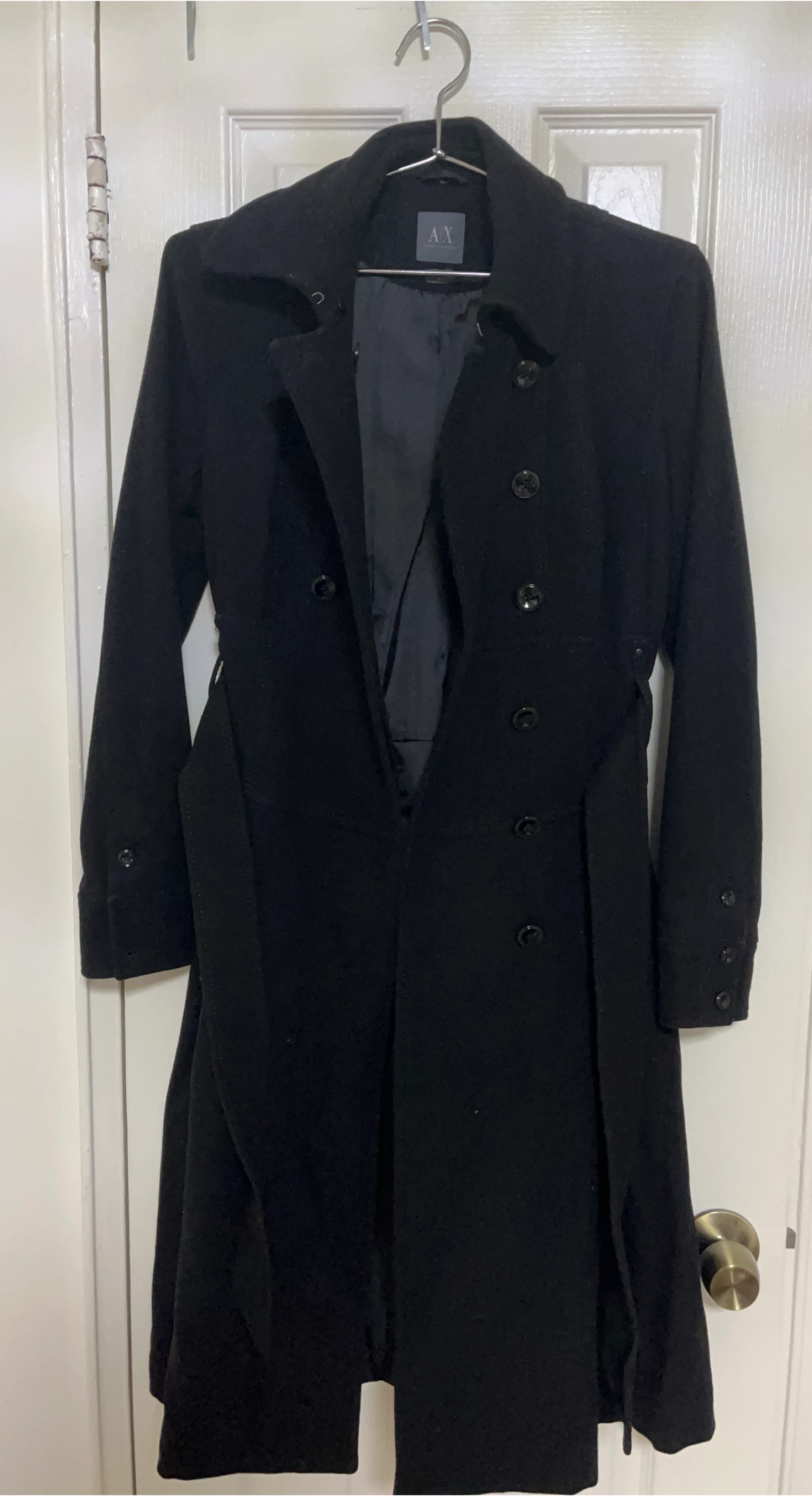 Selling a classic black trench coat from Armani Exchange. It's in great condition and ready for a new owner! The coat features a stylish design with buttons down the front and a belt to cinch the waist. Perfect for adding a touch of sophistication to any outfit