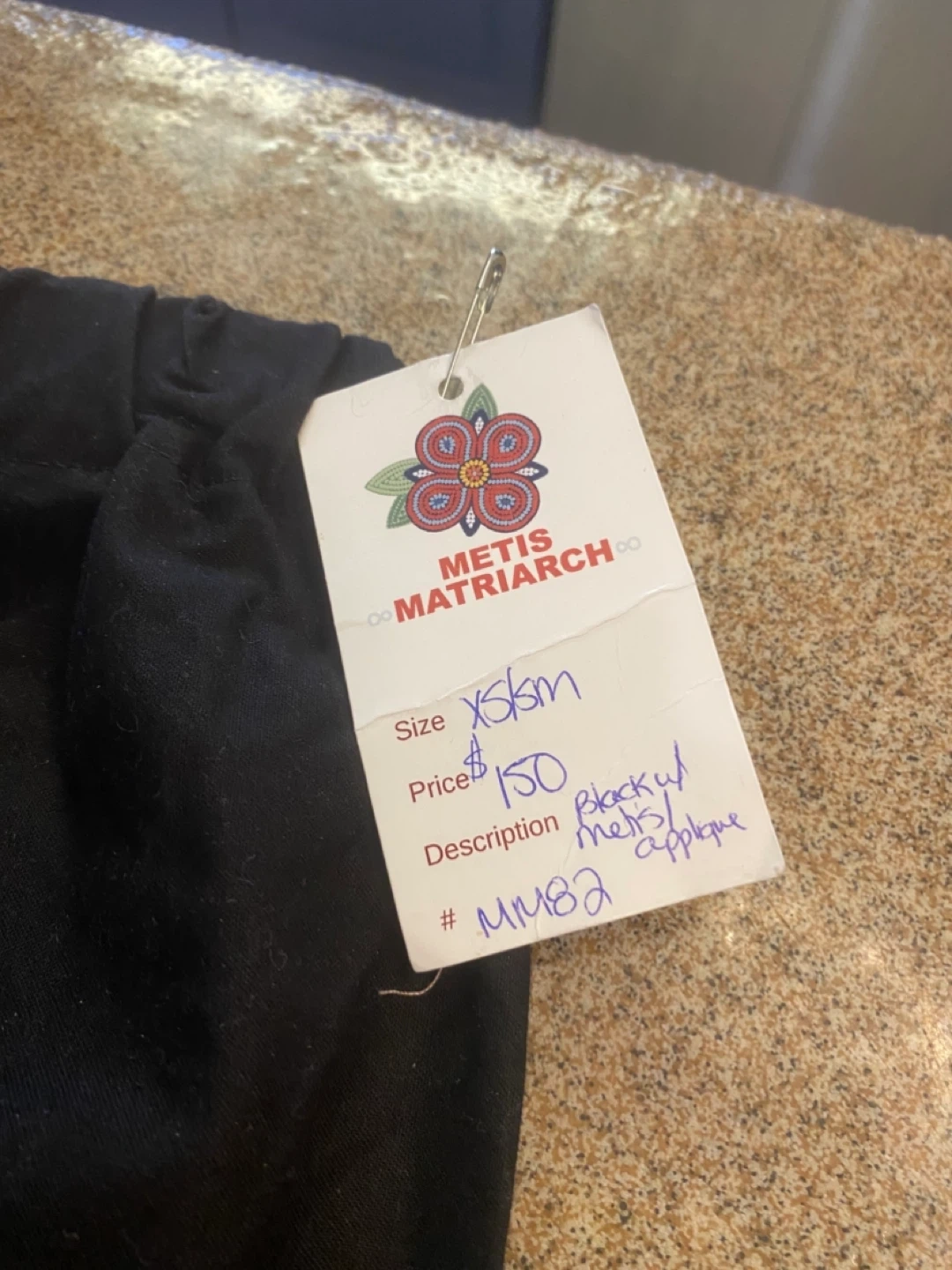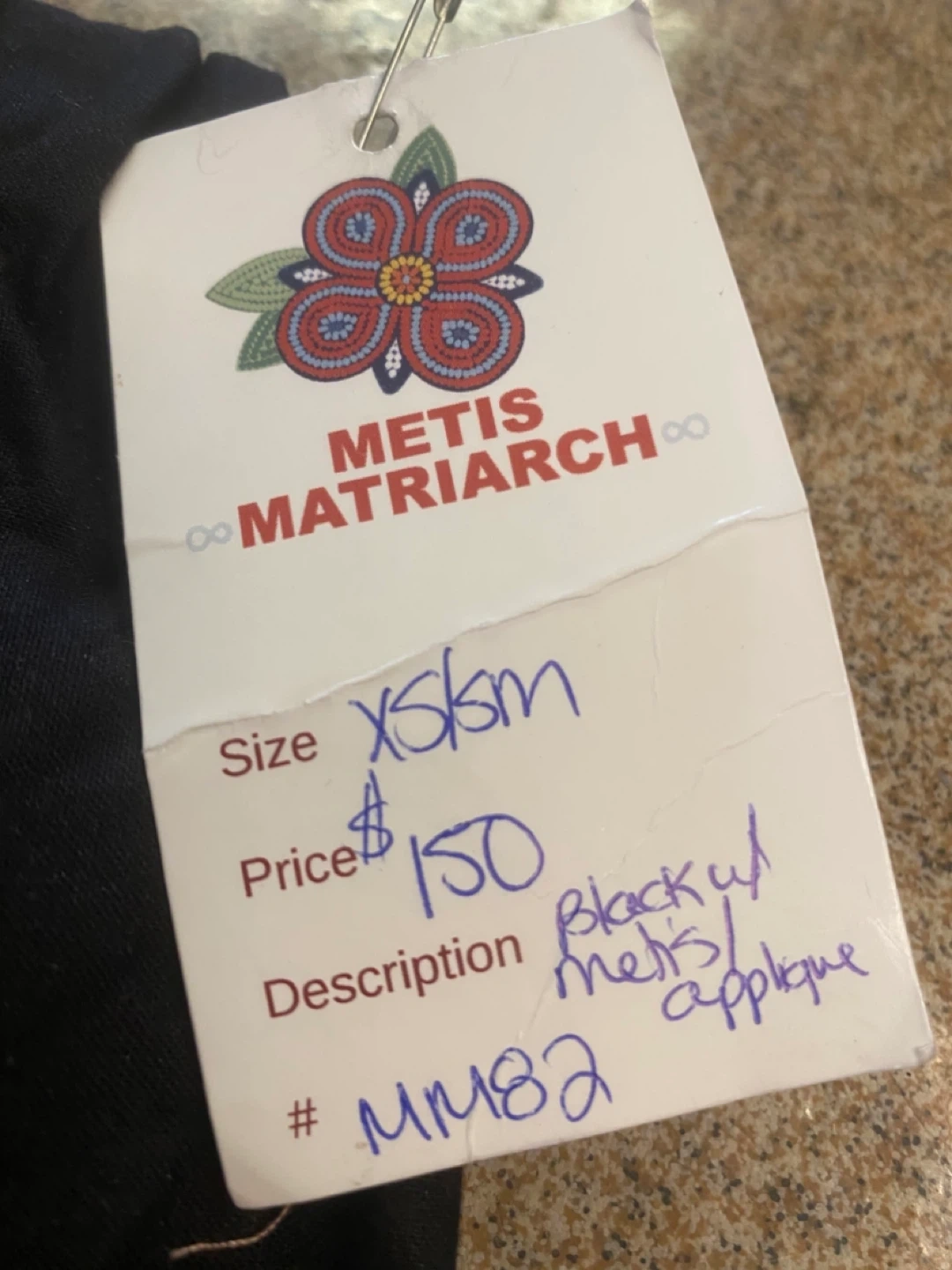 Authentic-style Métis matriarch dress, brand new with price tag attached. Features black fabric with traditional Métis appliqué detailing, perfect for ceremonial or formal occasions. Size XS/SM, item #MM82.