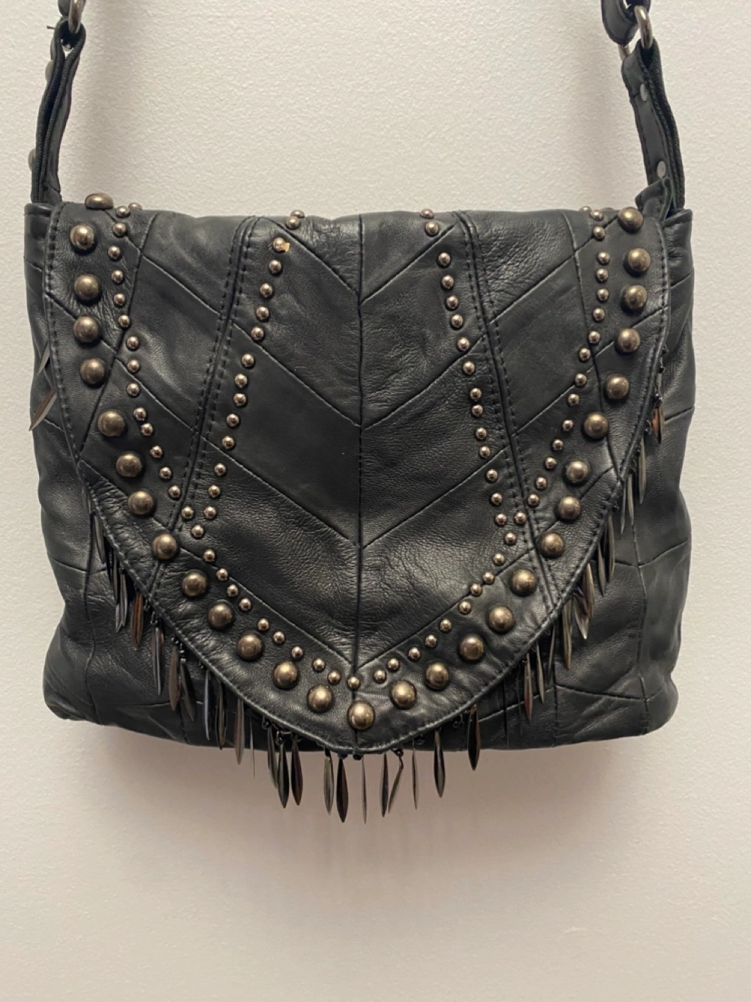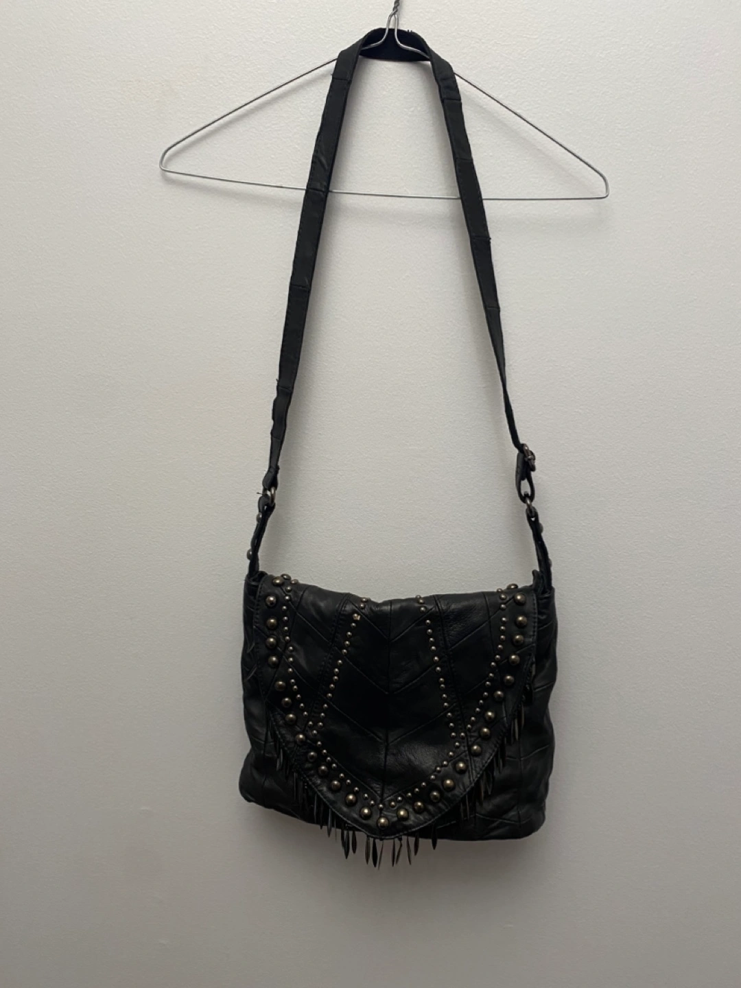 This is a stylish black pu leather crossbody bag with studded detailing. It's perfect for adding a bit of edge to any outfit. The bag is in great condition and ready for a new owner!
