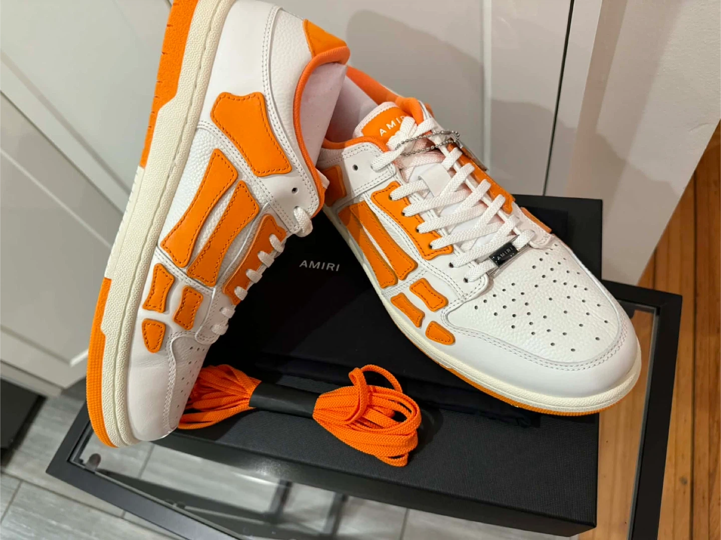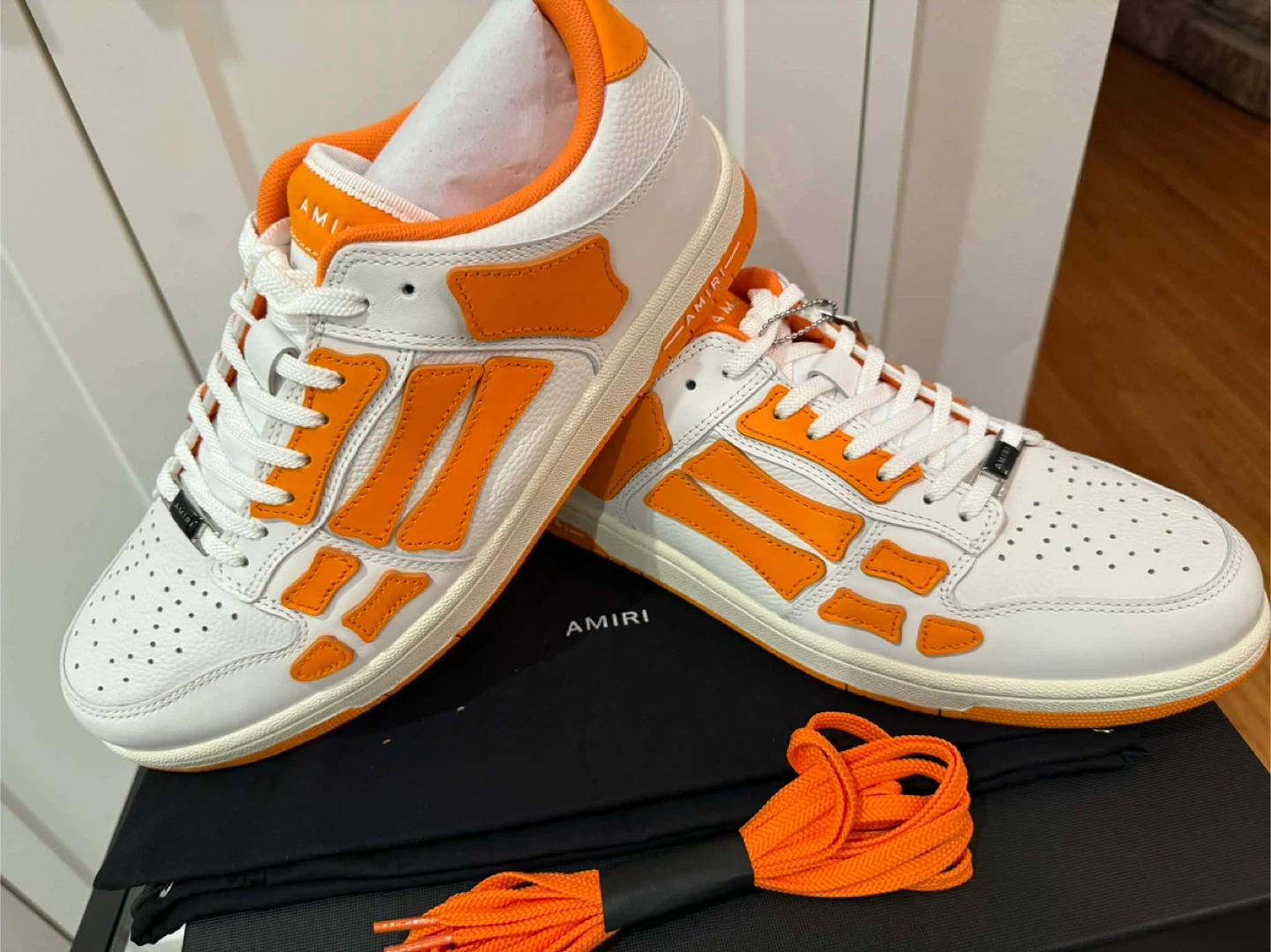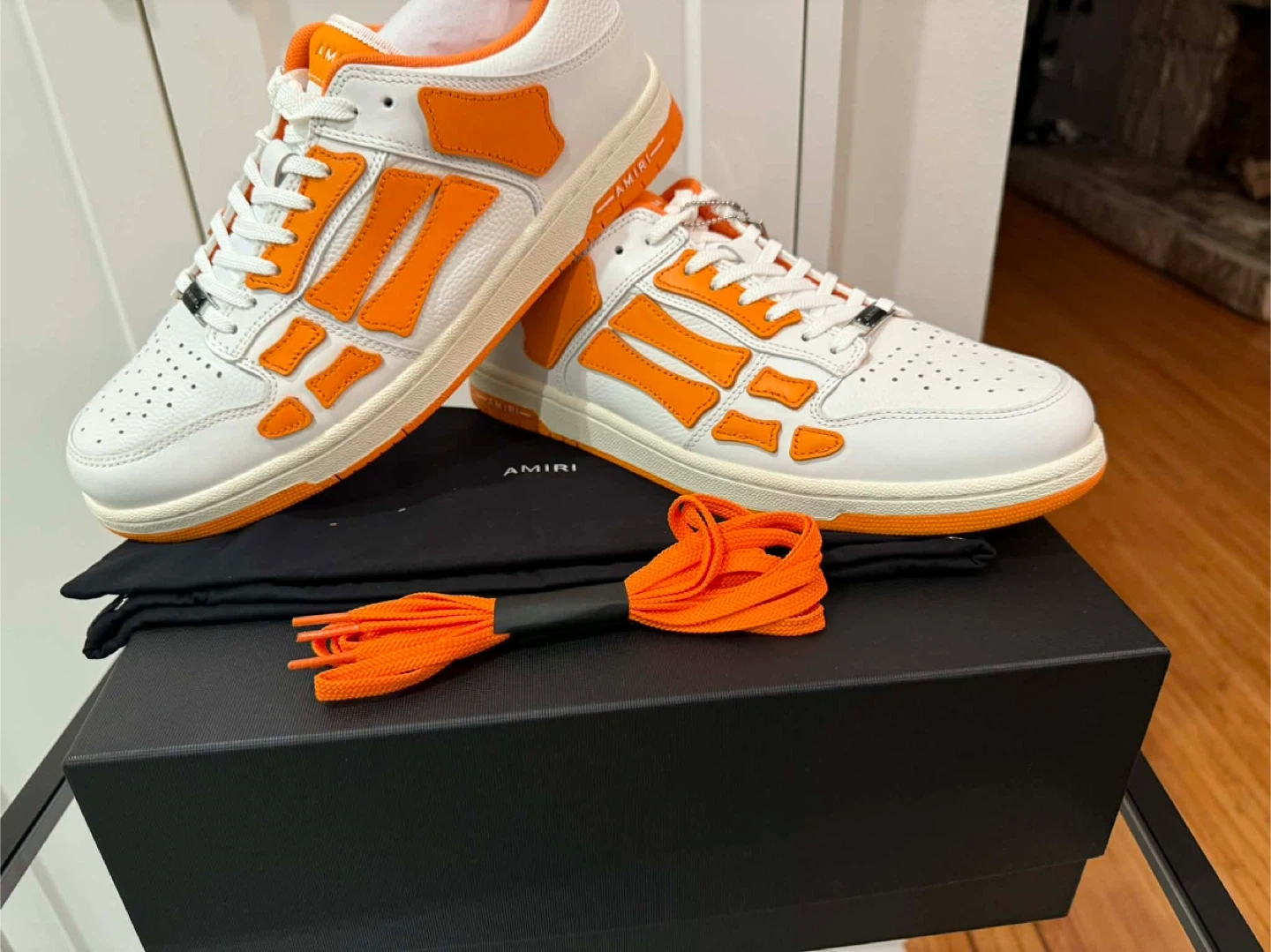 Selling a pair of Amiri Skel Low sneakers in white and orange.