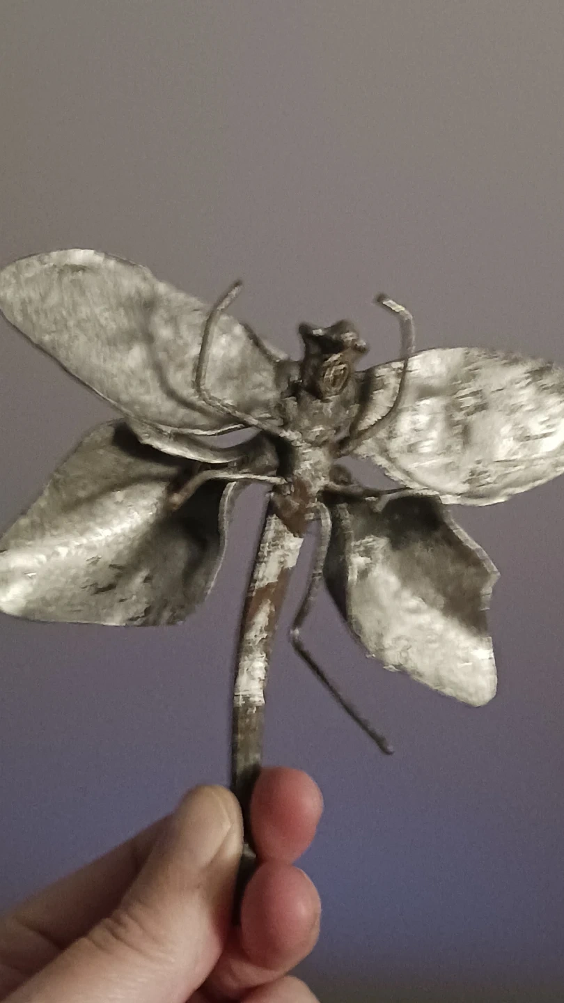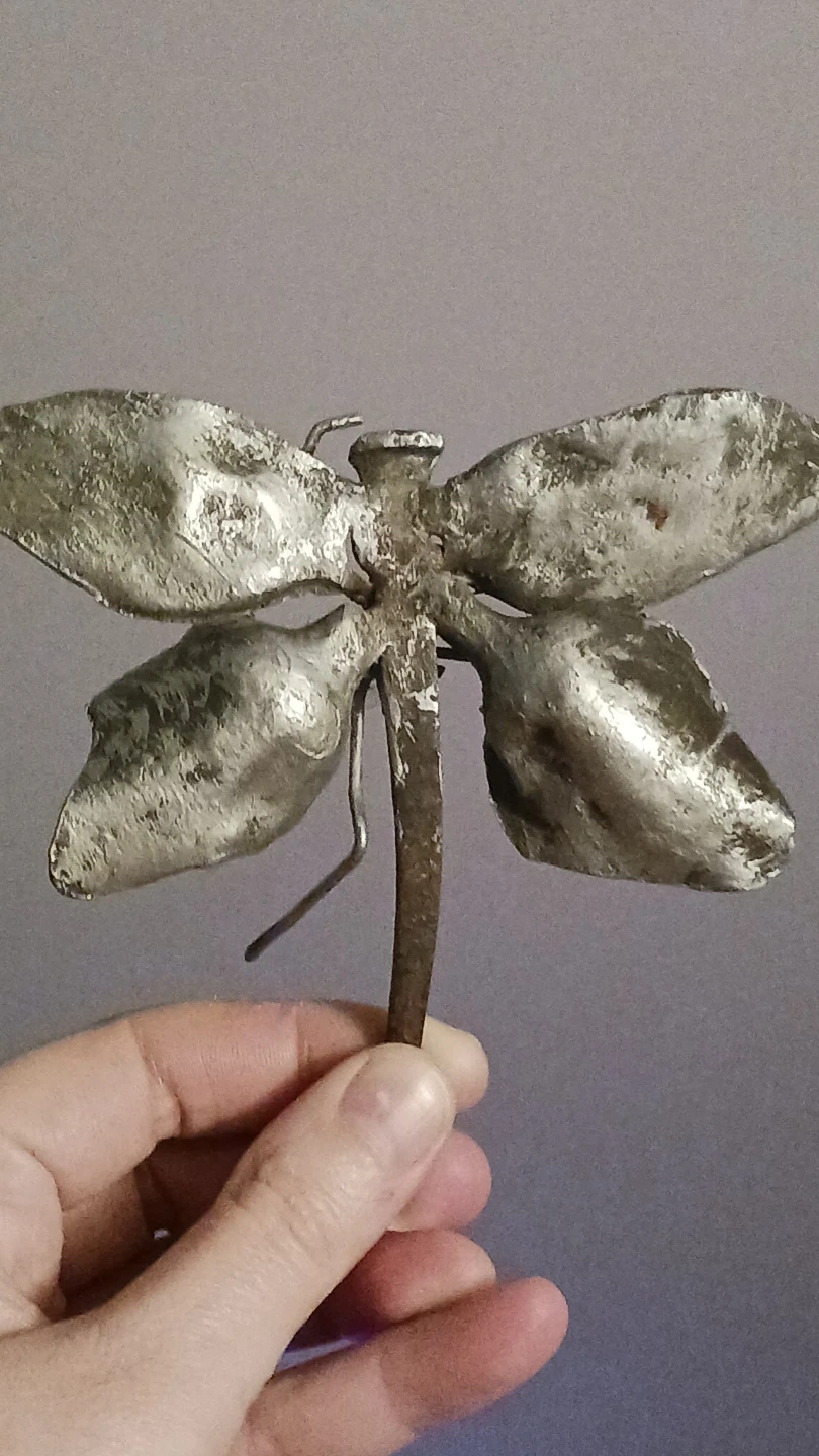 This is a unique metal dragonfly art piece. It's made from a large nail and other metal! Stand in a flower pot or just sit it on a shelf, it will be beautiful anywhere! It's got a rustic, handcrafted look. Perfect for adding a bit of character to your space!
