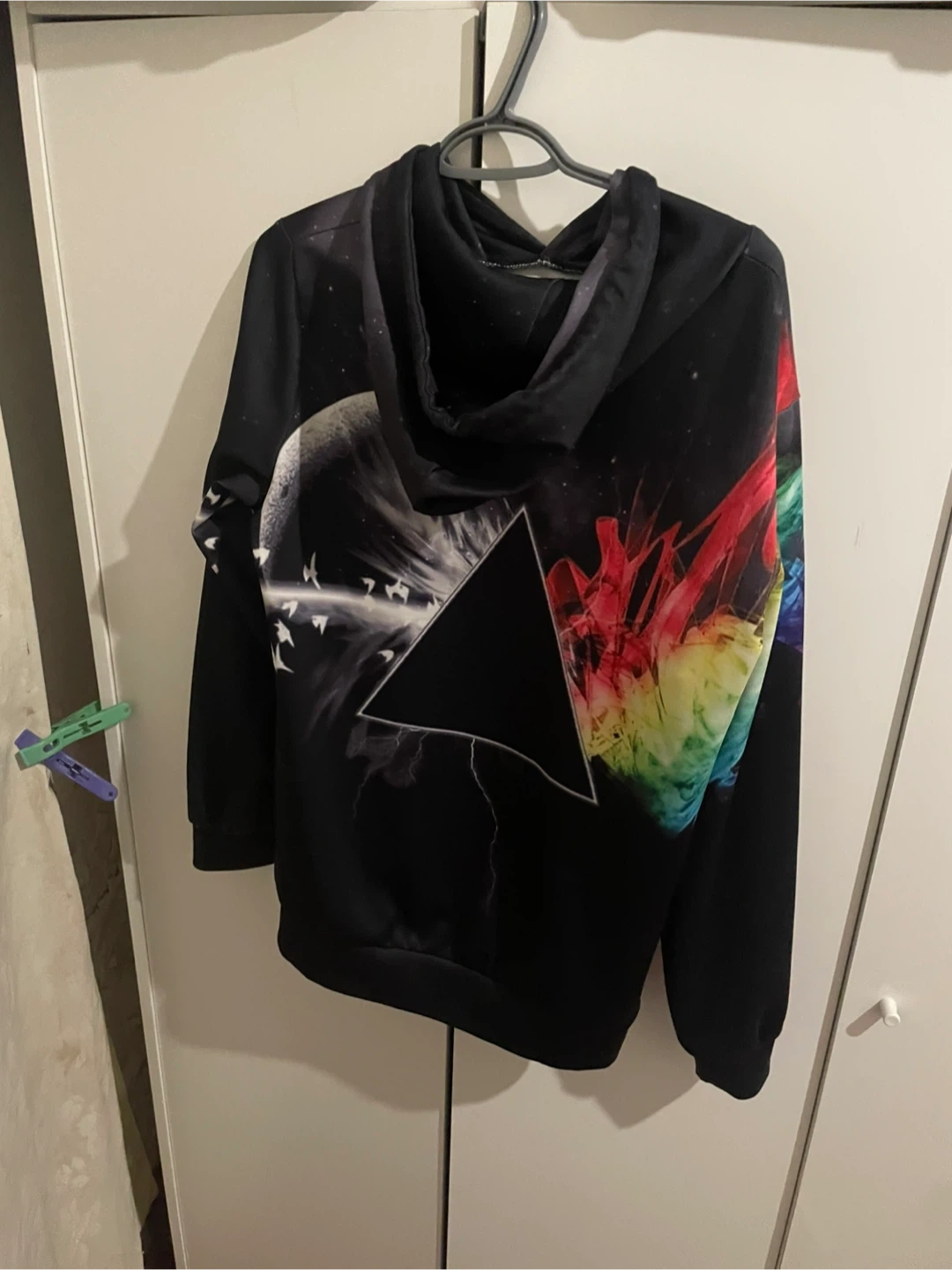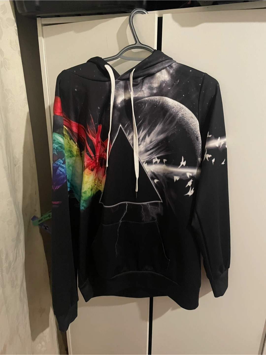 Selling a hoodie with the Dark Side of the Moon design. It's in great condition and features a vibrant print on a black background.