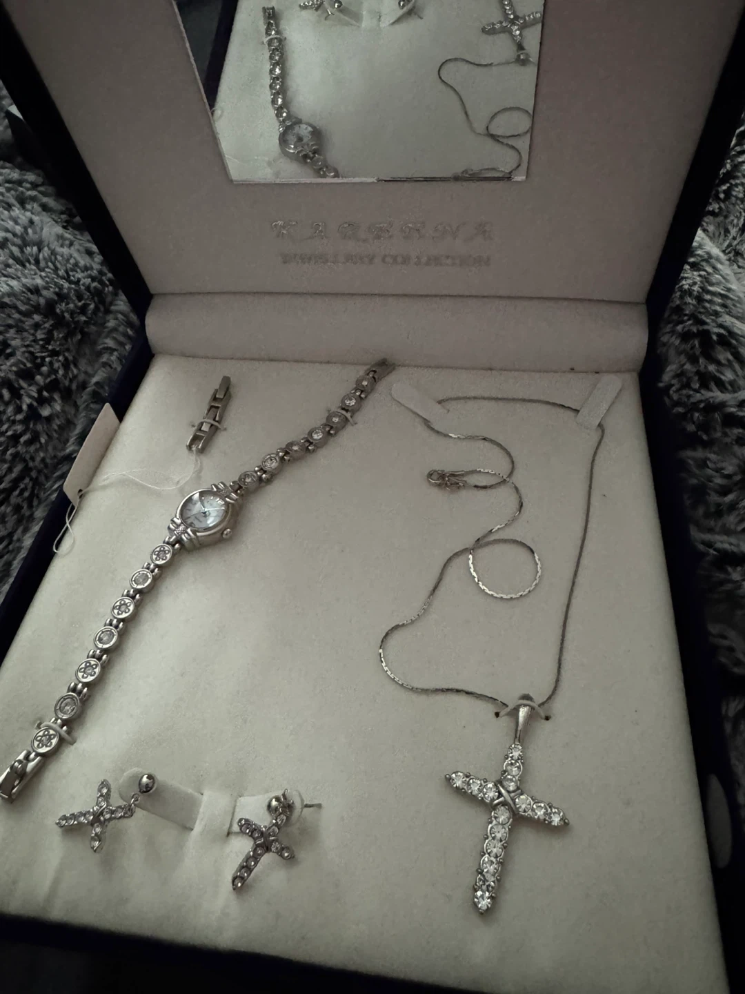 Selling a beautiful Kareena jewelry collection set. It includes a watch, a necklace and earrings. The set comes with the original box.