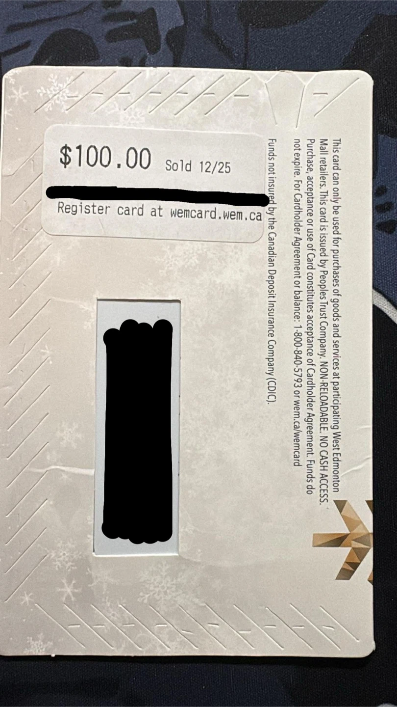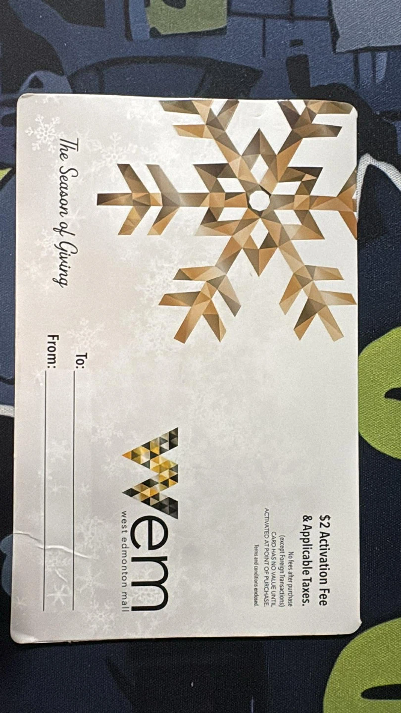 1 / 21 / 2Buy & SellWest Edmonton Mall $100 giftcardWest Edmonton Mall $100 giftcard$85Selling a West Edmonton Mall giftcard with a value of $100. Great for shopping at various stores within the mall!ConditionNewBrandWest Edmonton MallWHERE TO MEETKingsway MallView MapSELLERverifiedAnnaKlarvatten762 reviews4 chats·1 favorites·86 viewsSEND CHAT TO SELLERHi Anna! I’m interested in your listing.Hi Anna! I’m interested in your listing.Get the Karrot app to chatSign In to chat