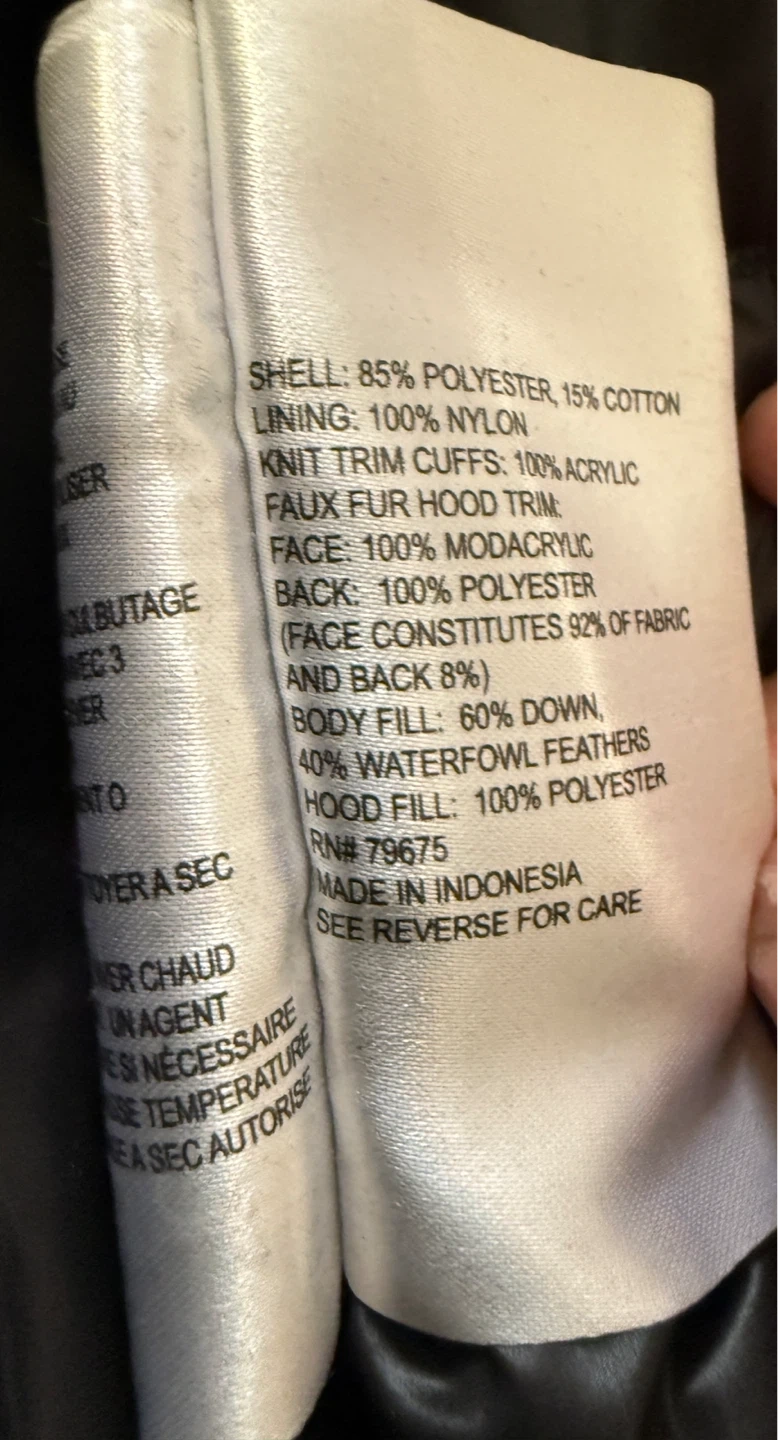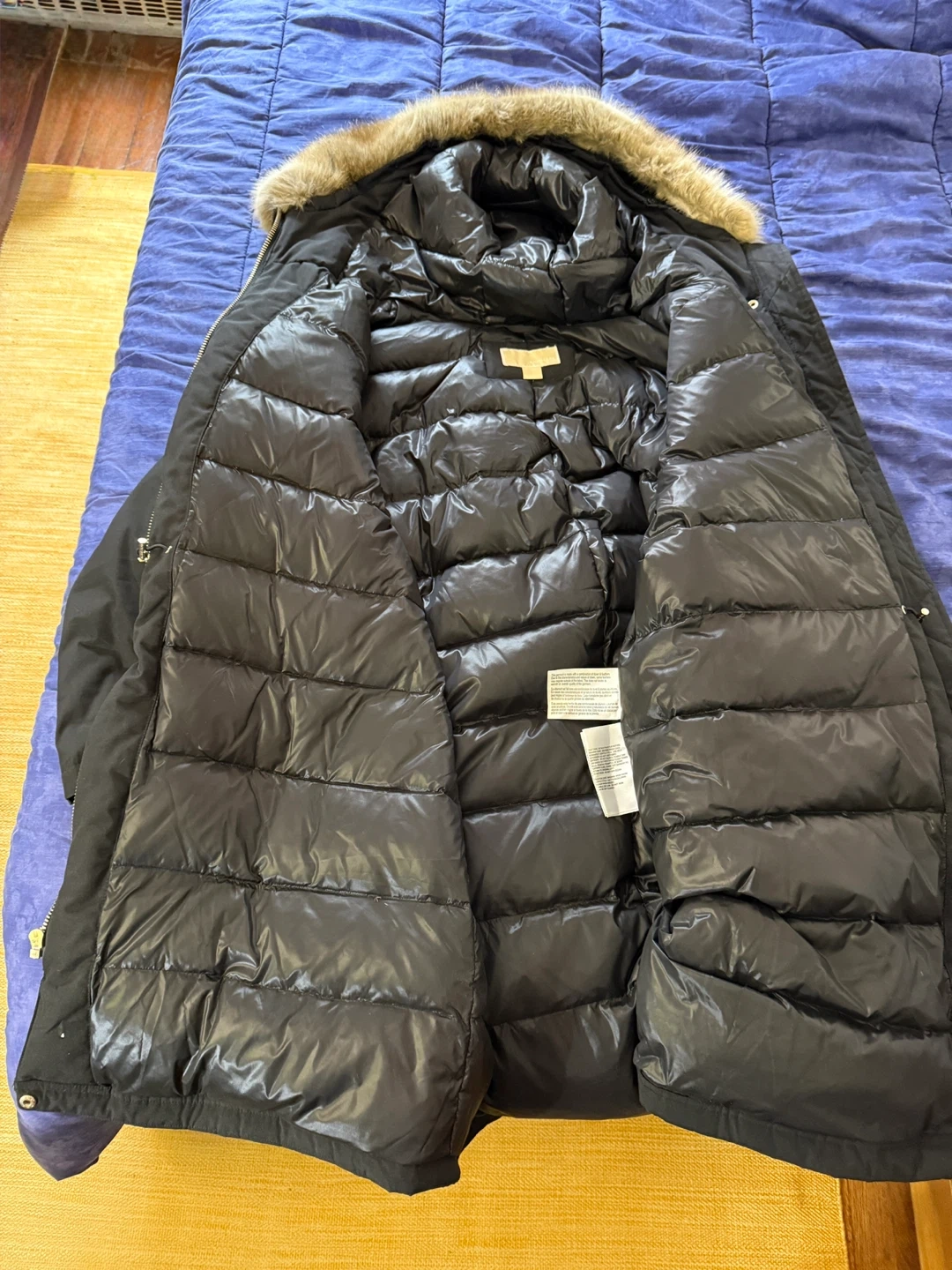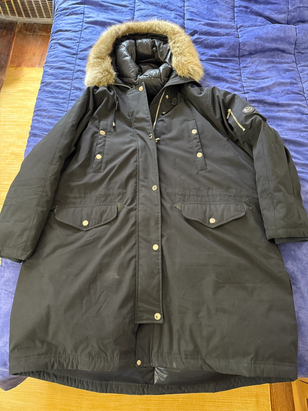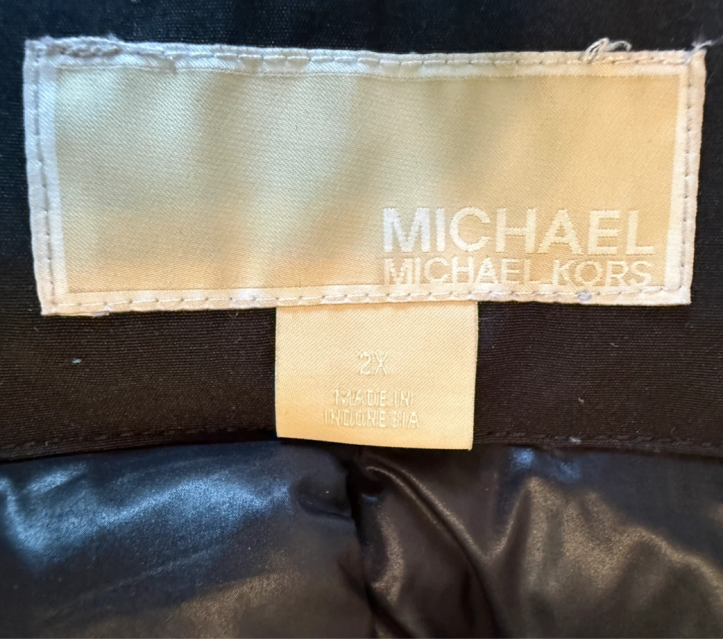 Selling a Michael Michael Kors coat in size 2X. It's a black down and feather coat with a faux fur hood trim. The shell is made of 85% polyester and 15% cotton, while the lining is 100% nylon. The knit trim cuffs are 100% acrylic, and the face of the hood trim is 100% modacrylic. The body fill is 60% down and 40% waterfowl feathers.