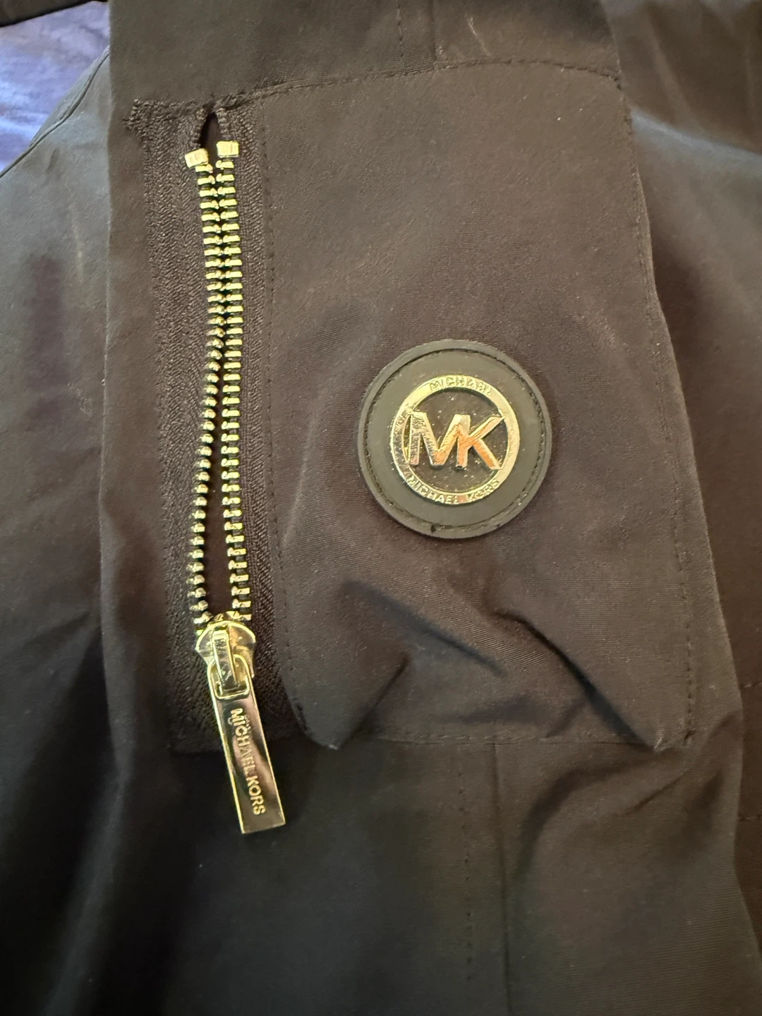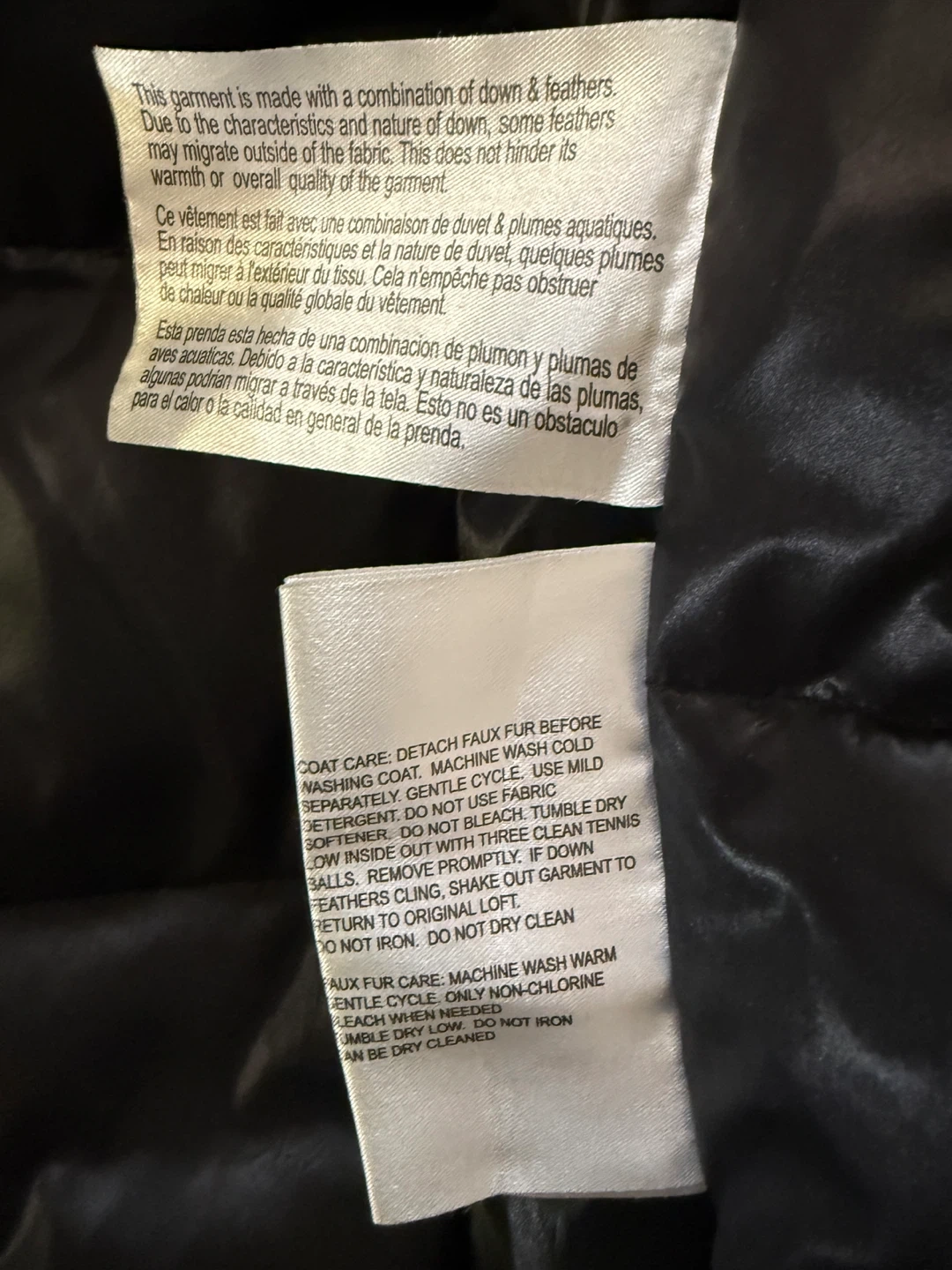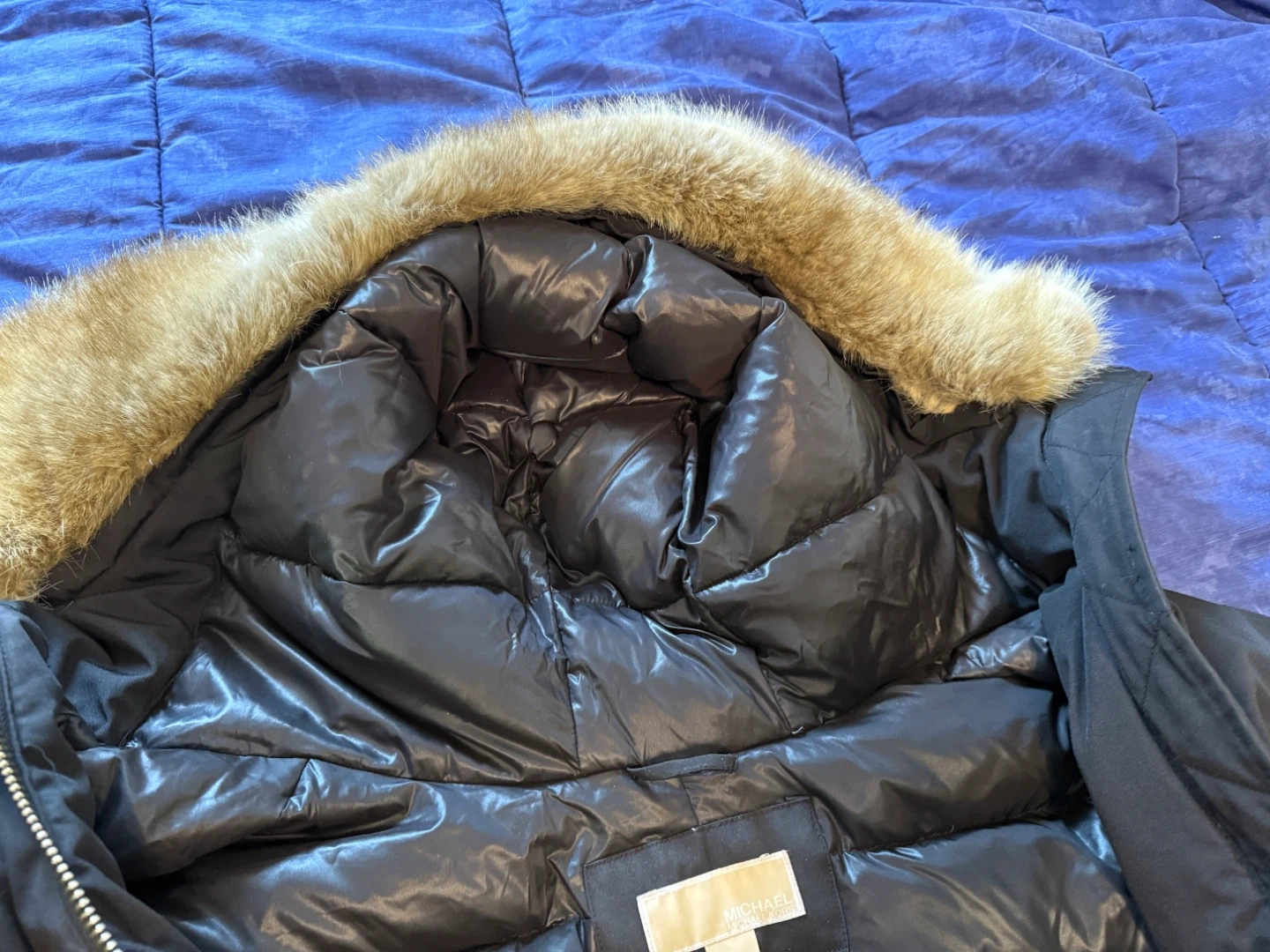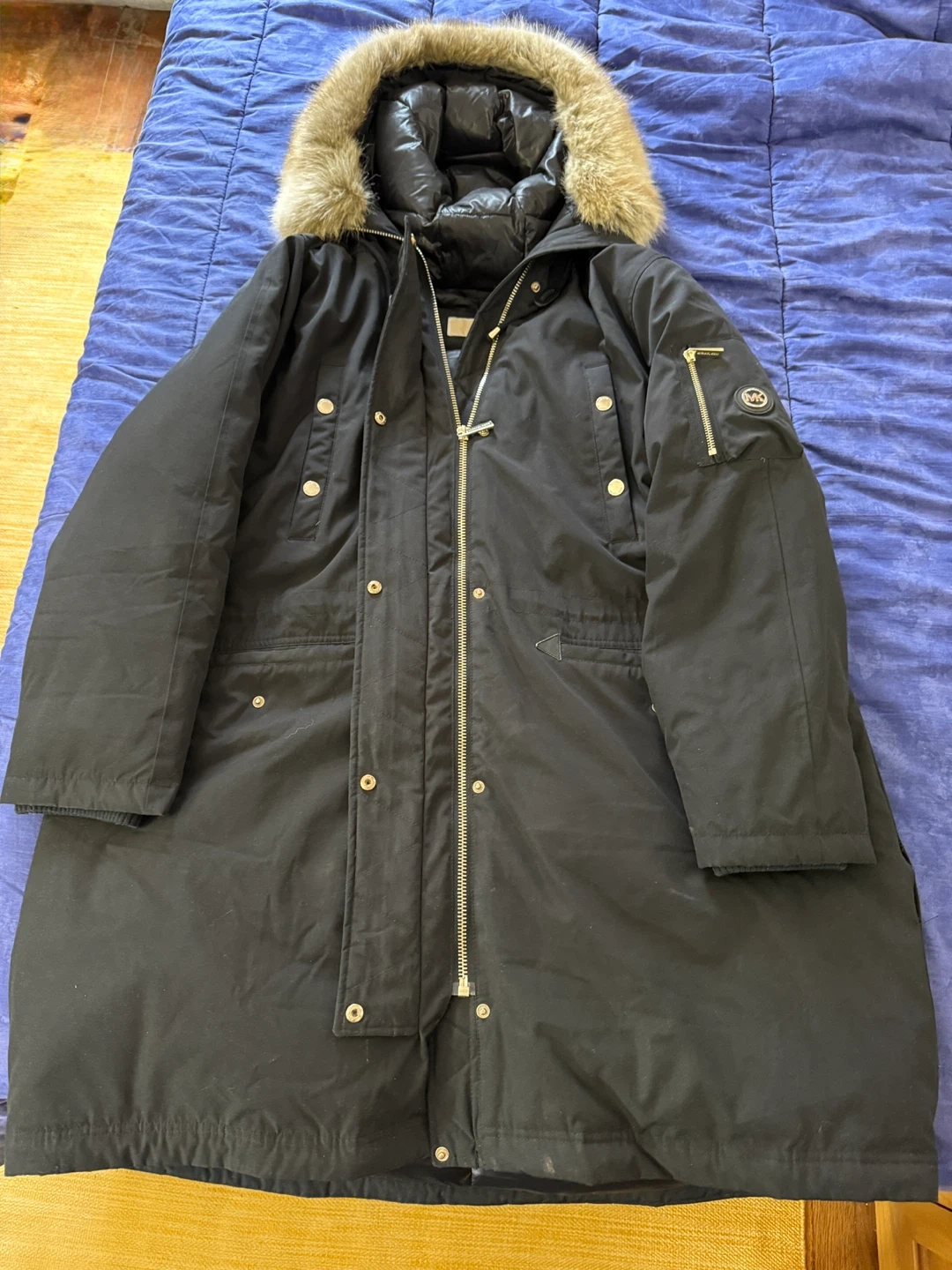 Selling a Michael Michael Kors coat in size 2X. It's a black down and feather coat with a faux fur hood trim. The shell is made of 85% polyester and 15% cotton, while the lining is 100% nylon. The knit trim cuffs are 100% acrylic, and the face of the hood trim is 100% modacrylic. The body fill is 60% down and 40% waterfowl feathers.