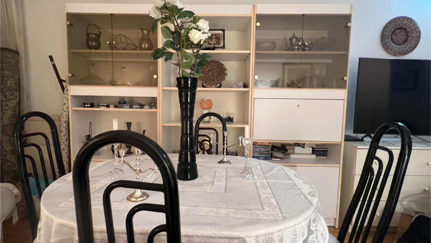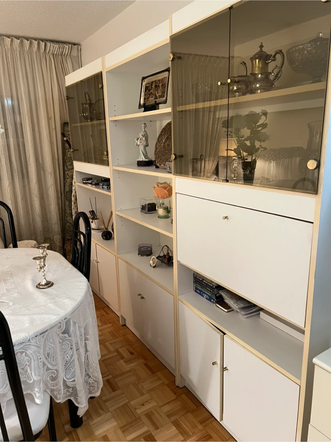 Selling a wall unit with glass doors. It's in great condition and would be a lovely addition to any living space. It has lots of storage space for books, decorative items, or whatever you need to keep organized