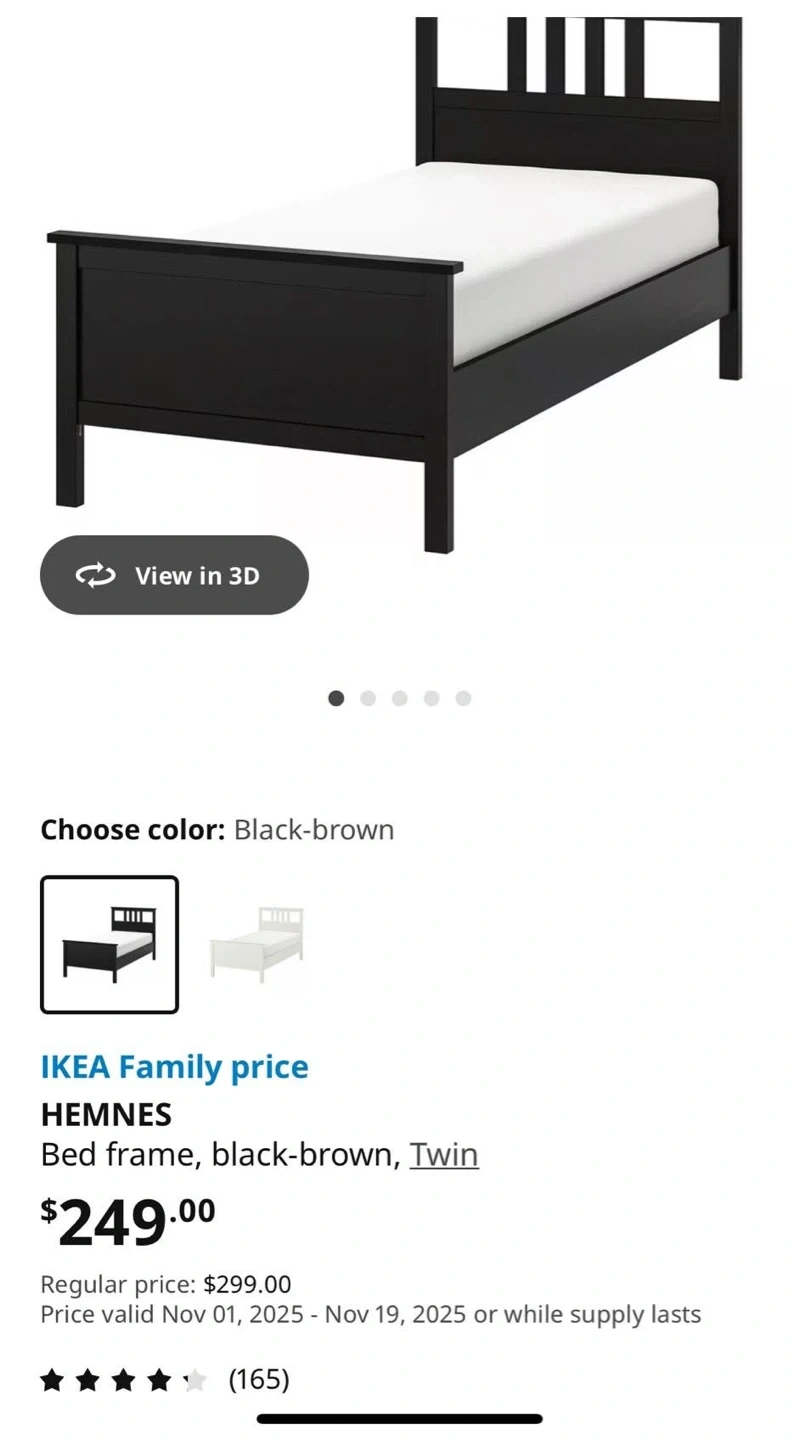 Selling an IKEA Hemnes bed frame in black-brown. It's a twin size, perfect for a smaller room or a kid's bedroom. Originally priced at 249, but available now for a great price!